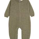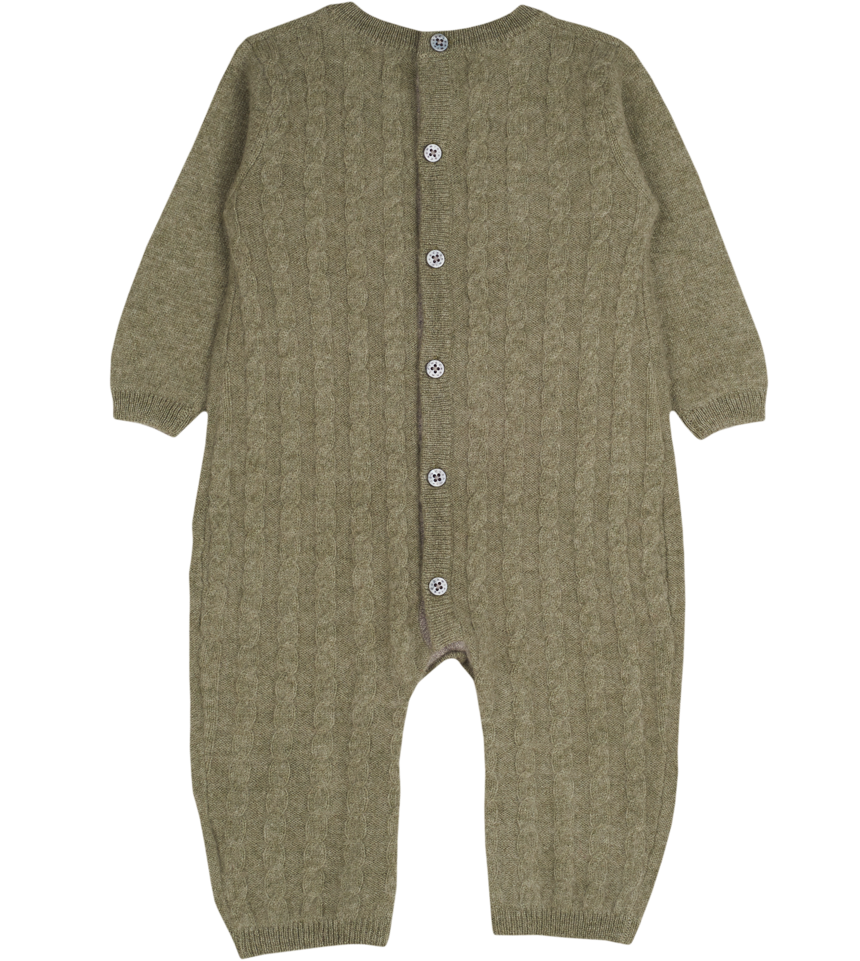 The design features a cable knit panel on the chest and back, adding texture and timeless style. Thoughtful details include contrasting internal trims and full button fastenings along the back and under the legs for easy changing. Finished with Cashmirino’s signature buttons, this romper is both practical and elegant.