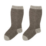 A pair of 100% cashmere socks featuring a contrasting heel, toe and hem. Ideal for keeping little feet warm.