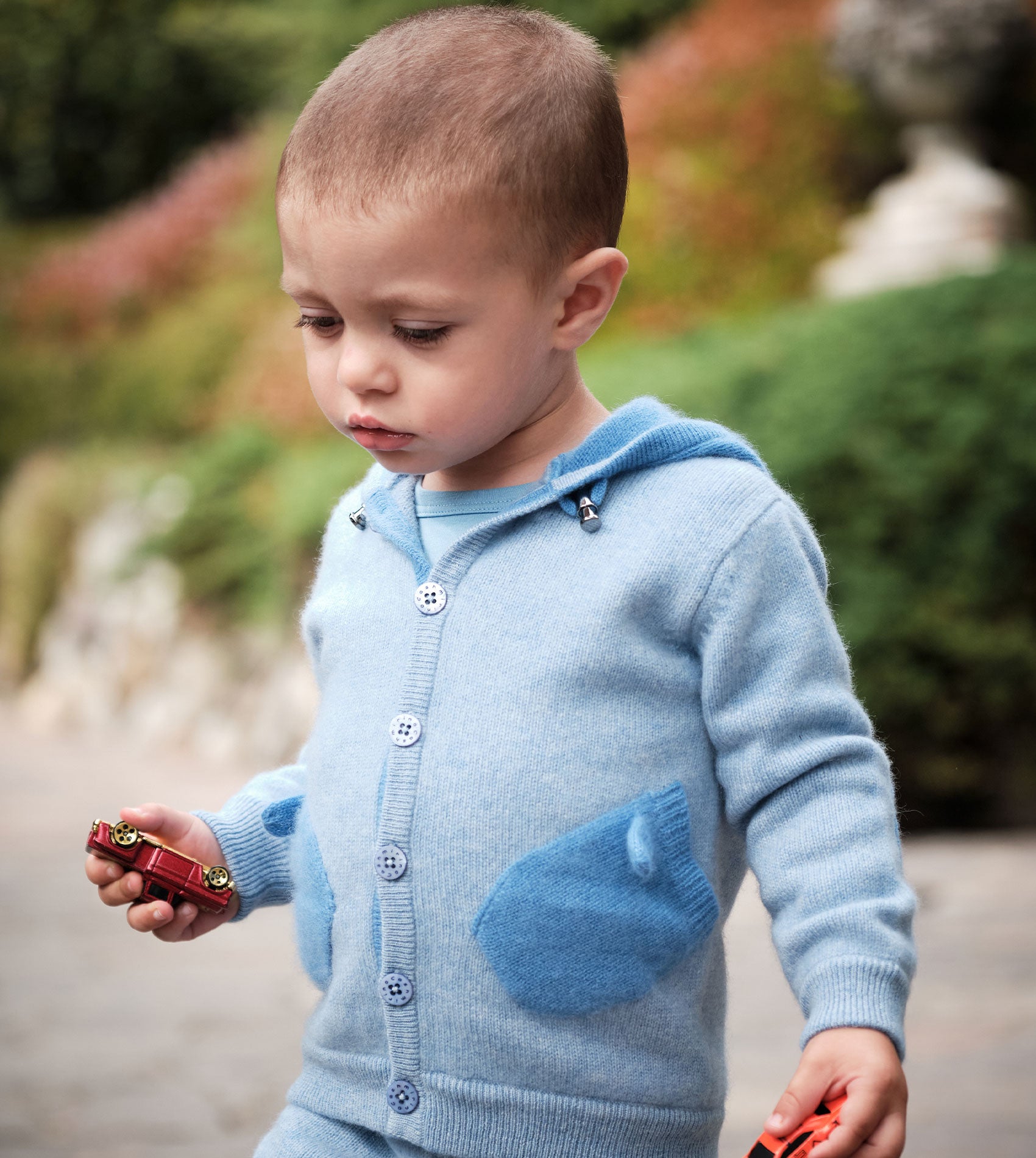 Made from 100% cashmere with a sweet pom-pom hood, it’s cosy, charming, and ready for all his playful adventures.