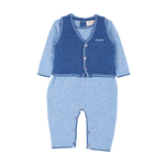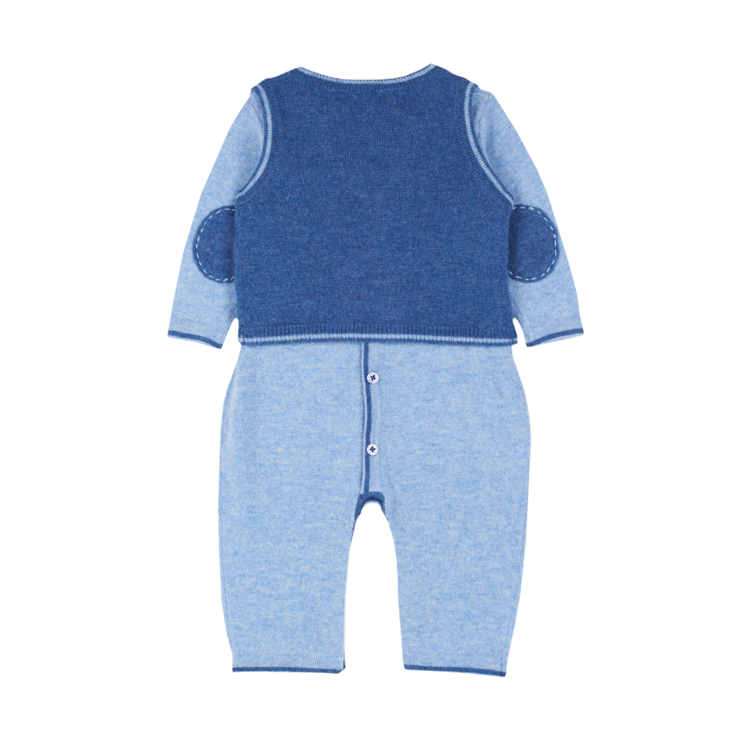 A complete set featuring a long sleeve romper featuring contrasting border detail and elbow patches which can be layered with a sleeveless cardigan with contrasting border detail. Made from 100% cashmere.