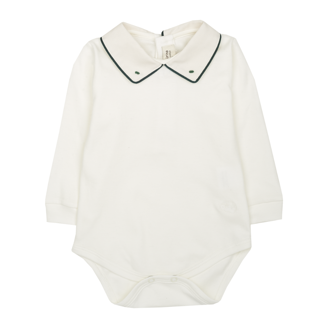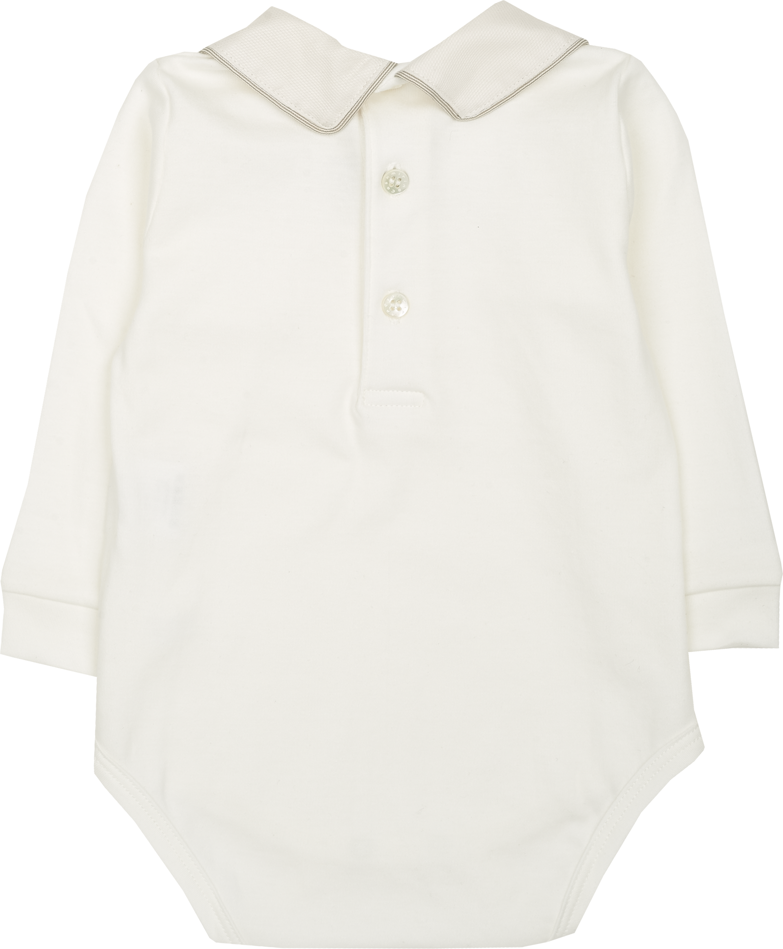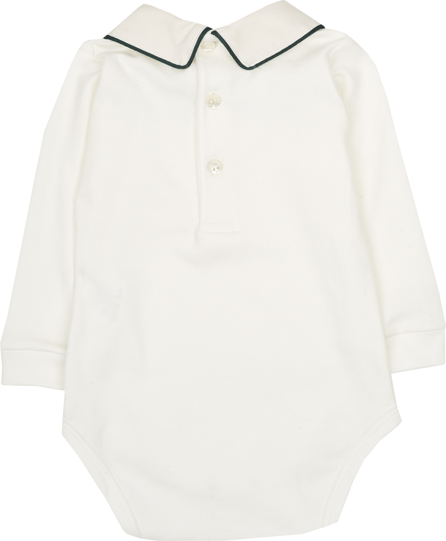 A baby boy long sleeve bodysuit made from luxuriously 100% soft Pima cotton featuring a contrasting classic collar with trim details. Popper and button fastening.
