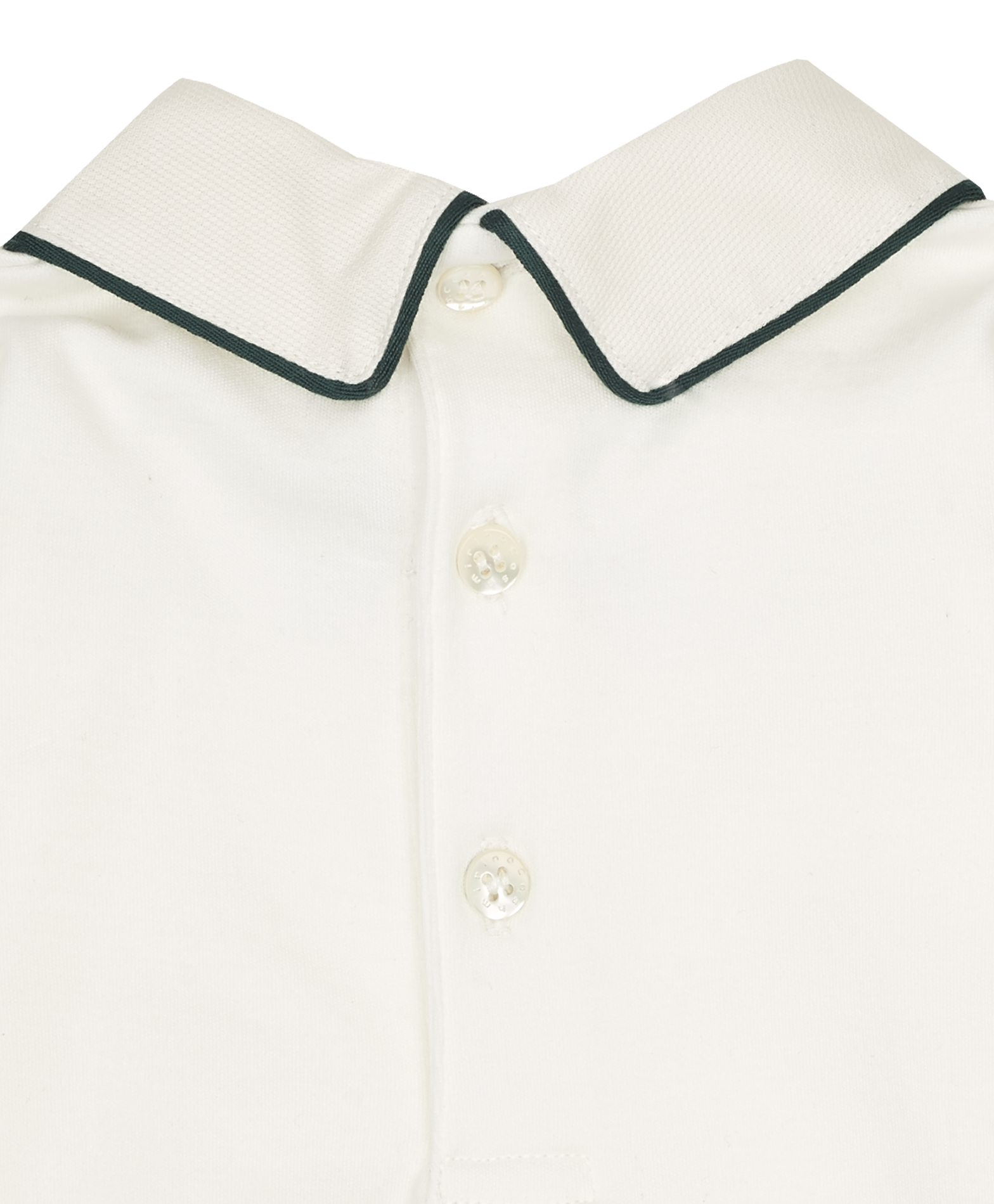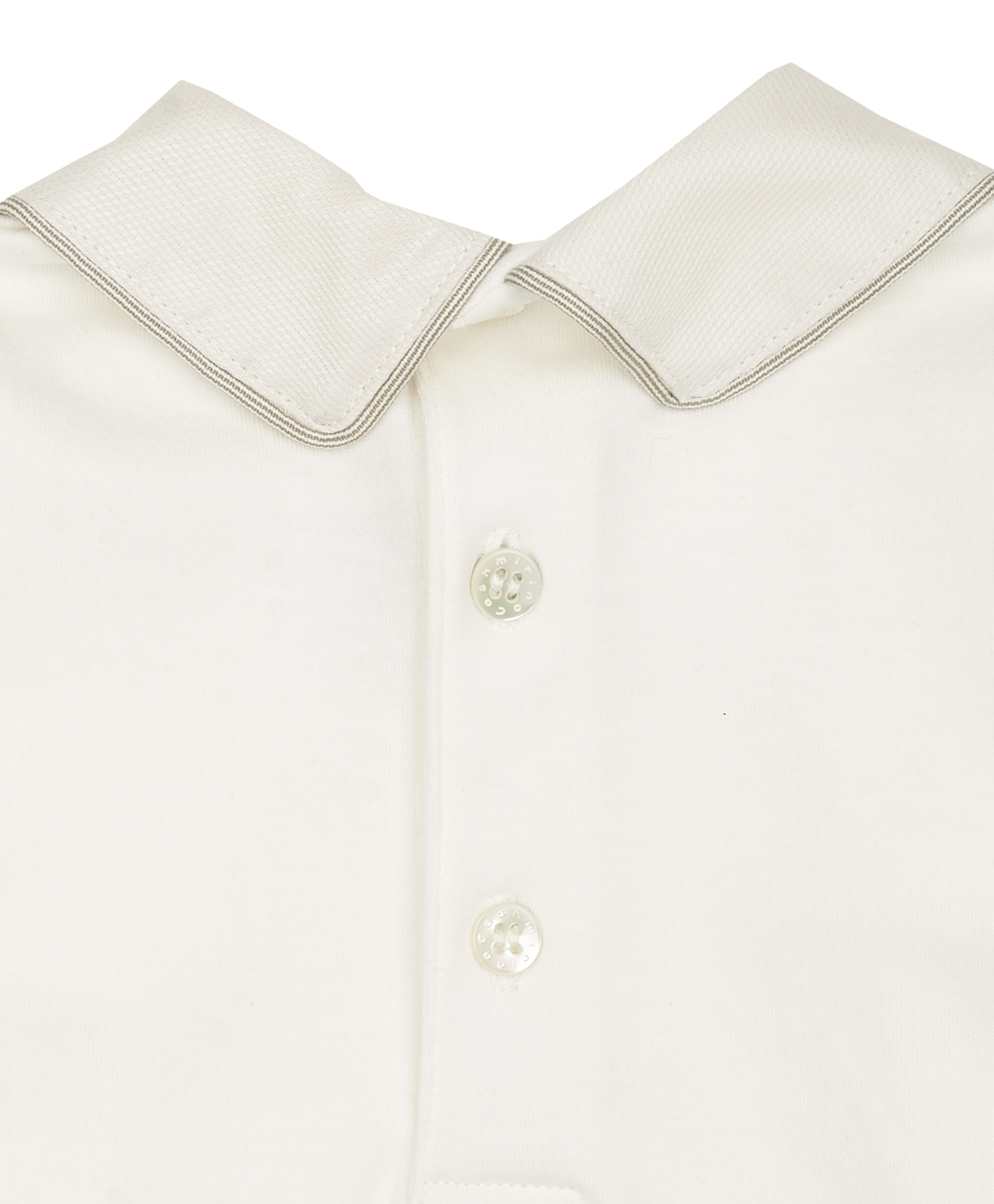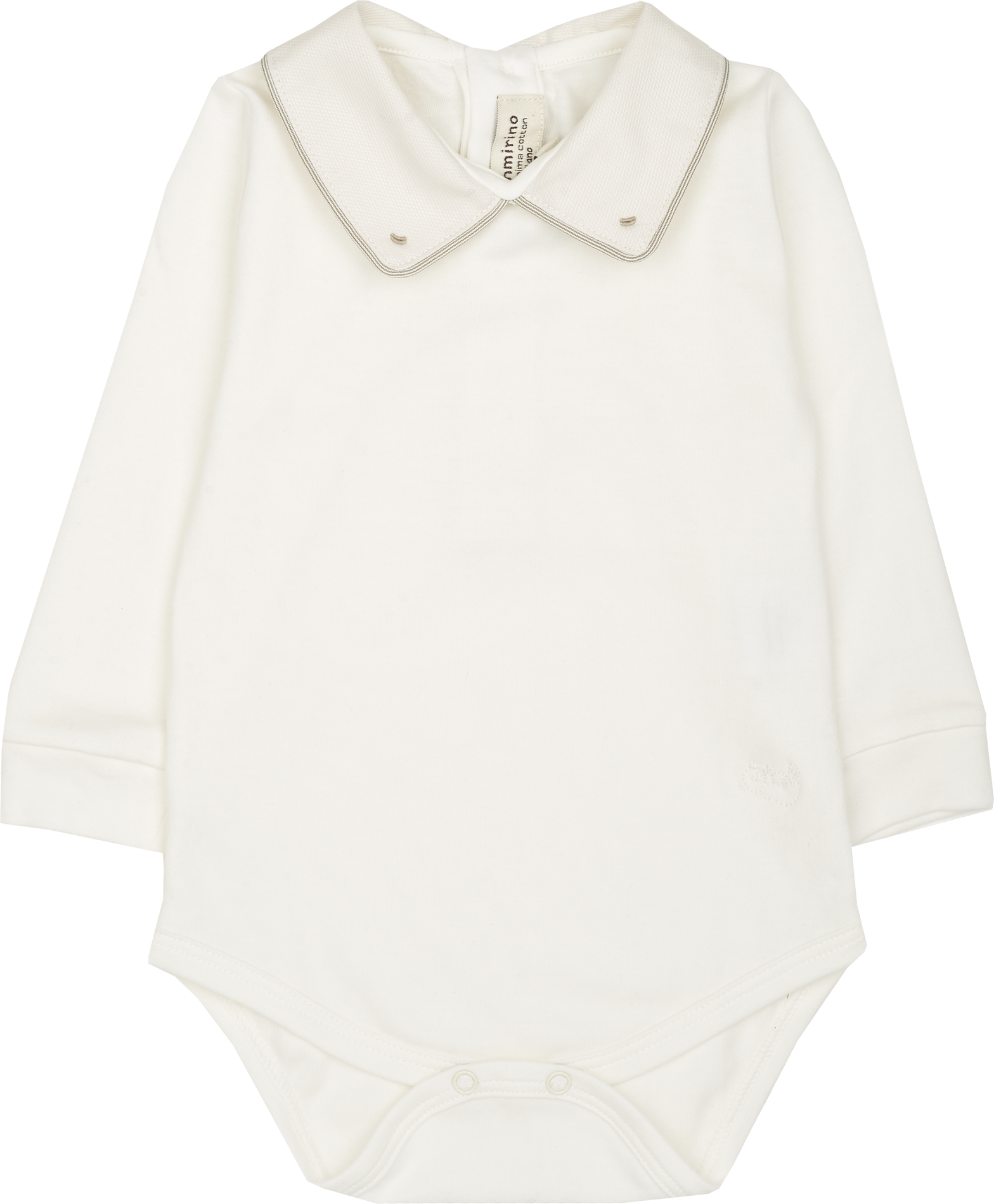 A baby boy long sleeve bodysuit made from luxuriously 100% soft Pima cotton featuring a contrasting classic collar with trim details. Popper and button fastening.