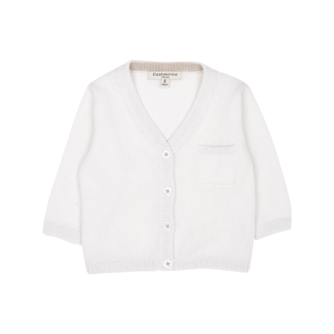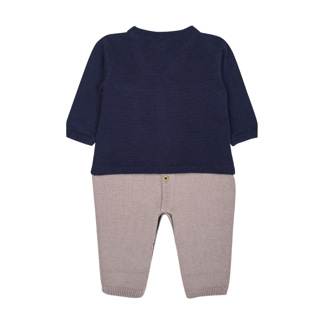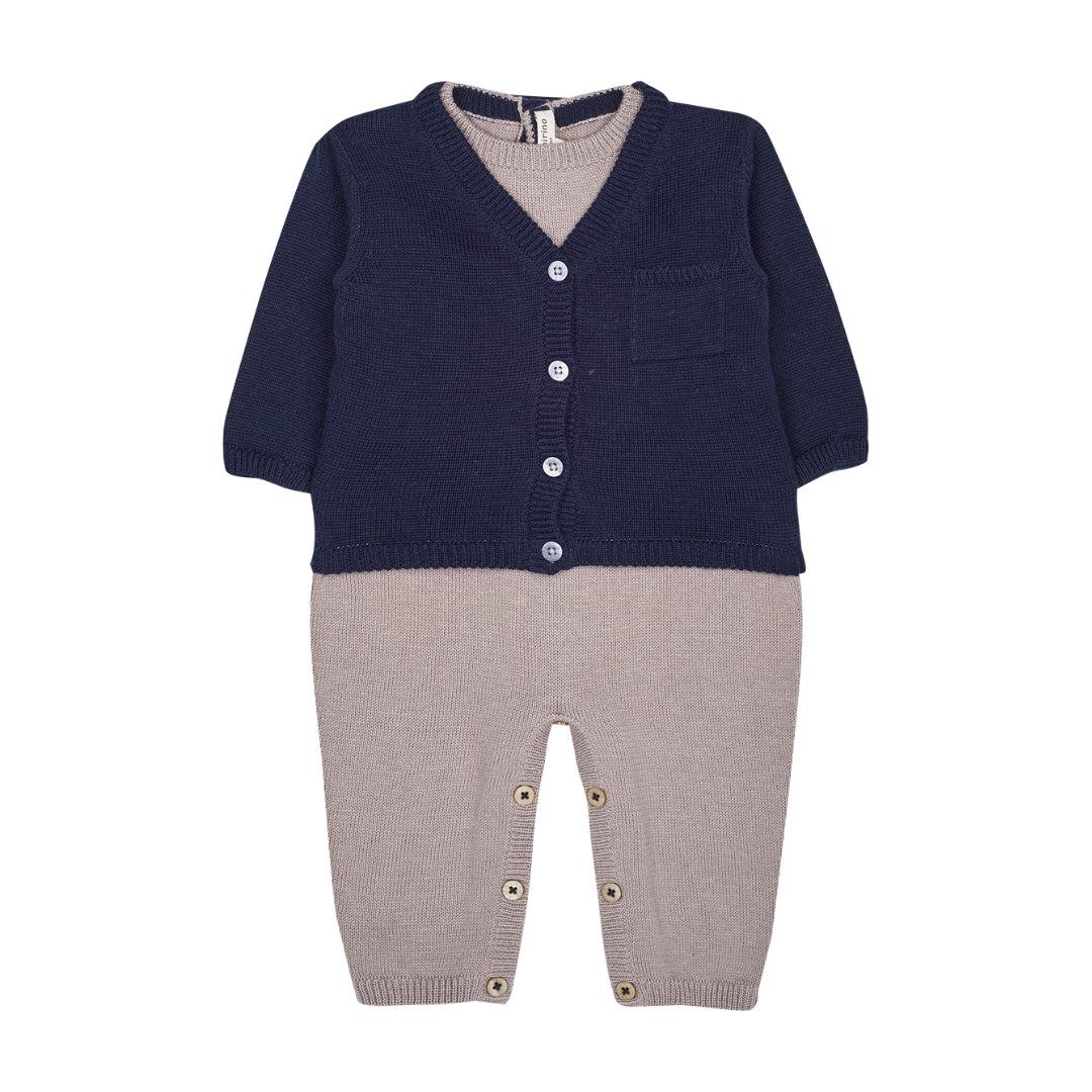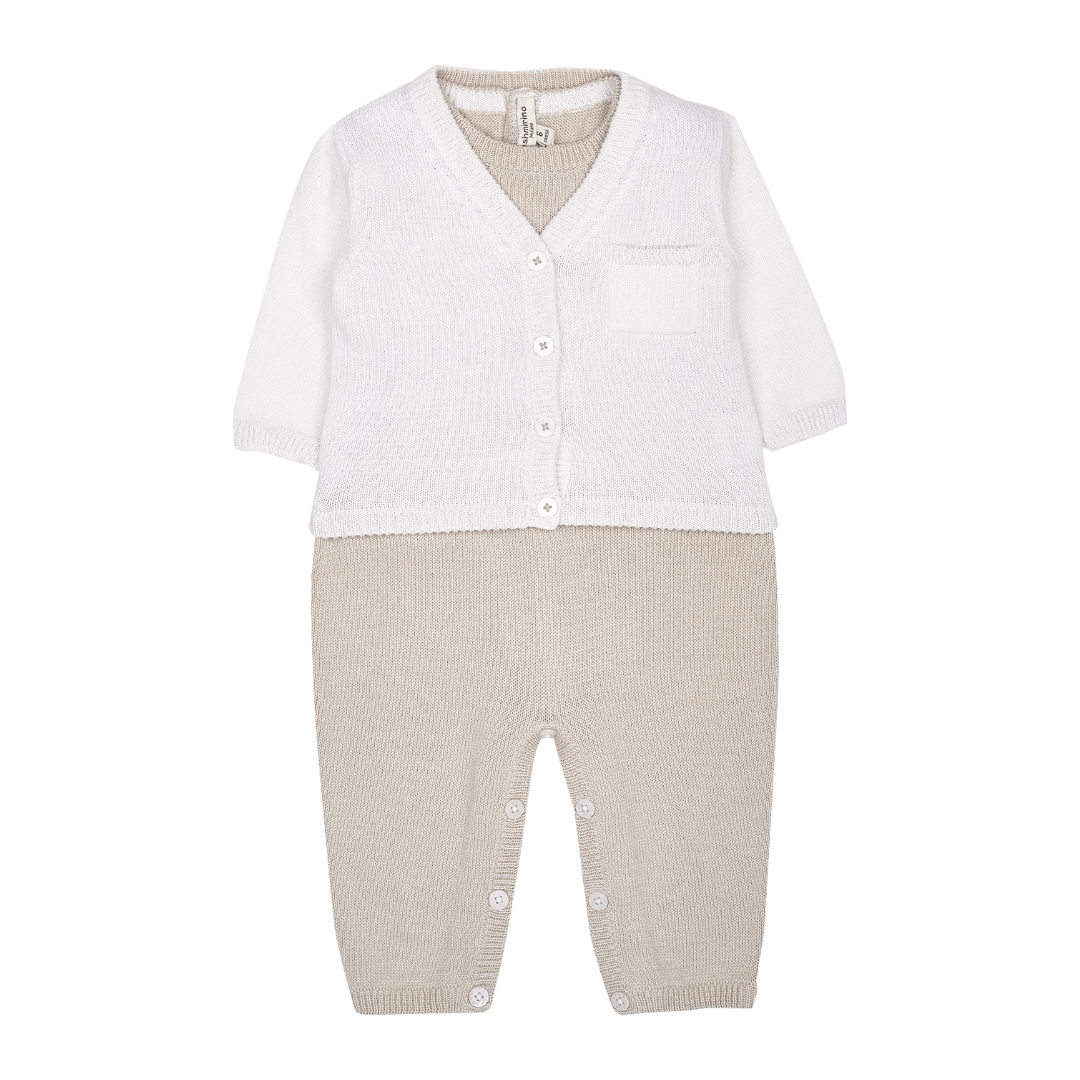 This elegant cotton set for baby boy is ideal for the spring season. The sleeveless onesie can be worn with a pima cotton bodysuit, and for the cooler days, the V-cardigan is just what you need to layer up. Adding interest to this two-piece baby set, is the internal contrast along the edges and our signature Cashmirino buttons. Designed to be the ideal set for travelling in great comfort while looking elegant.