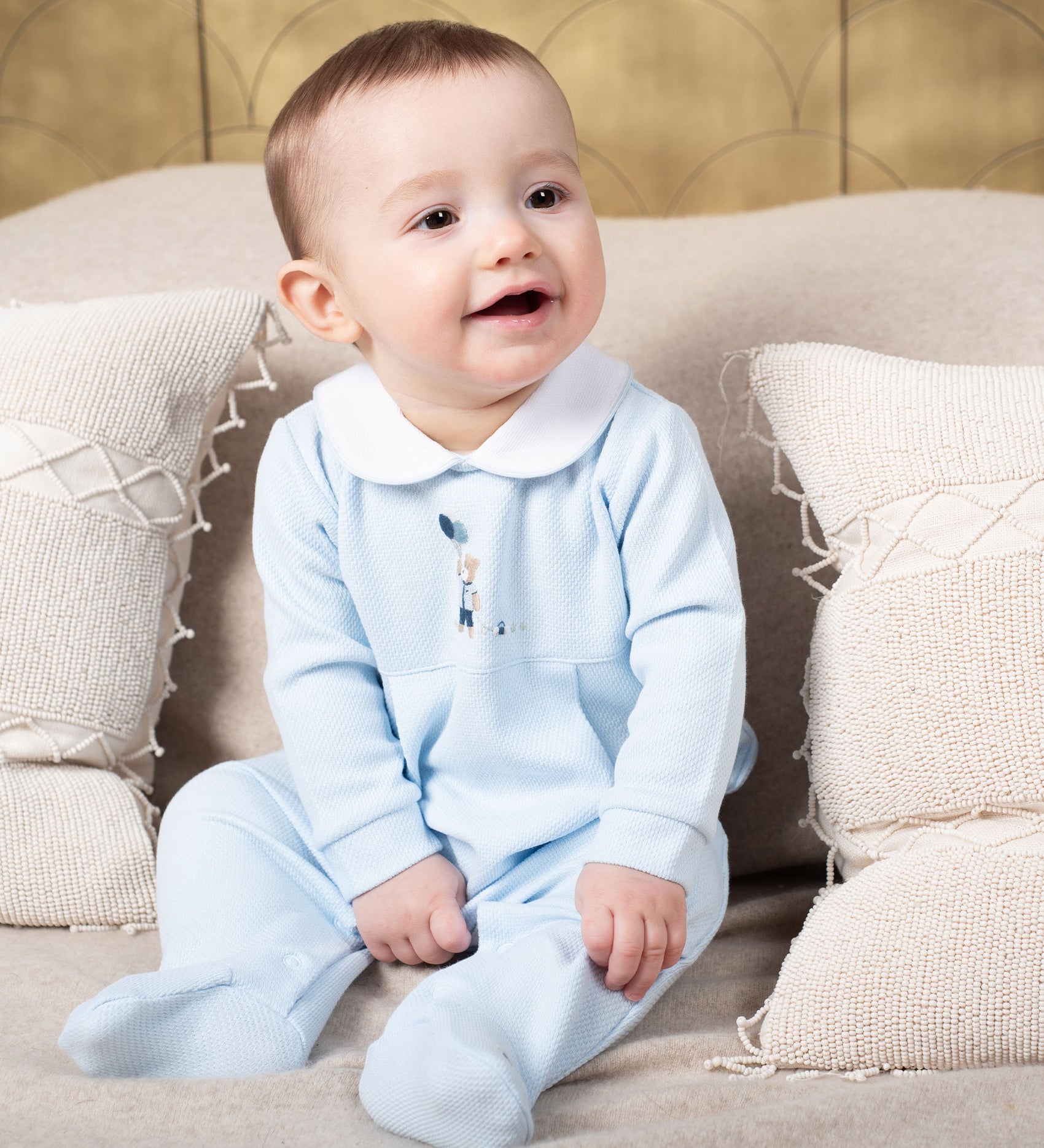 For extra charm, tiny feet are adorned with a lovingly embroidered balloon and car, adding playful touches that spark imagination. The contrasting Peter Pan collar with delicate piping adds a classic, timeless style, while popper fastenings on the legs and buttoned back make dressing and changing effortless.