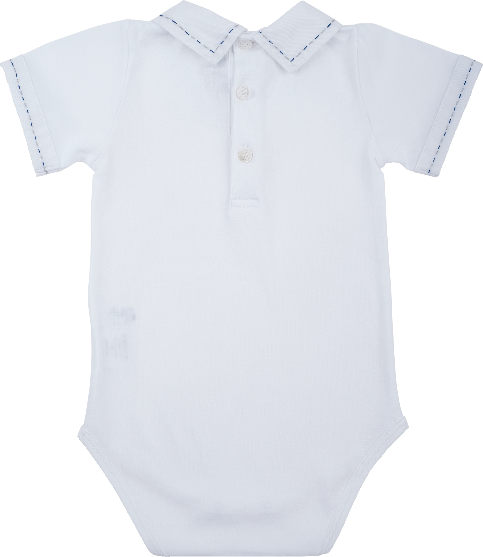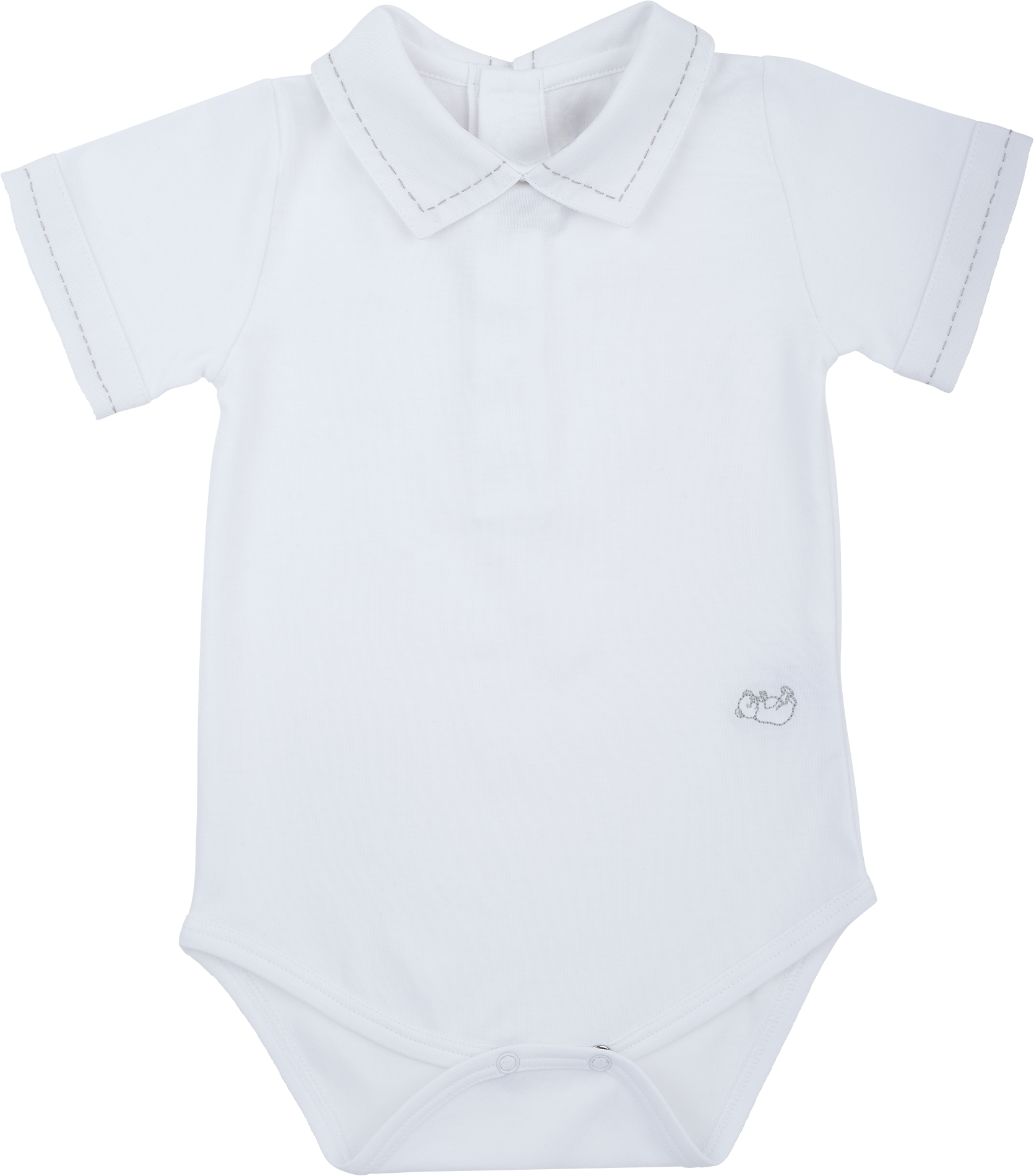 A timeless wardrobe staple for baby boys, crafted in luxuriously soft 100% Pima cotton—renowned for its natural breathability and gentle feel on delicate skin. This short-sleeved bodysuit features a classic pointed flat collar, subtly accented with elegant monocolour stitching and our signature Cashmirino bear embroidery for a refined touch of character.