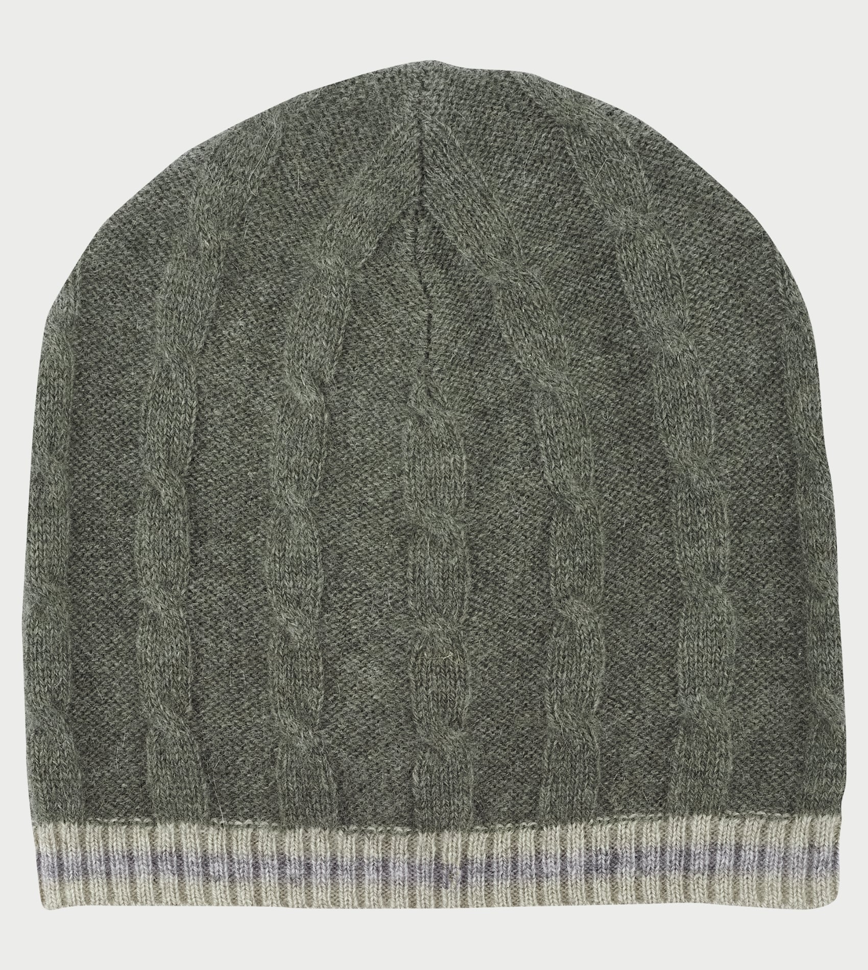 A stylish cable knit hat made from 100% cashmere, featuring a contrasting stripe border.
