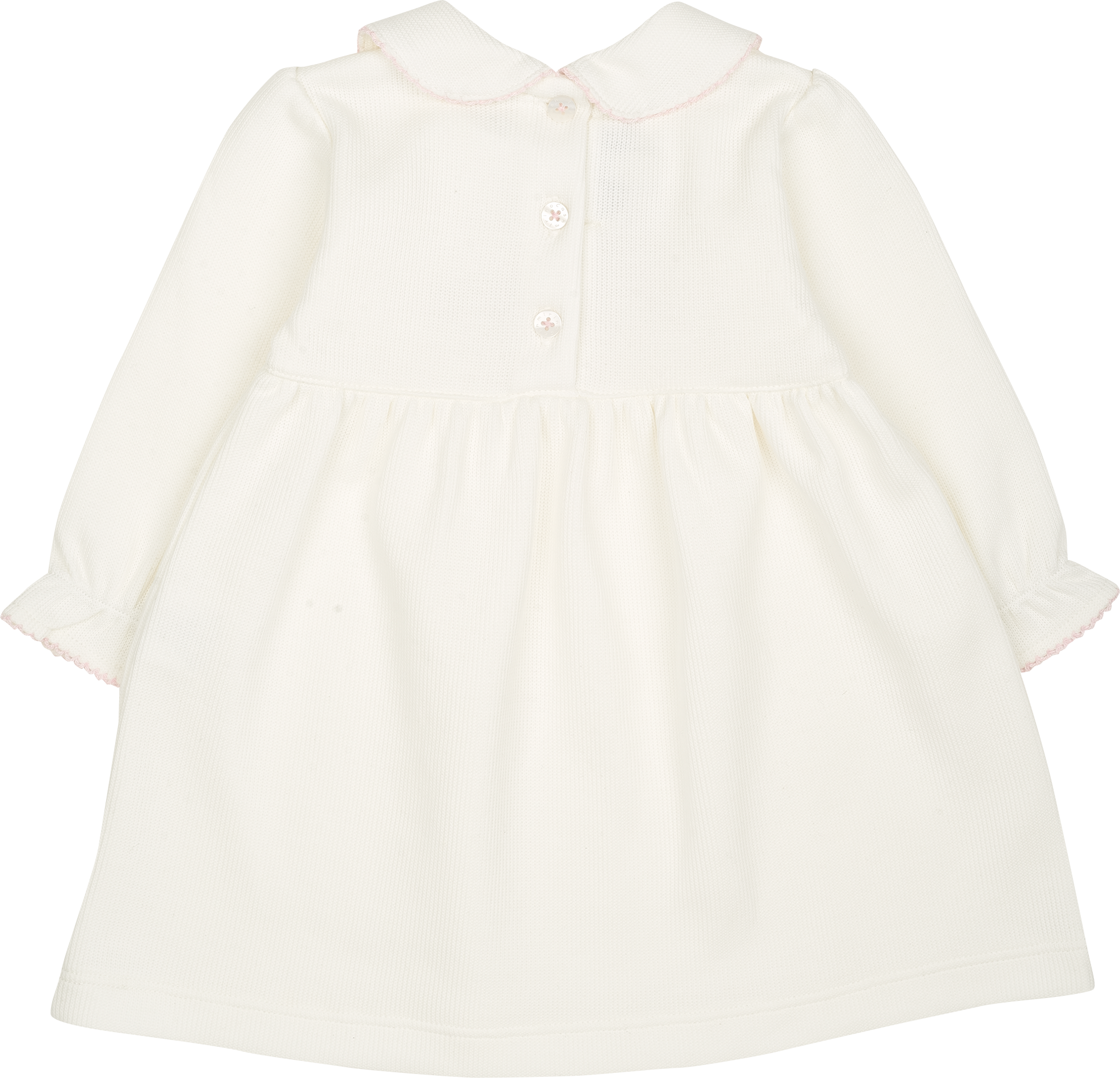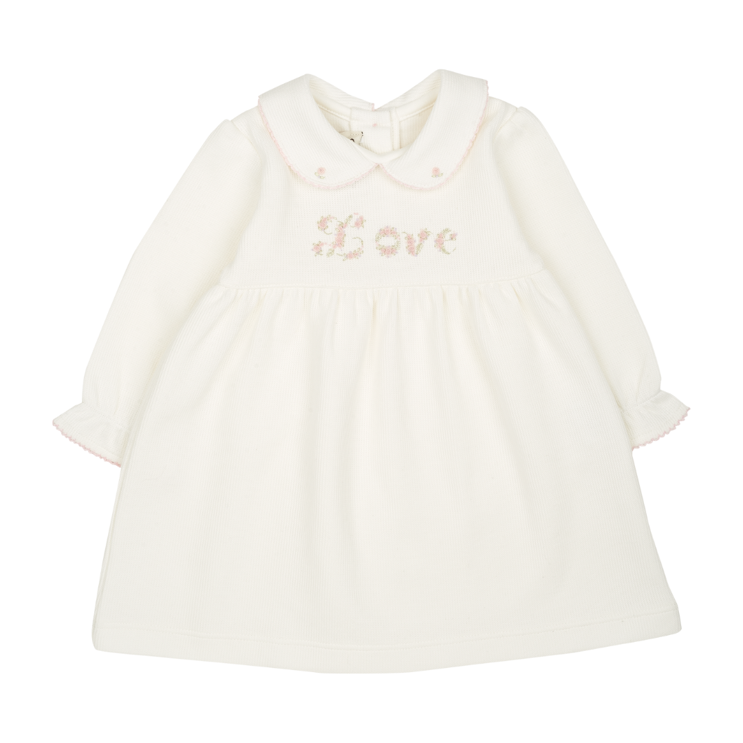 A chic Baby doll Baby Girl dress made from 100% soft Pima cotton, featuring a Peter Pan collar, ruffle long sleeves, a gathered waist and 'love' hand embroidered with rose detail on the top panel. Great for babies sensitive skin. Love embroidery rose detailing on the bodice.