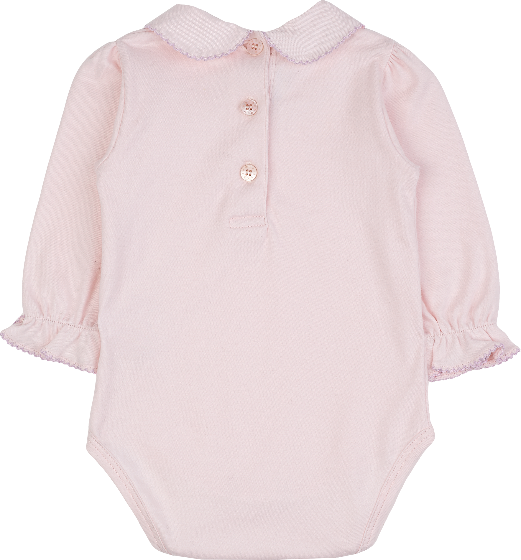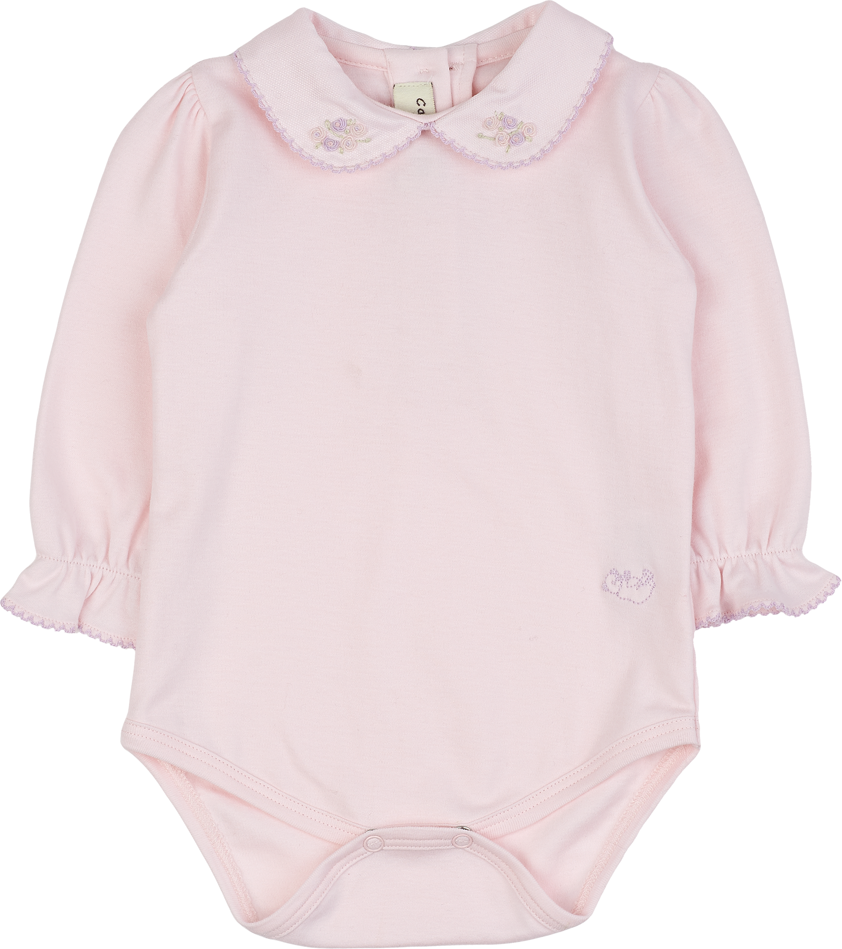 This adorable baby girl bodysuit is crafted from 100% soft cotton, gentle on delicate skin and perfect for all-day comfort. It features a timeless Peter Pan collar adorned with floral embroidery, along with long sleeves finished with sweet ruffles for a playful, elegant touch.