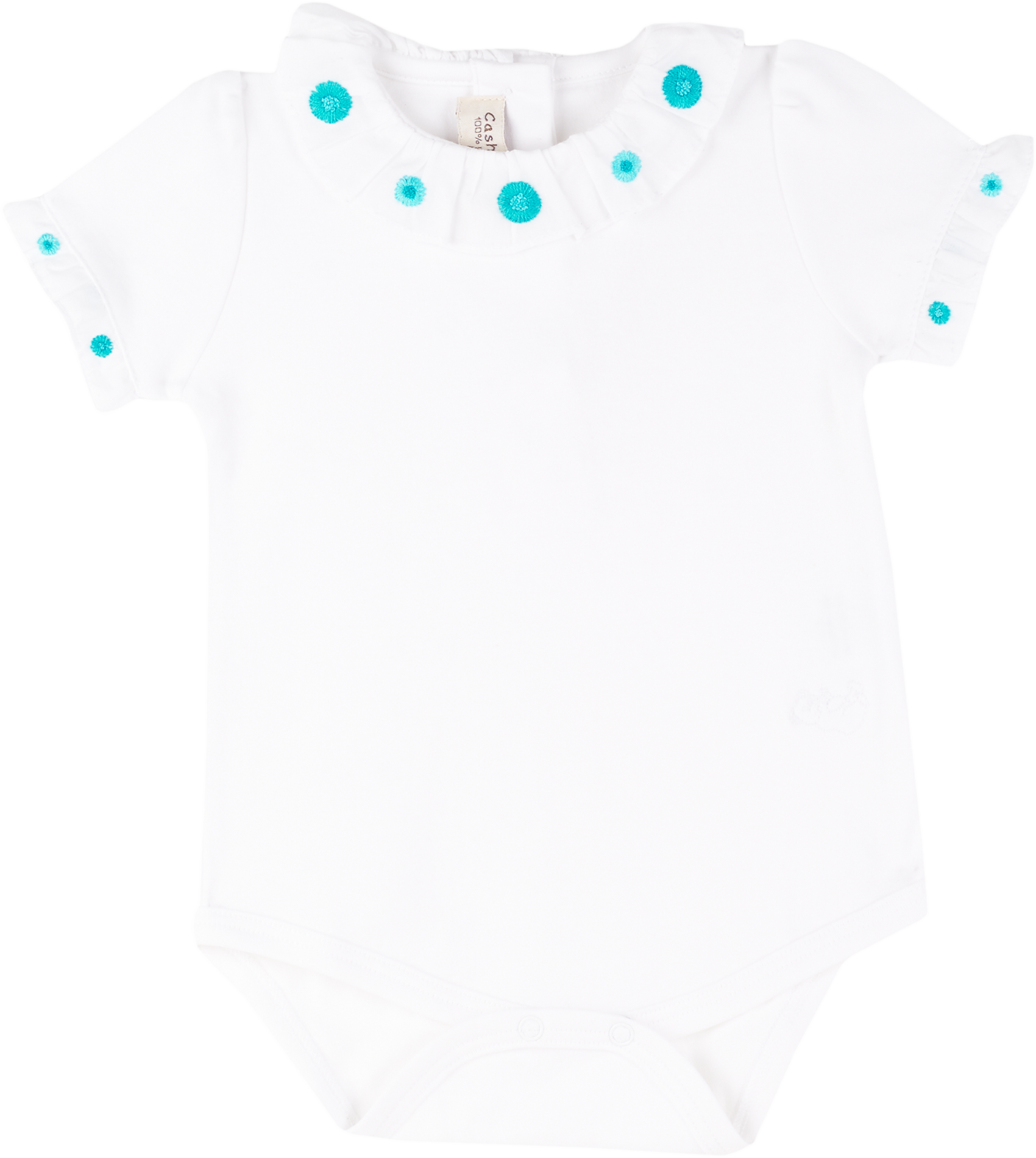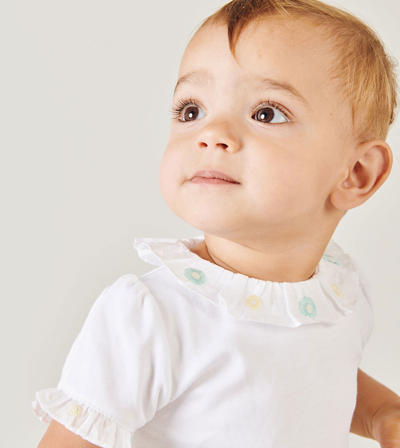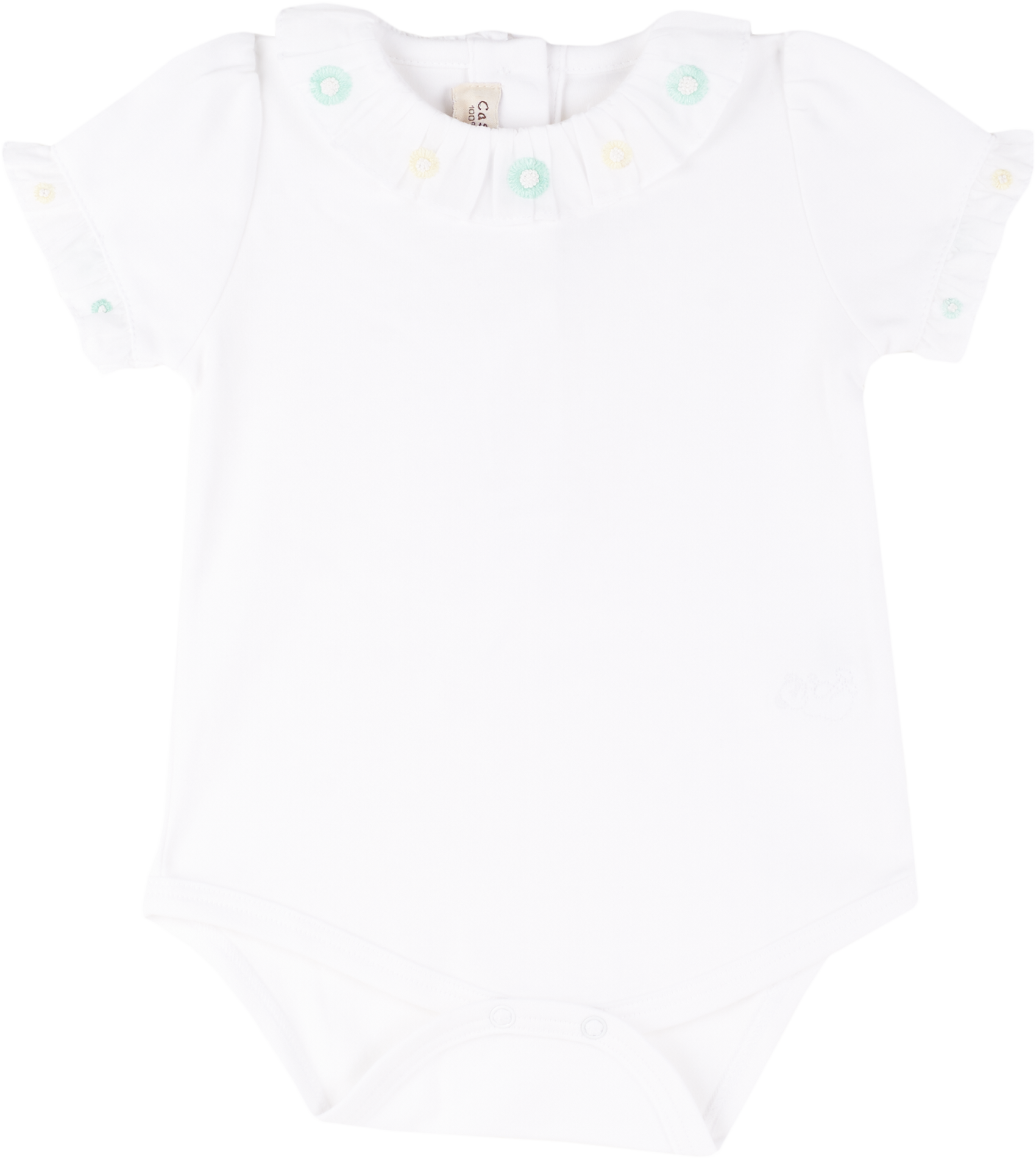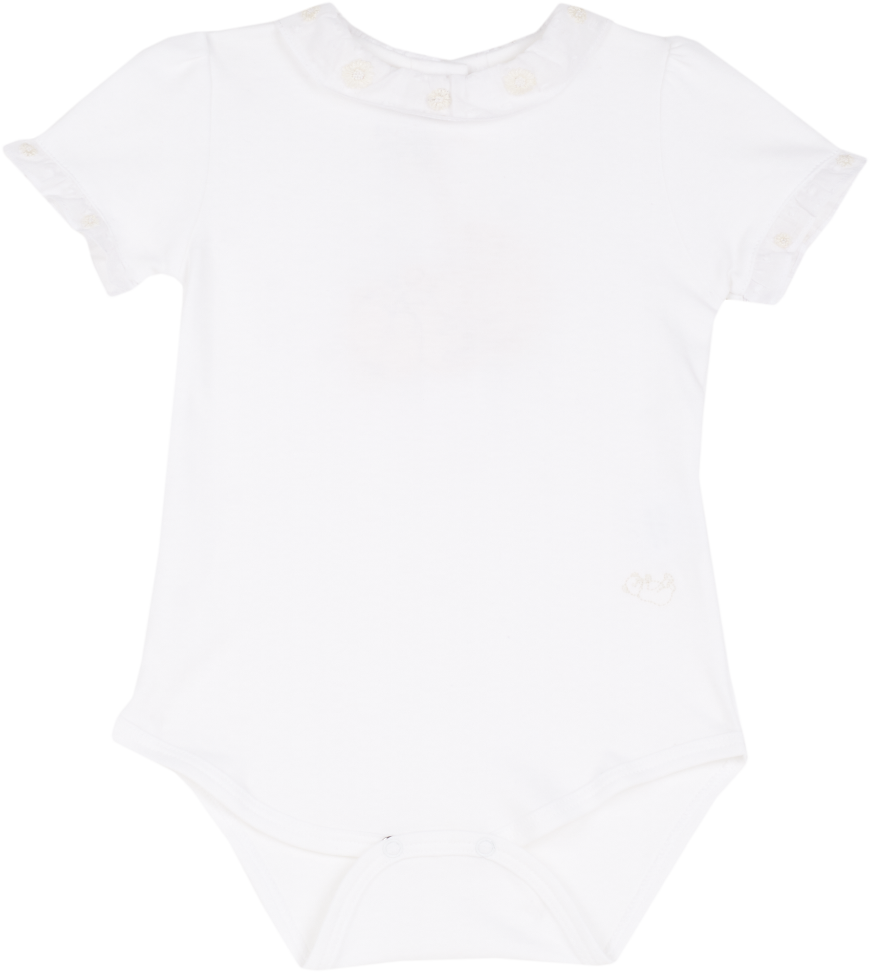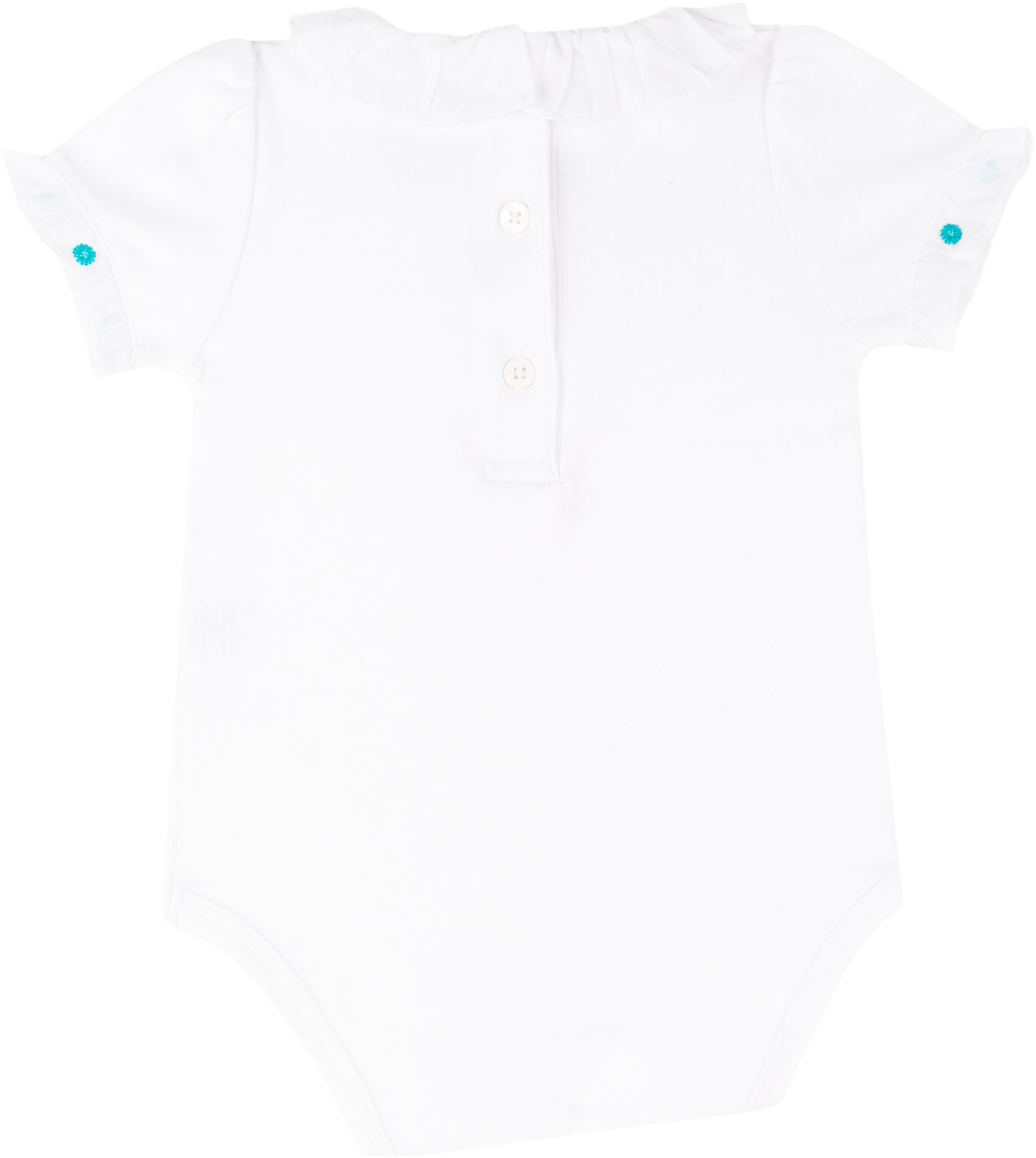 This charming short-sleeved baby girl bodysuit is crafted from 100% natural cotton, offering breathability and softness for delicate skin. Designed with elegant ruffle sleeves, a ruffled collar, and hand-embroidered floral detailing, it brings timeless charm to everyday dressing.