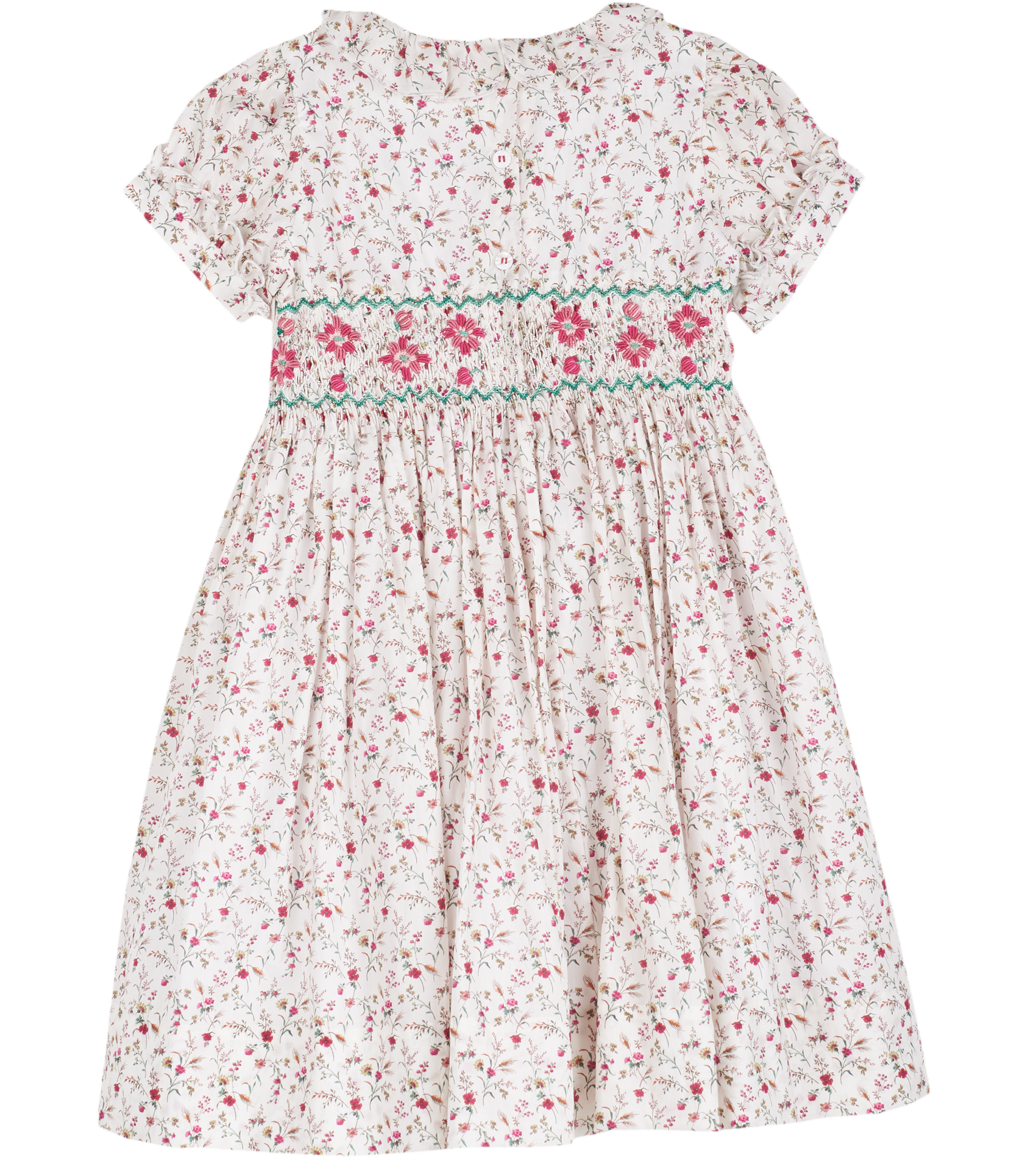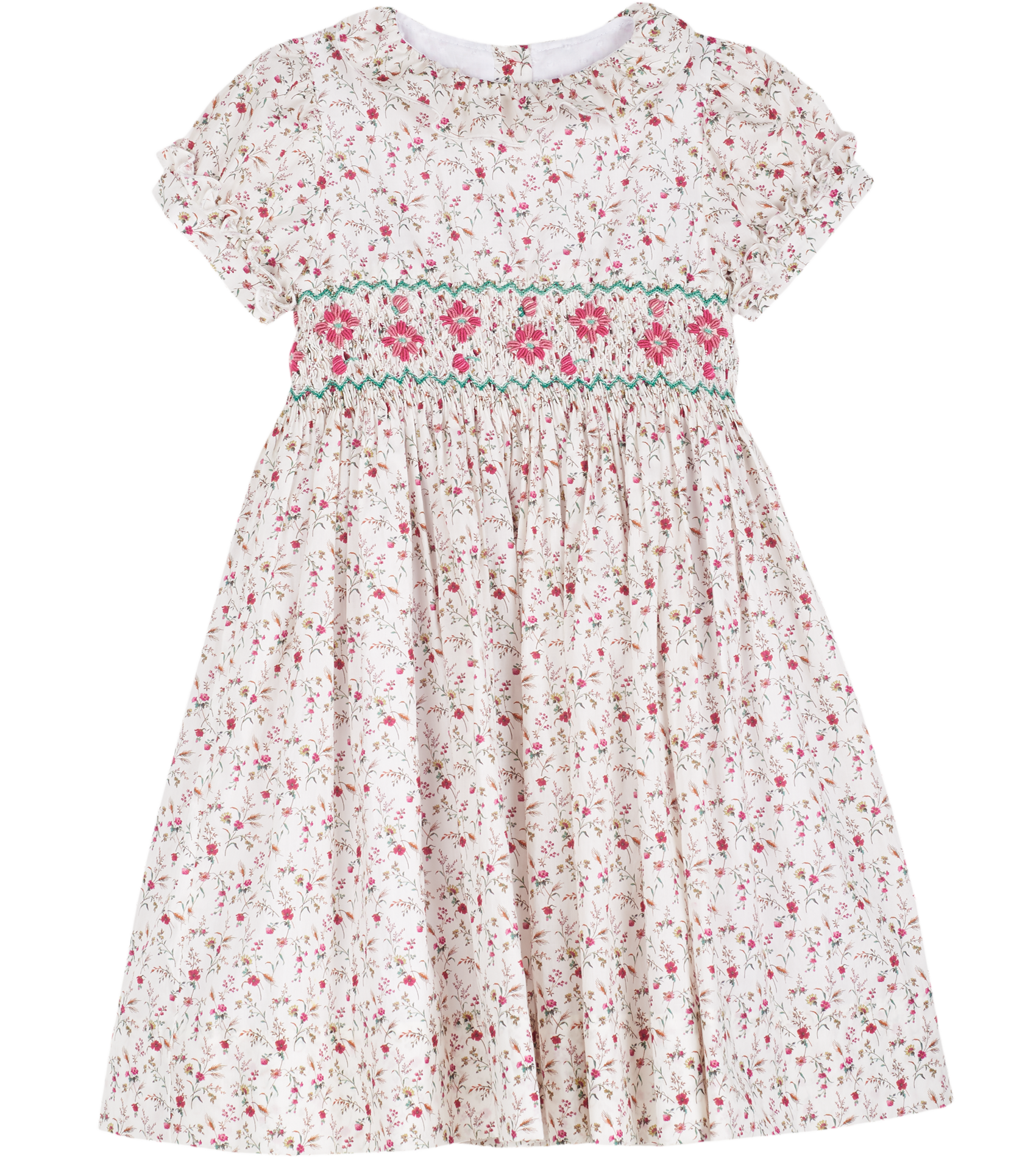 With its beauty in bloom, our Dahlia dress is an elegant style to wear all year round. This dress takes in the season by being made with Liberty fabrics, featuring smocking and hand embroidered flowers around the waist to create a beautiful, unique piece. With a ruffle collar and sleeves, this can be worn on warmer days or paired with our cotton and cashmere cardigans for warmth and comfort. This dress also includes Cashmirino's special message on our 100% cotton crochet trimmed lining. With a back fastening, this will make it super easy to put on your little one. This is the ultimate expression of perfection, brightening any little girl's day!