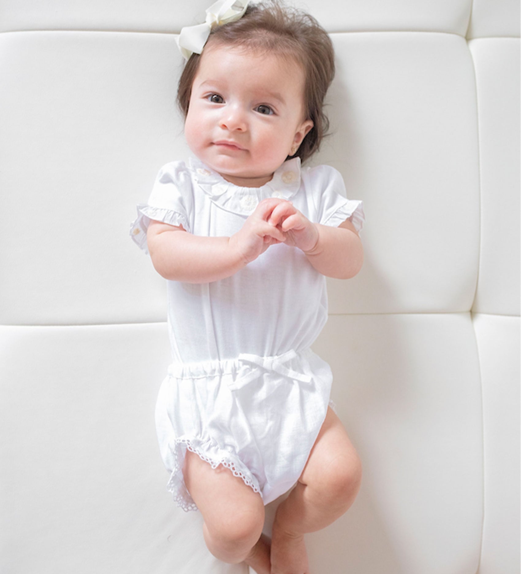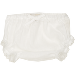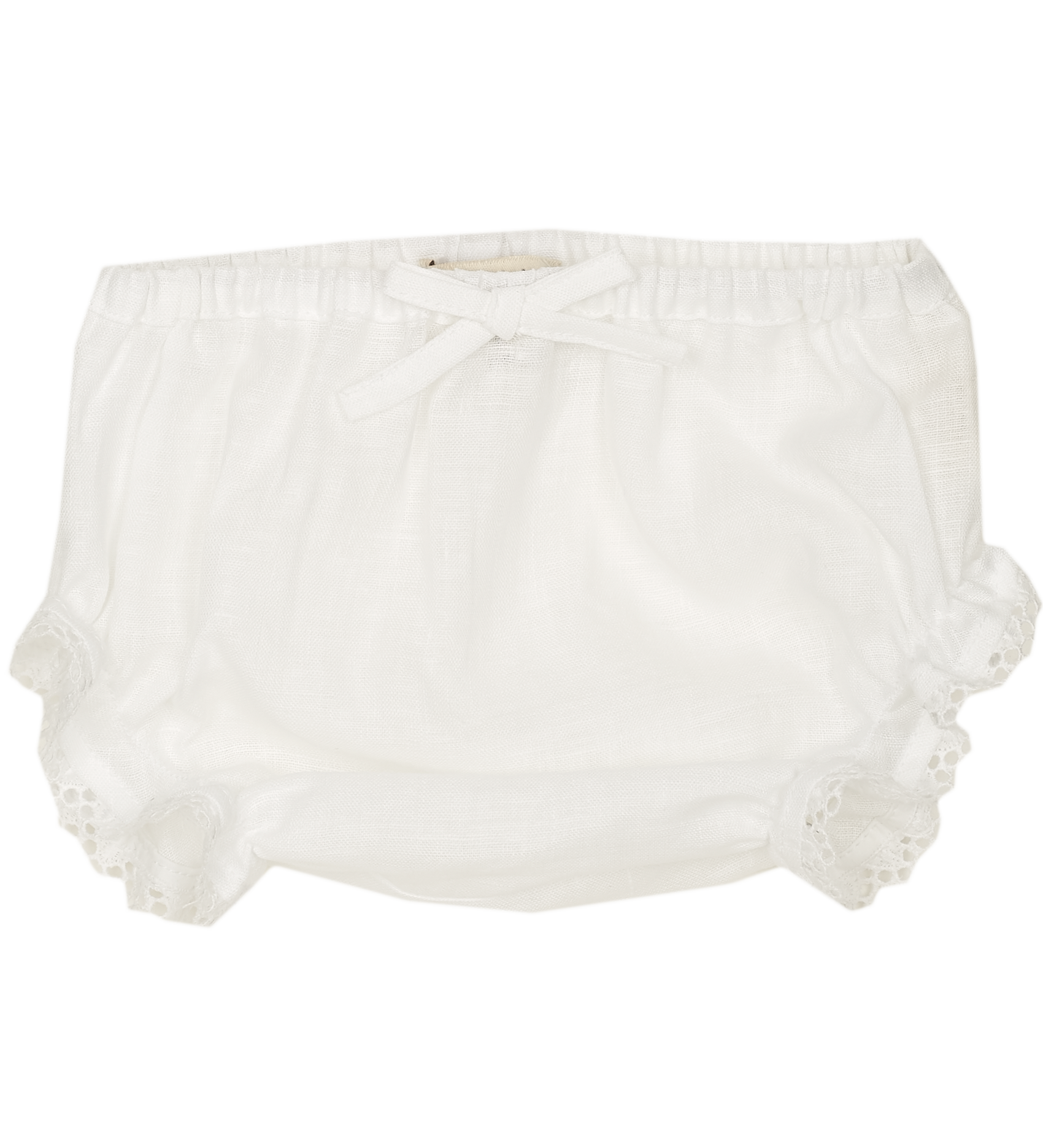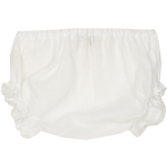 100% linen Baby Girl bloomers with delicate lace detail, finished off with a dainty bow at the front.