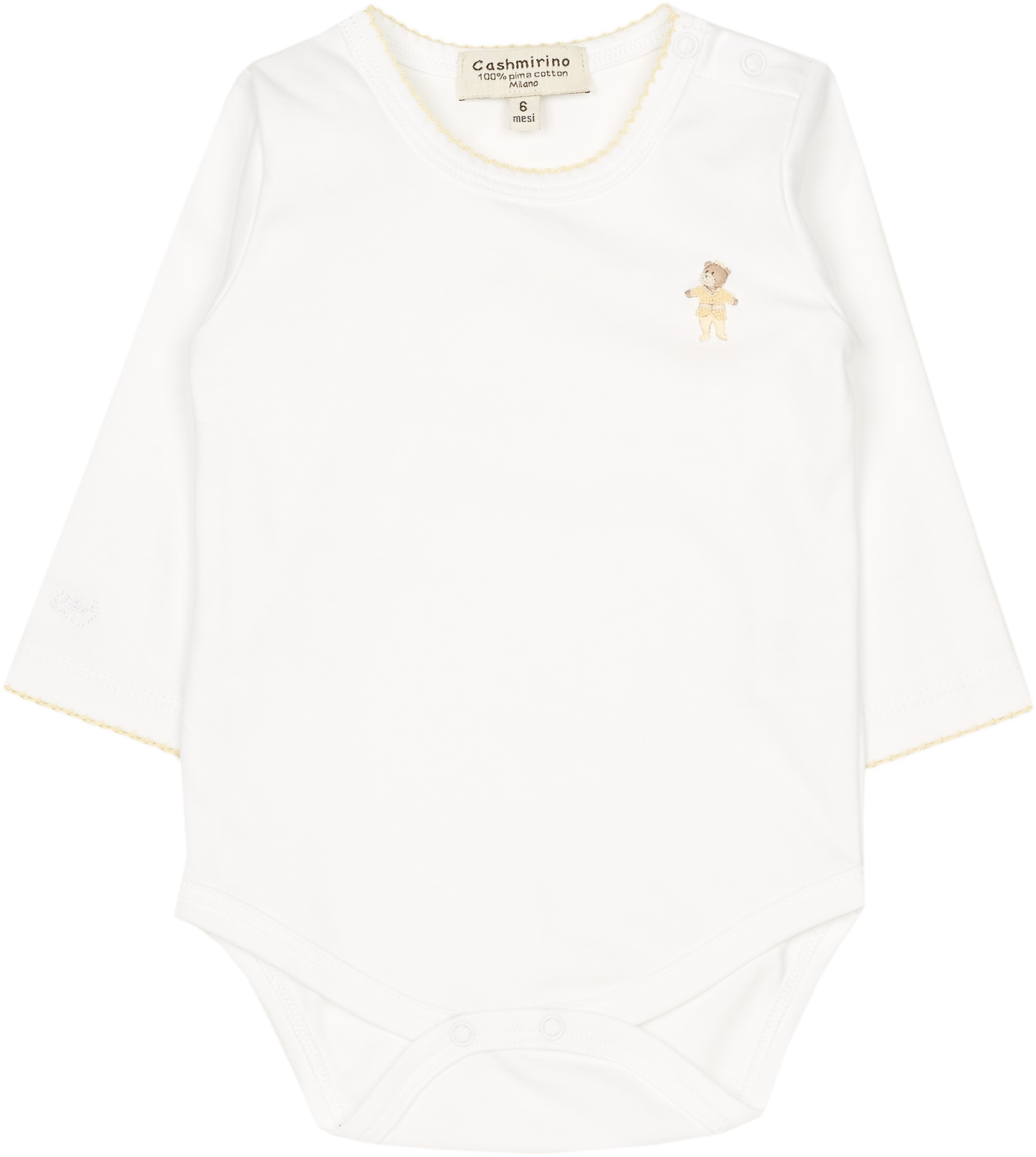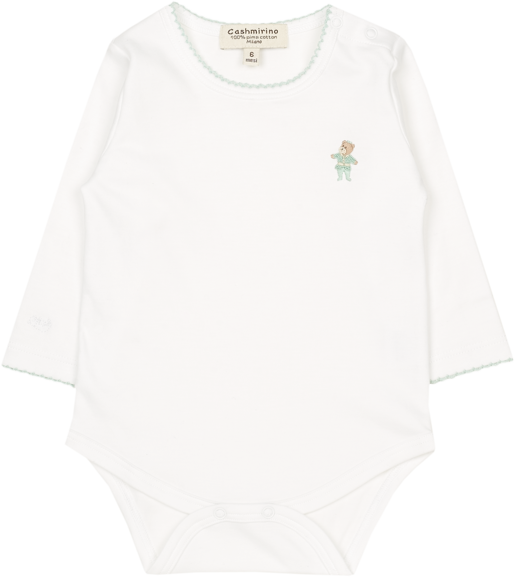 This charming piece features our signature Cashmirino bear, carefully hand-embroidered for a special artisanal touch. Designed with practical popper fastenings and available in a range of elegant colour-trim combinations, it’s the perfect addition to any baby girl’s wardrobe.