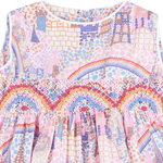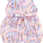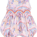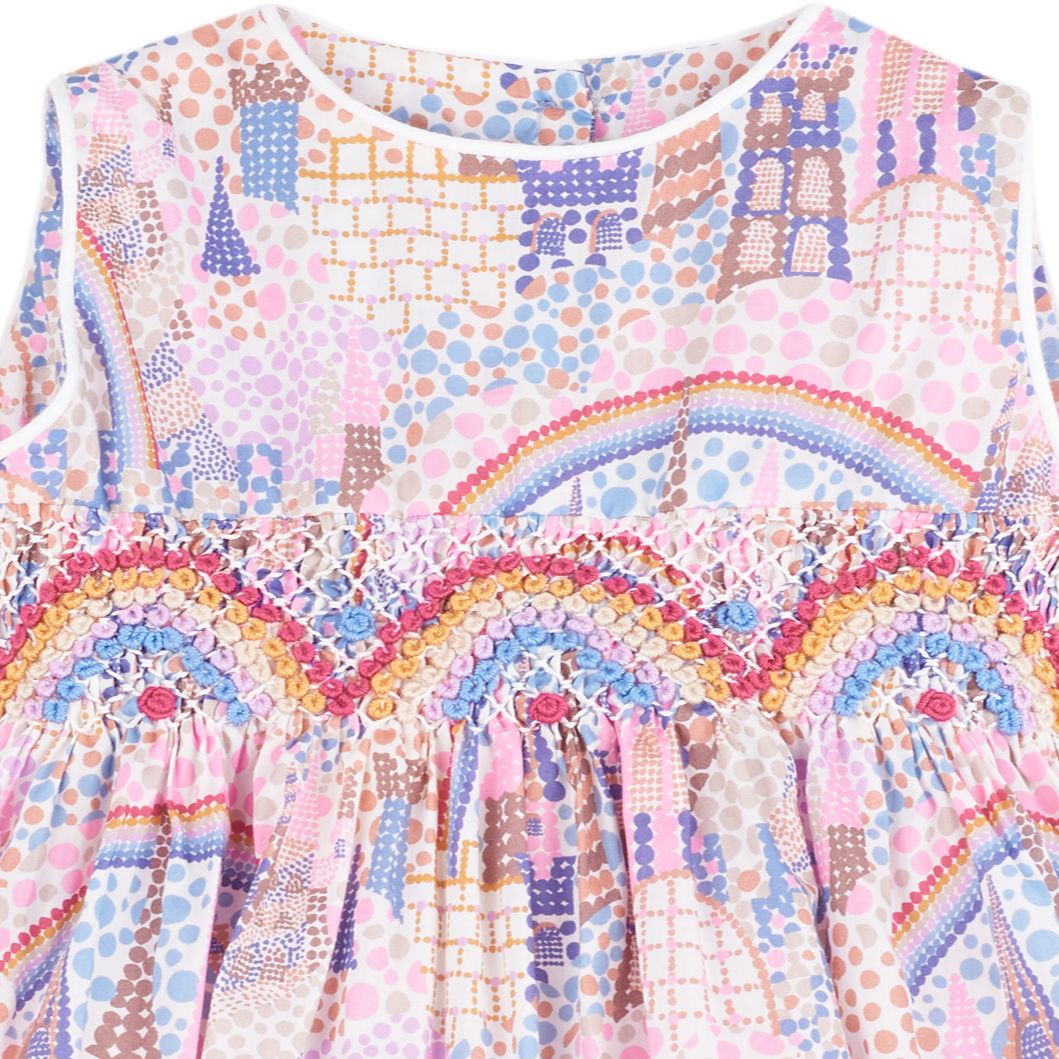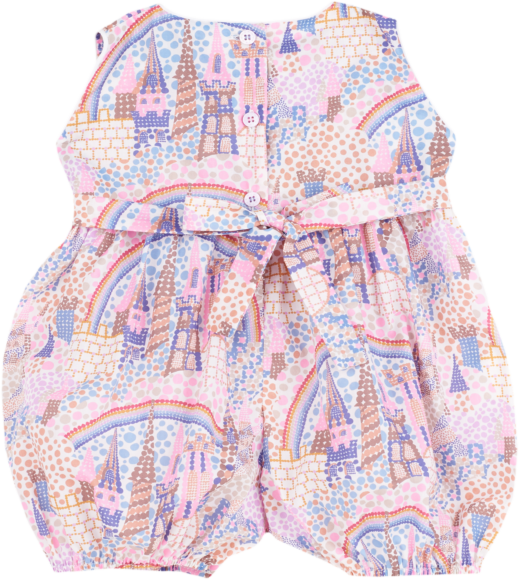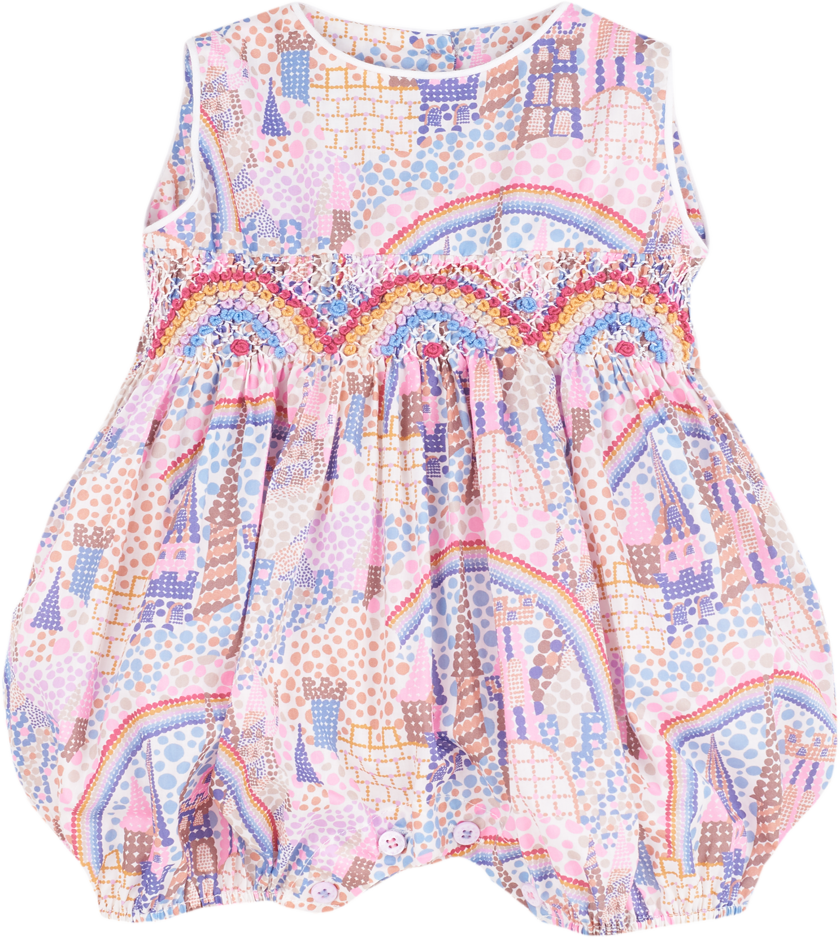 Inspired by the magical world of castles, this playtime printed cotton romper is perfect for your little girl. Featuring balloon shorts and a gathered waist. The Iris romper also includes a tie back and button opening, making it super easy to put on. We adore the intricate hand embroidered rainbows on our classic smocked front panel, crafted by our talented artisans. Lightweight and breathable, it is a must-have staple. This piece is perfect for all occasions and is available in a variety of sizes.