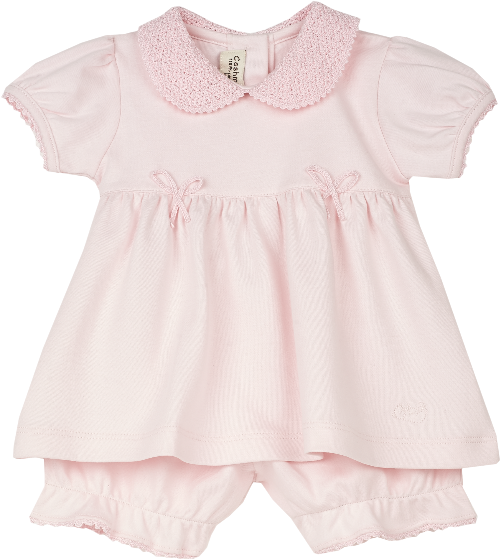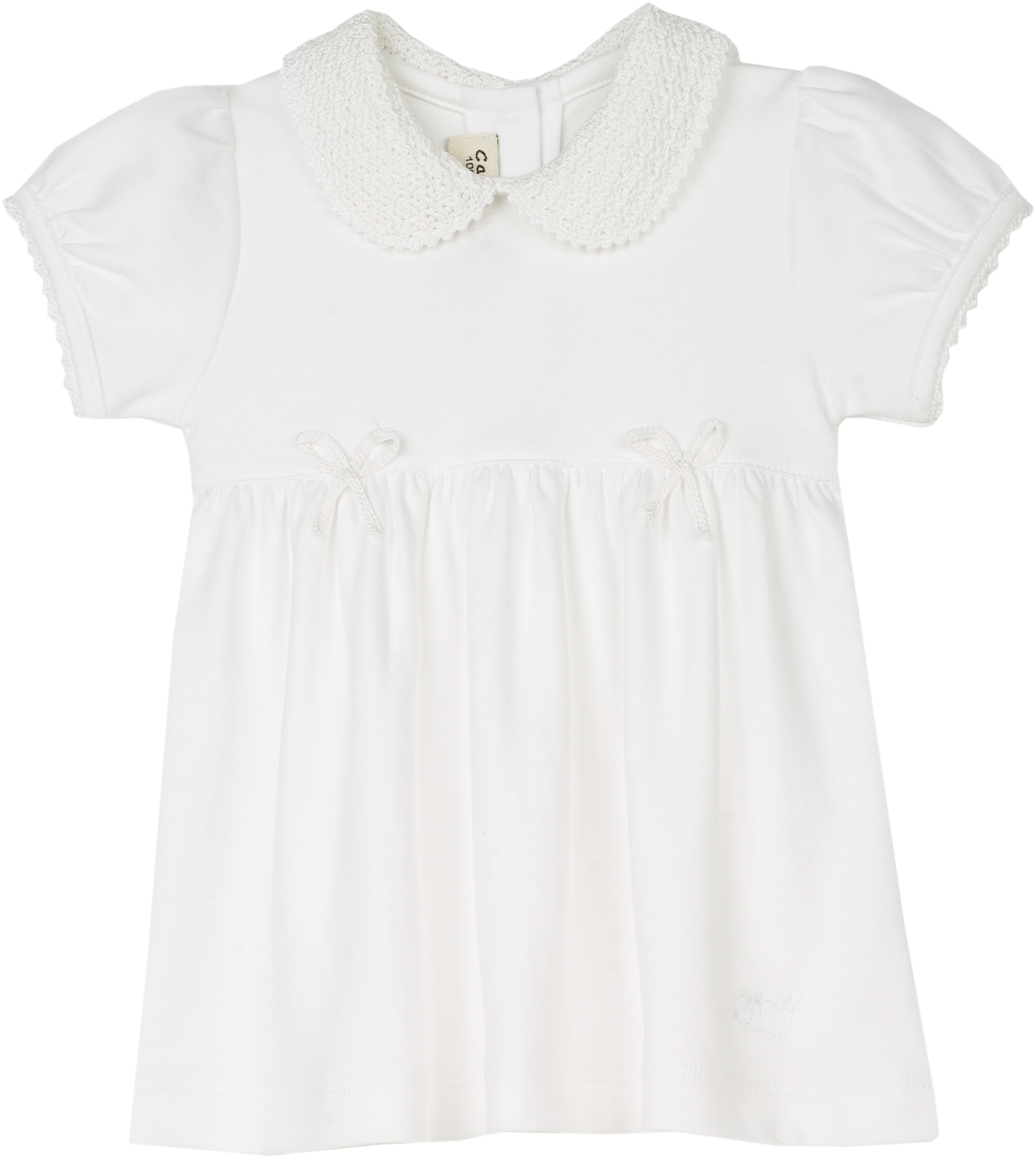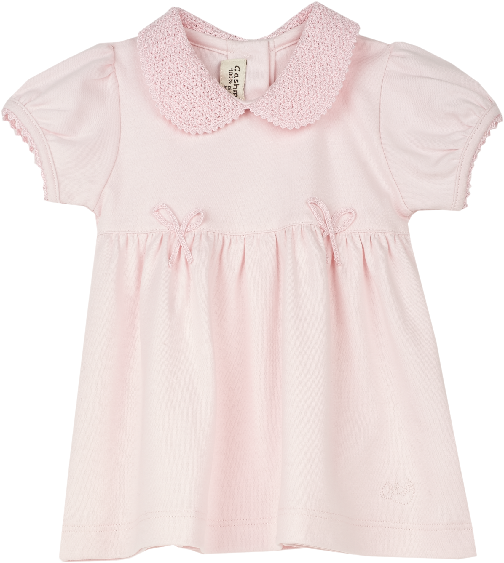 Delicate handmade crochet details add an artisanal touch, making this piece a true heirloom-in-the-making. The Peter Pan crochet collar, elegant trim, and sweet bow accents are complemented by our signature gathered waist and mother-of-pearl-effect Cashmirino buttons, ensuring a finish that is both classic and distinctive.
