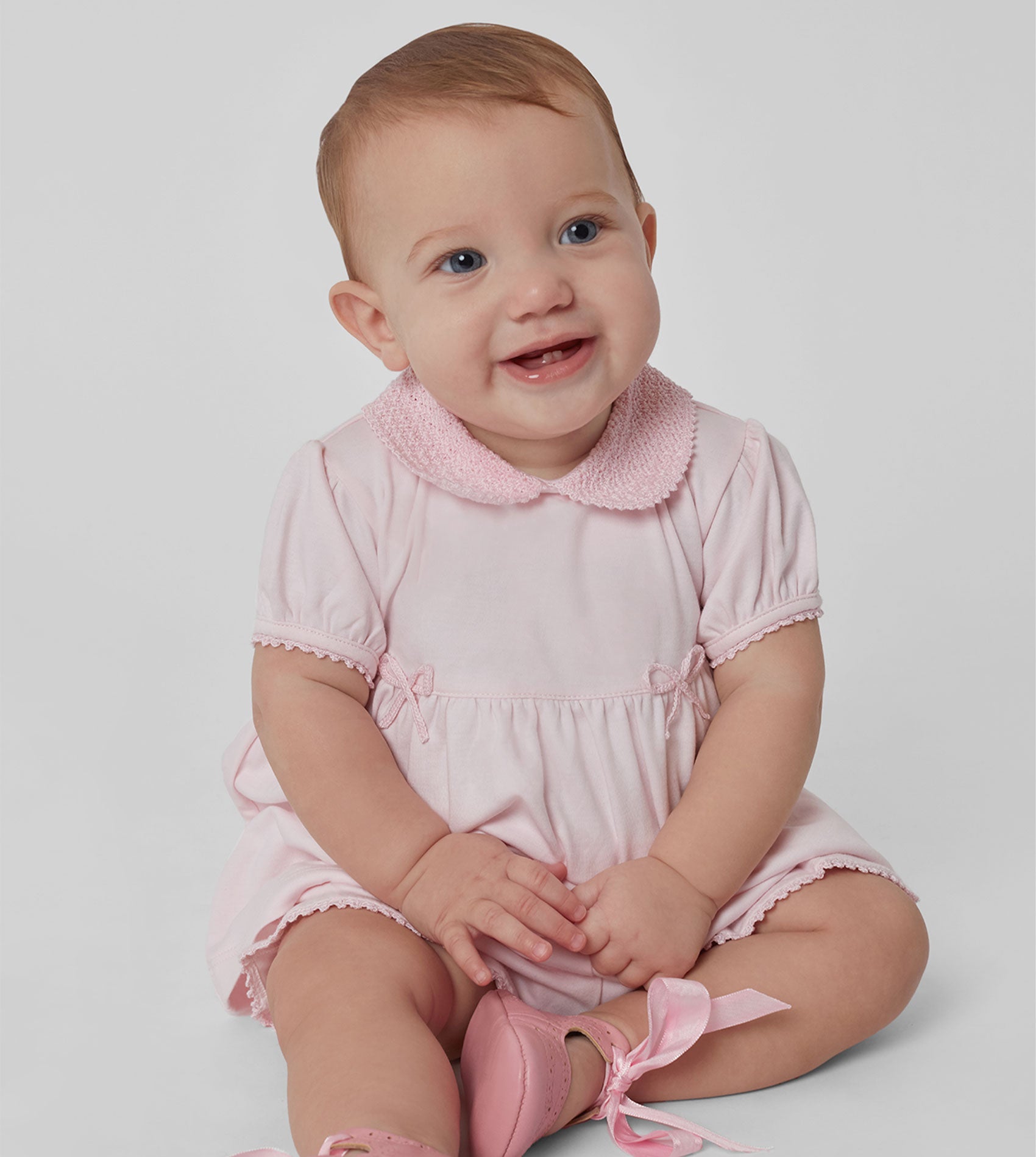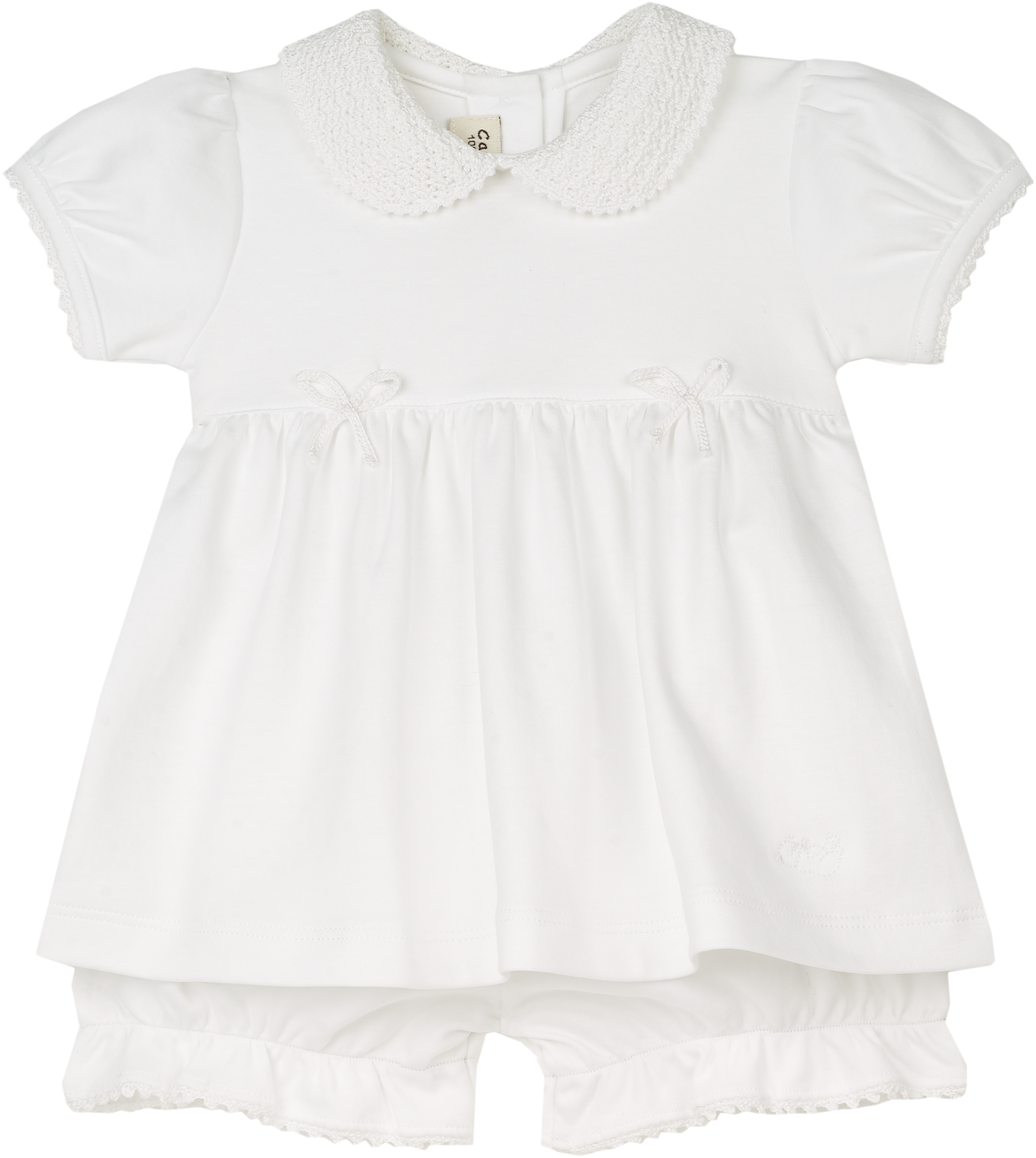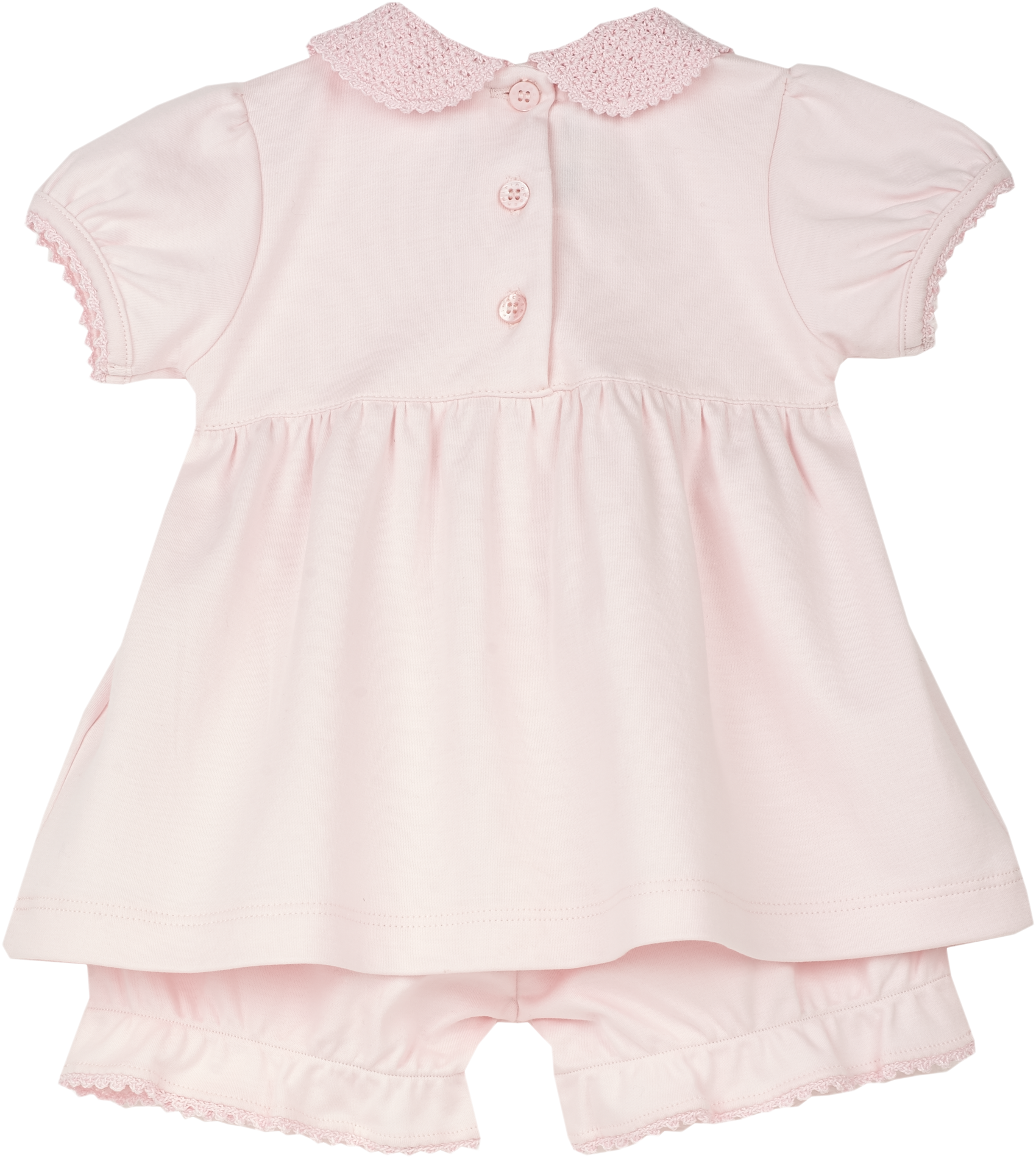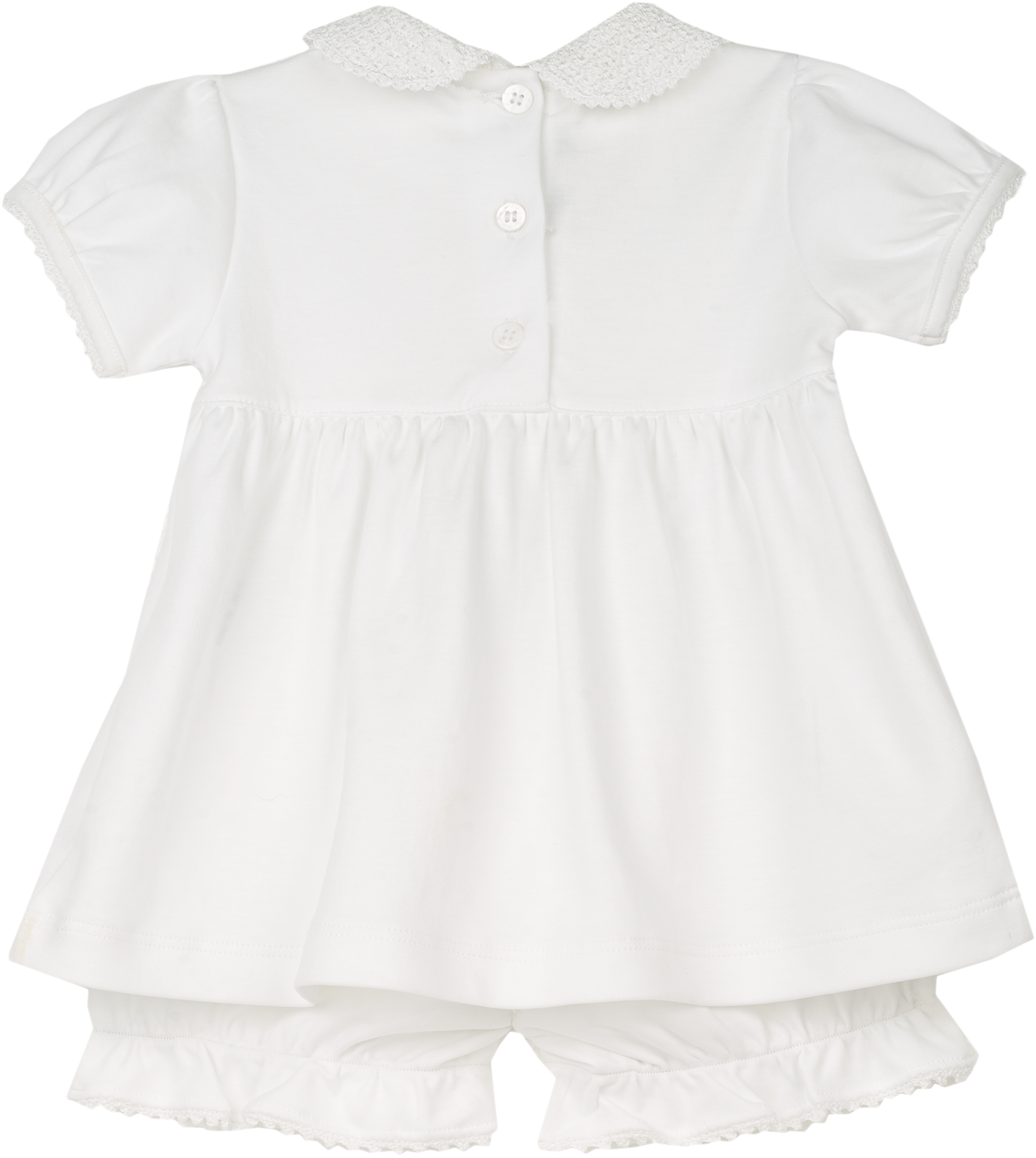 Delicate handmade crochet details add an artisanal touch, making this piece a true heirloom-in-the-making. The Peter Pan crochet collar, elegant trim, and sweet bow accents are complemented by our signature gathered waist and mother-of-pearl-effect Cashmirino buttons, ensuring a finish that is both classic and distinctive.