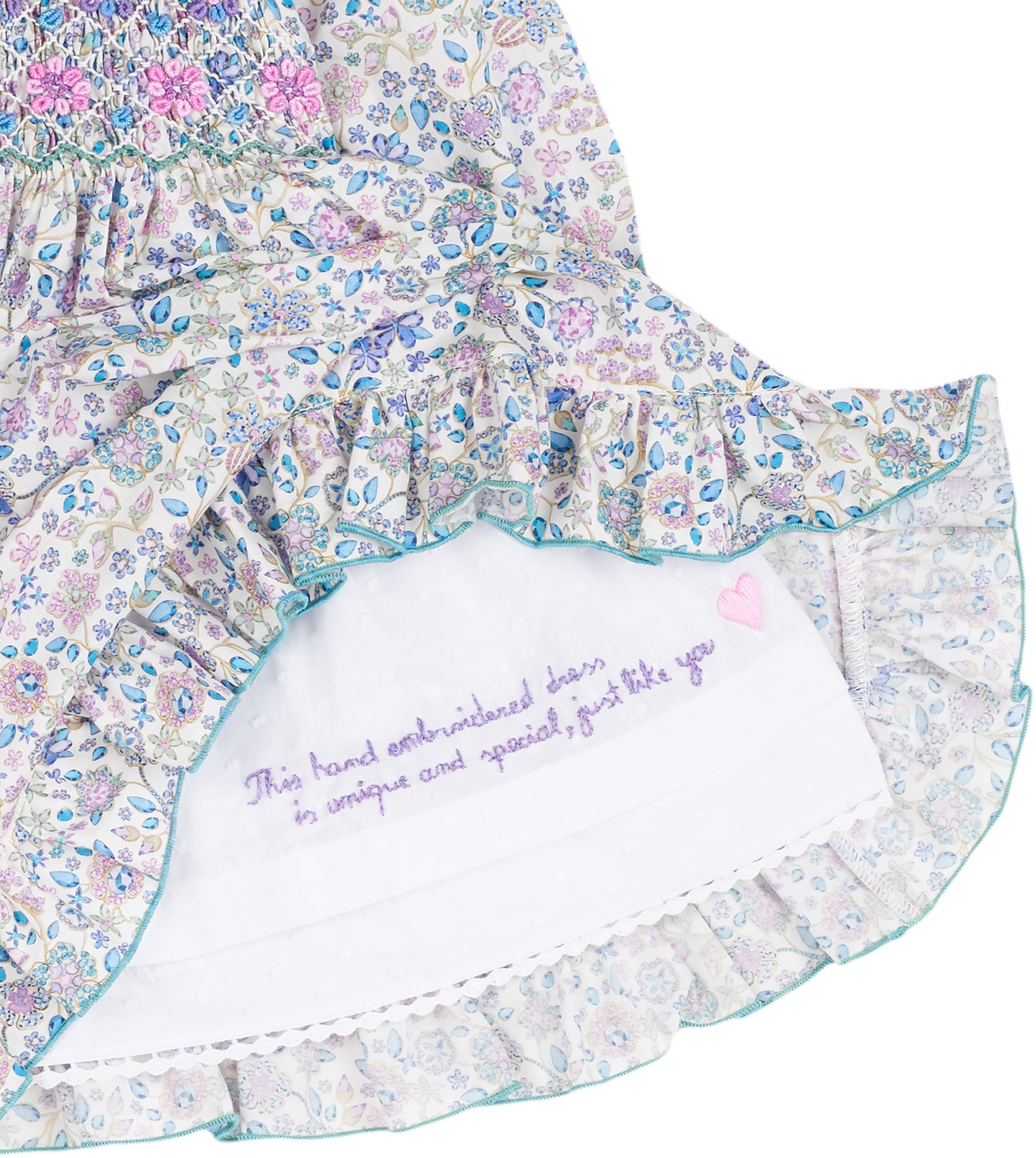 - Hand-embroidered text on lining hem: “This hand-embroidered set is unique and special, just like you.”