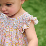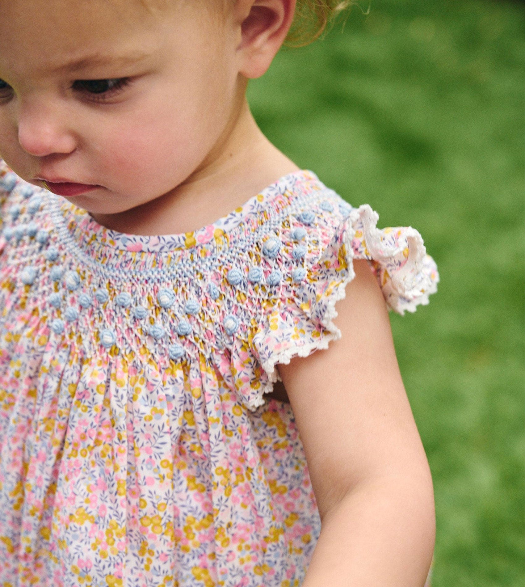 This beautiful baby girl smocked dress is made from cotton and is decorated with frill sleeves. Made with Liberty fabrics and has lace inserts. Available in a range of sizes.