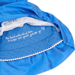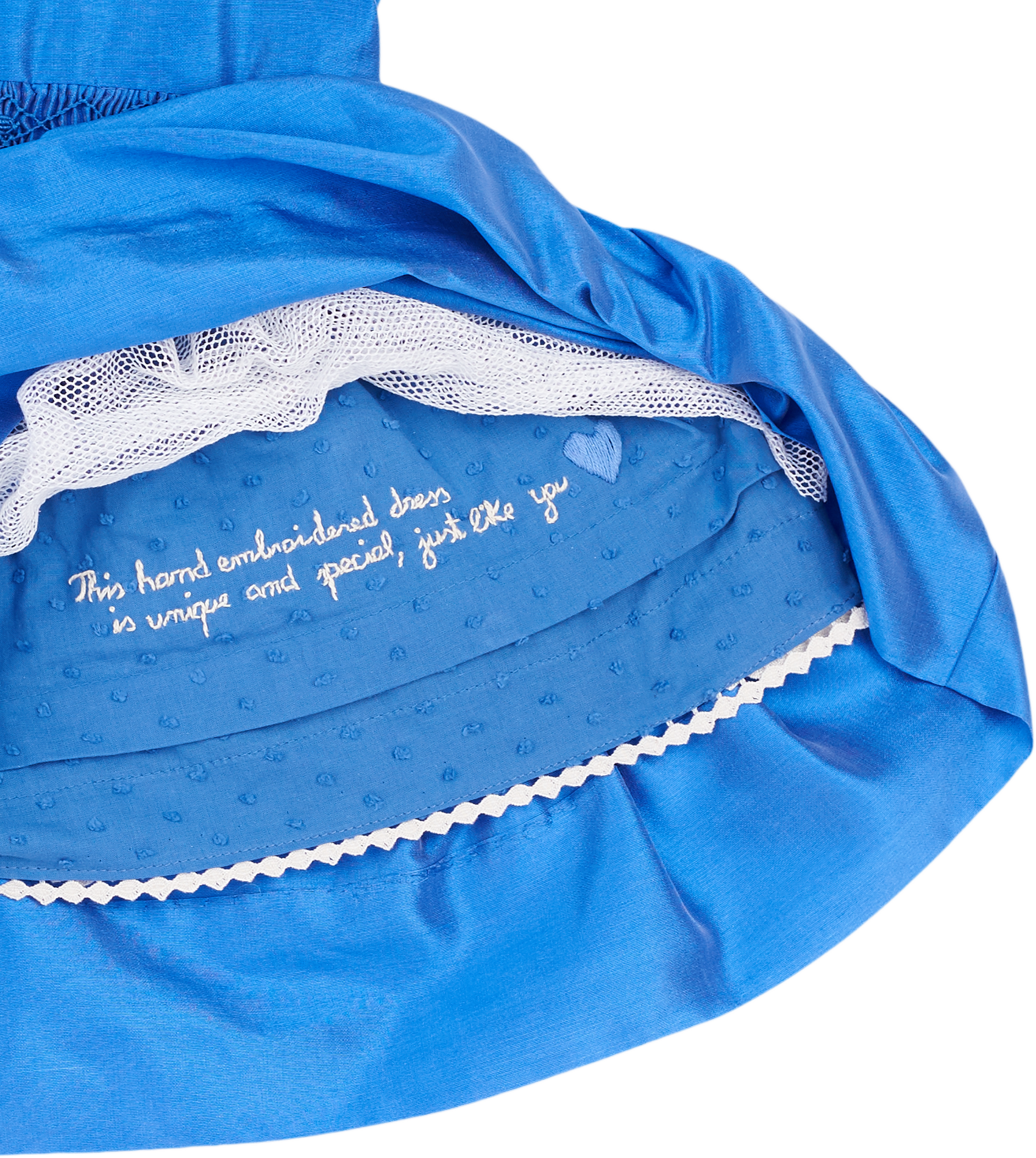 Designed with comfort in mind, the dress includes gentle cap sleeves, a soft 100% cotton lining, and a lace-trimmed hem for that extra delicate finish. A back zipper ensures easy changes while maintaining a seamless silhouette. Hidden along the inside hem is a sweet hand-embroidered message: