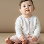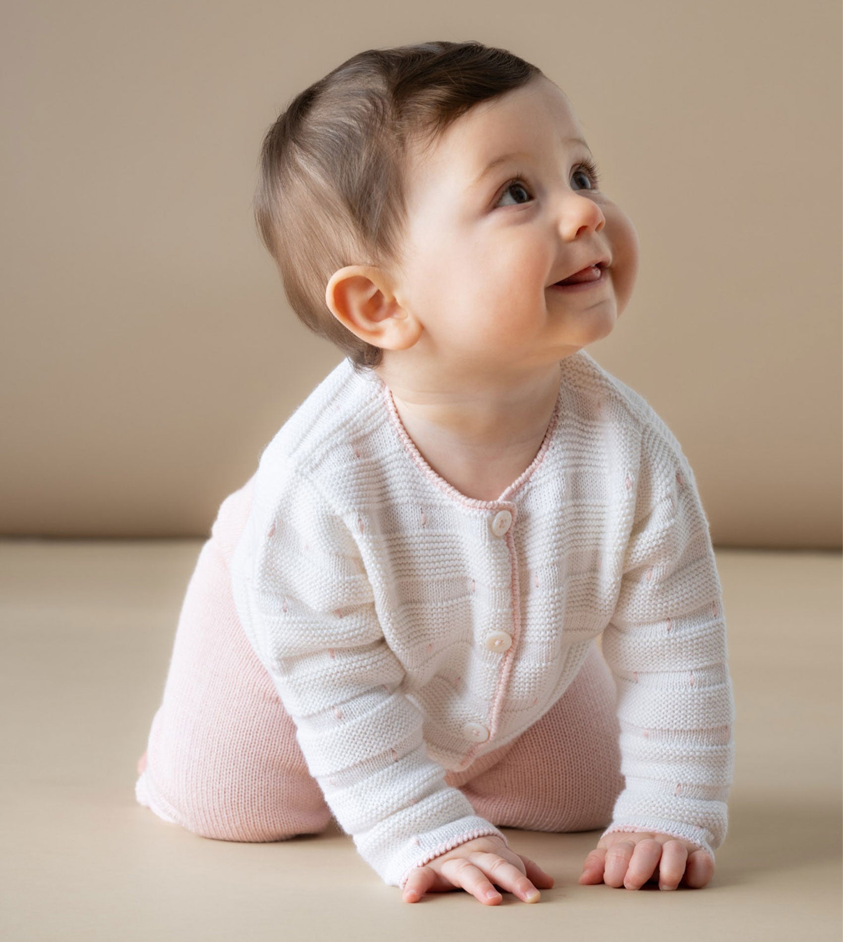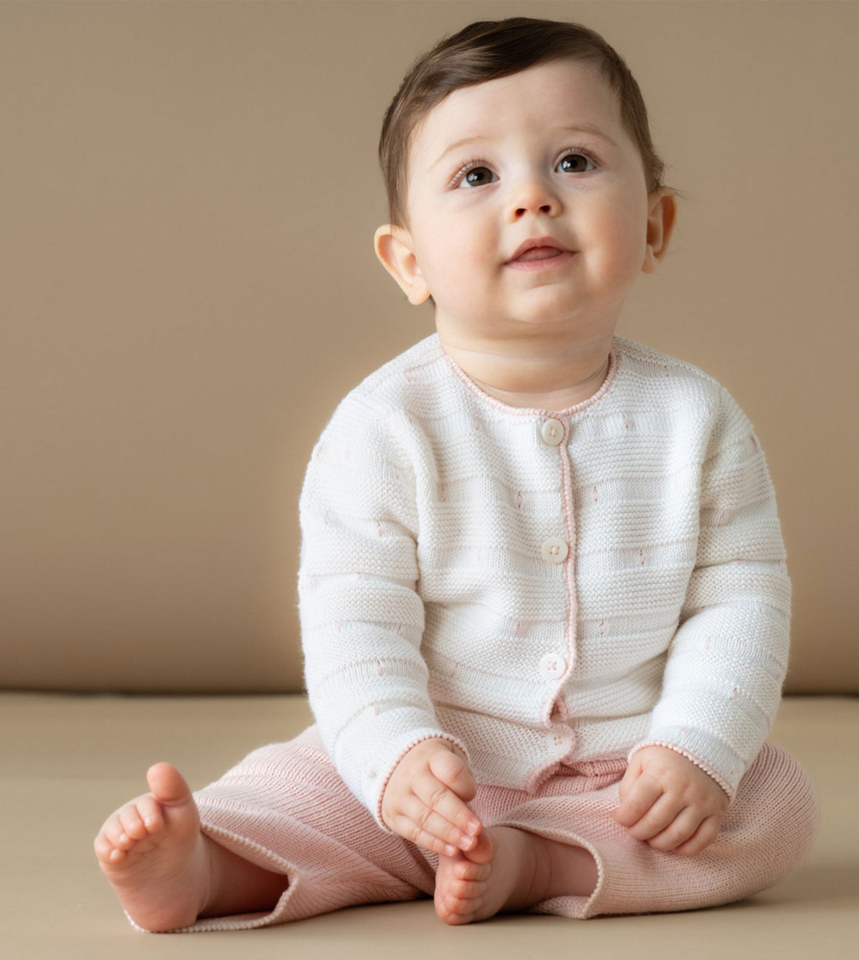 The classic combination of white and pink serves as a delightful canvas for the delicate hand-embroidered polka dots, infusing the design with a touch of whimsy and charm. Paired seamlessly with the cardigan, the matching bottoms complete the ensemble with effortless sophistication. Crafted with the same commitment to excellence and attention to detail, these bottoms provide a snug and comfortable fit, encouraging your little one to move and explore with ease.