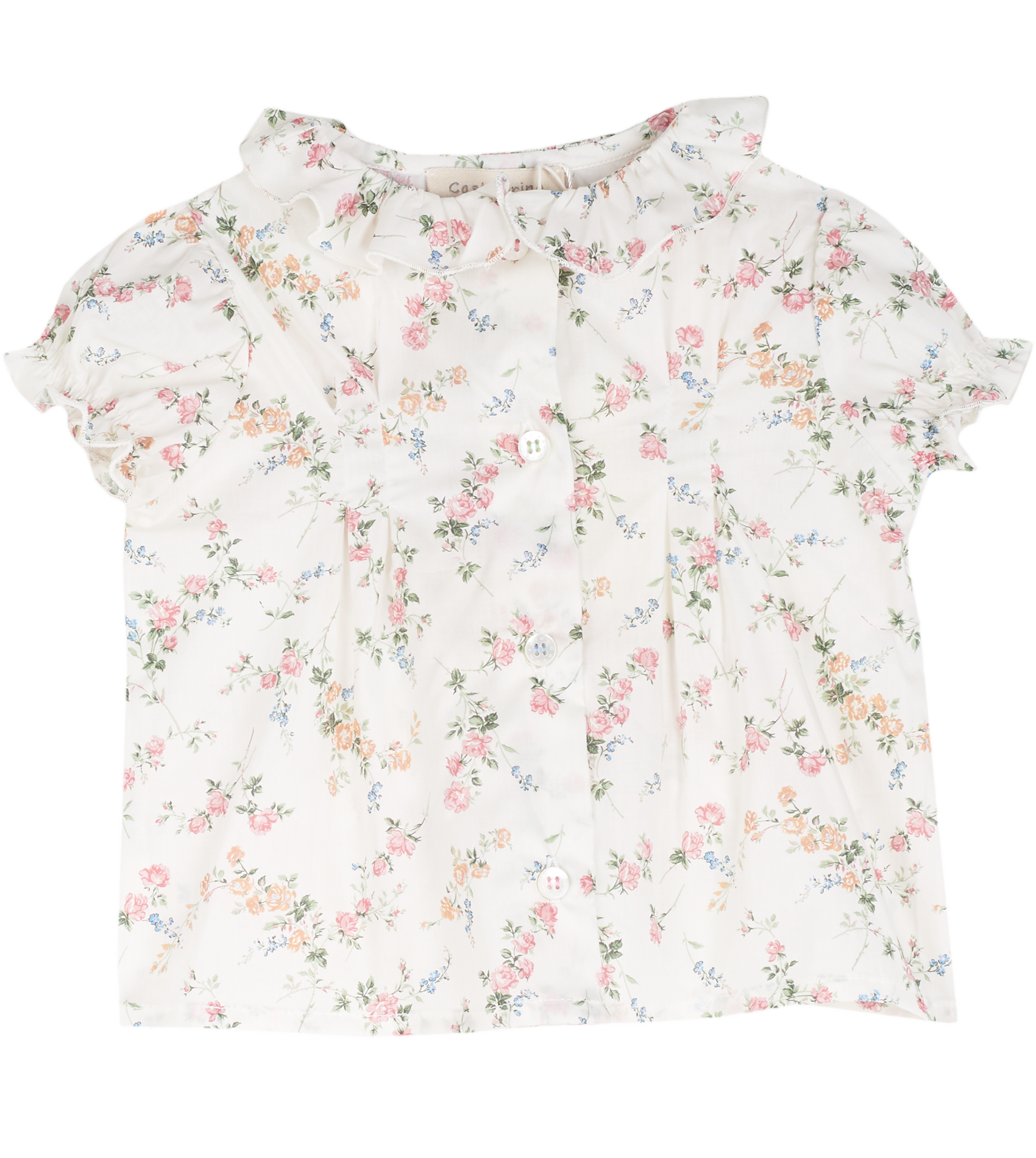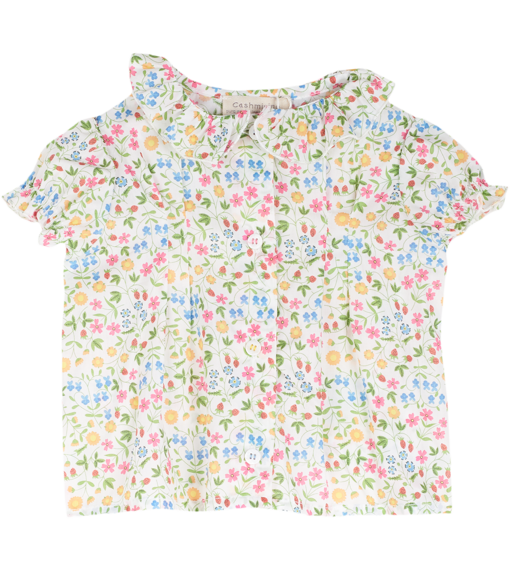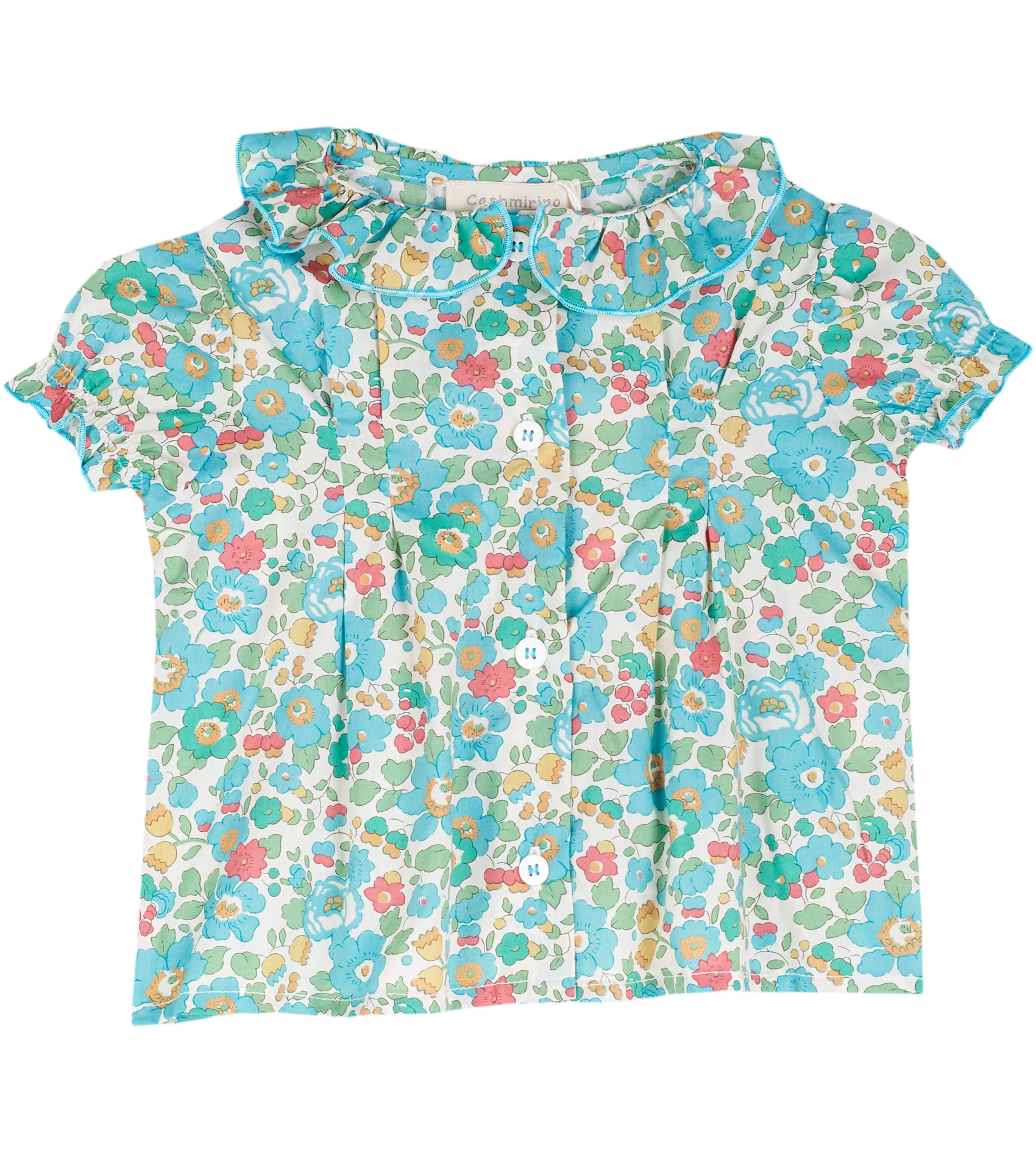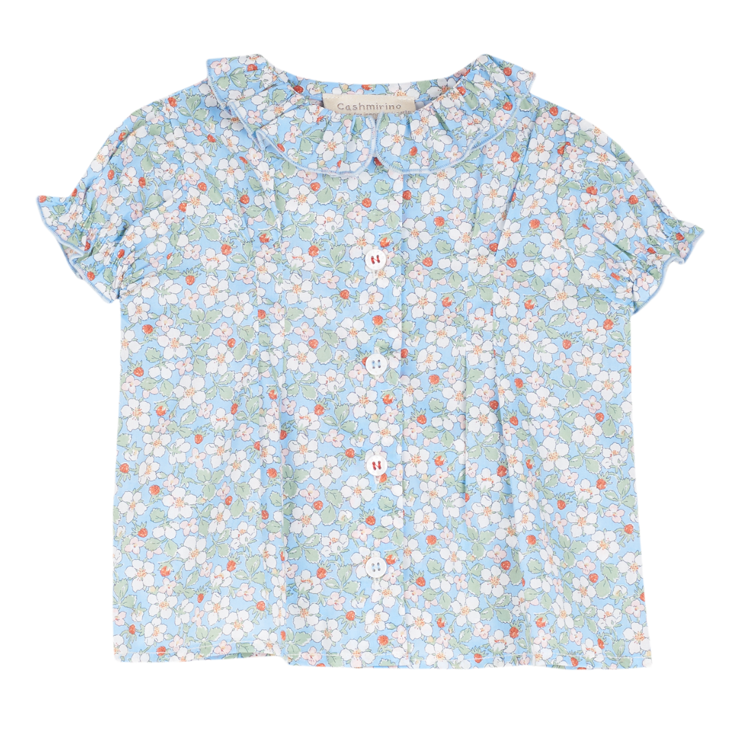 The Trudy Baby Girl blouse, made from 100% cotton will fit in seamlessly with the summer scenery. The breathable cotton composition of this blouse is brought to life with a range of signature, colourful prints. Ruffled collar, Puff sleeves, Dart detailing, Signature Cashmirino buttons.