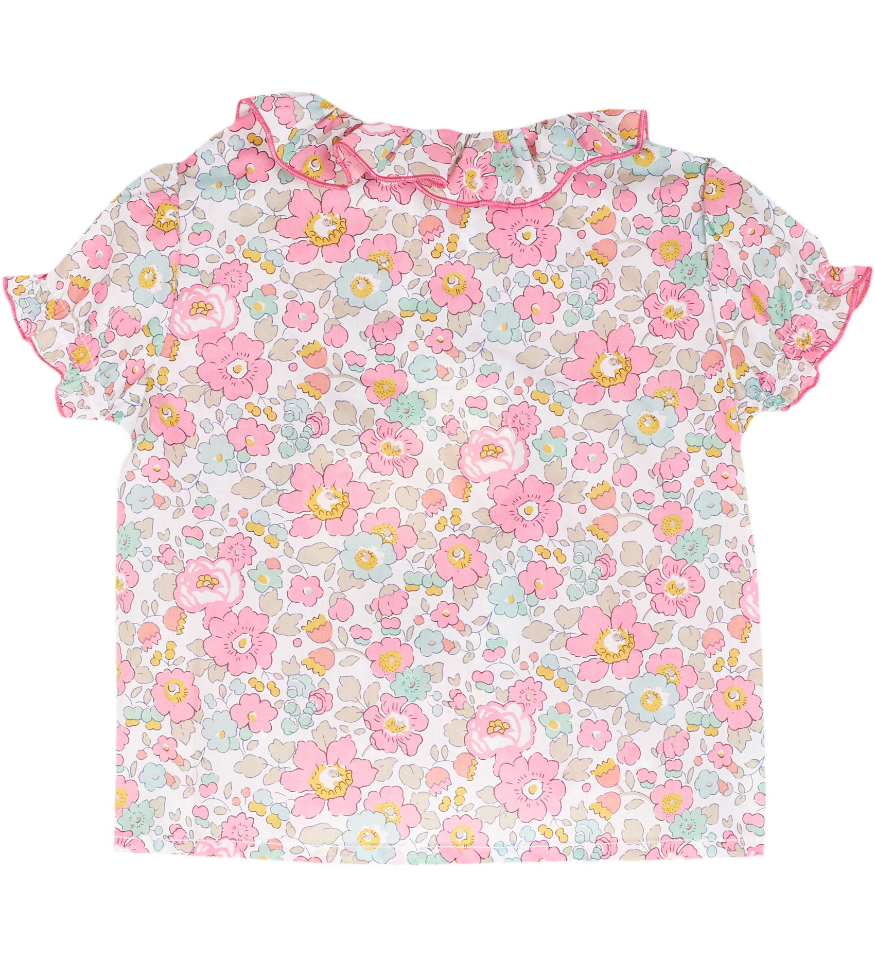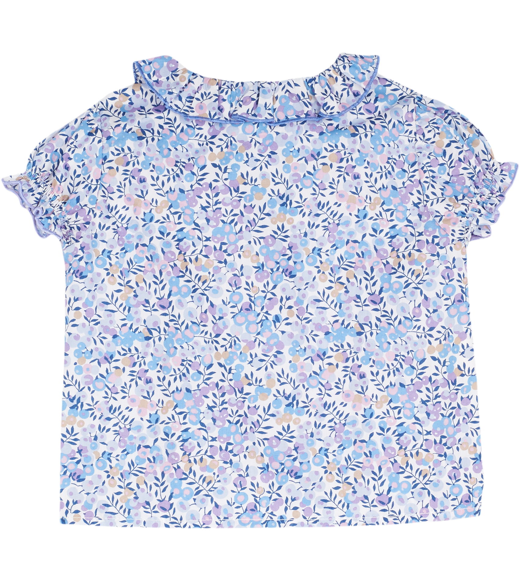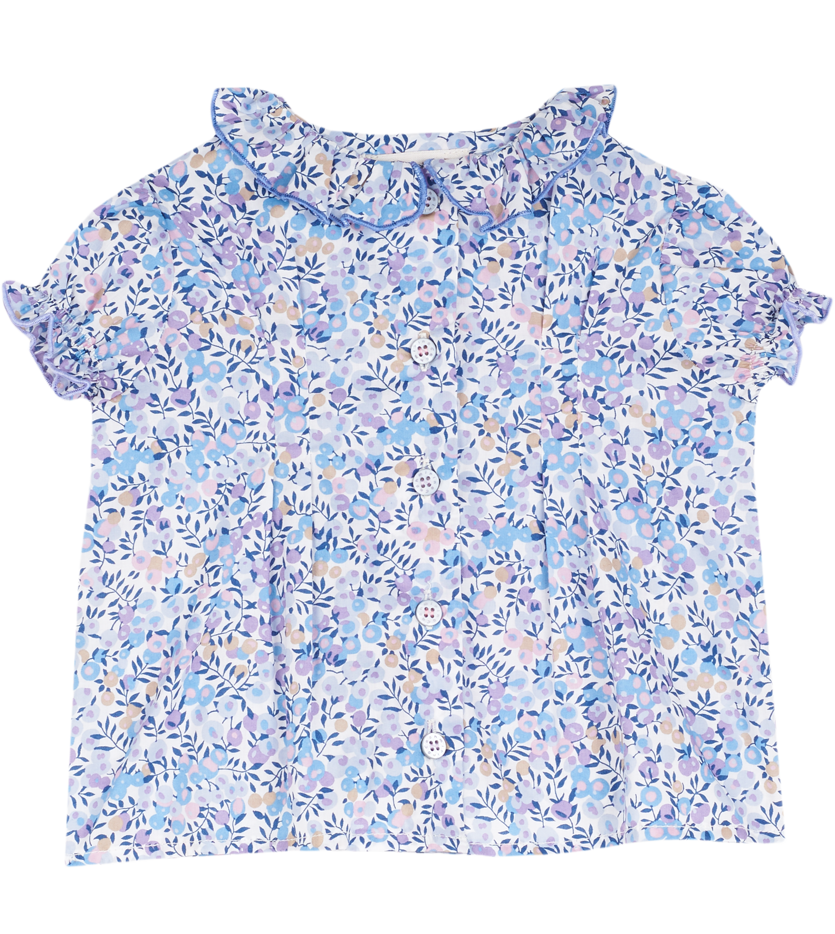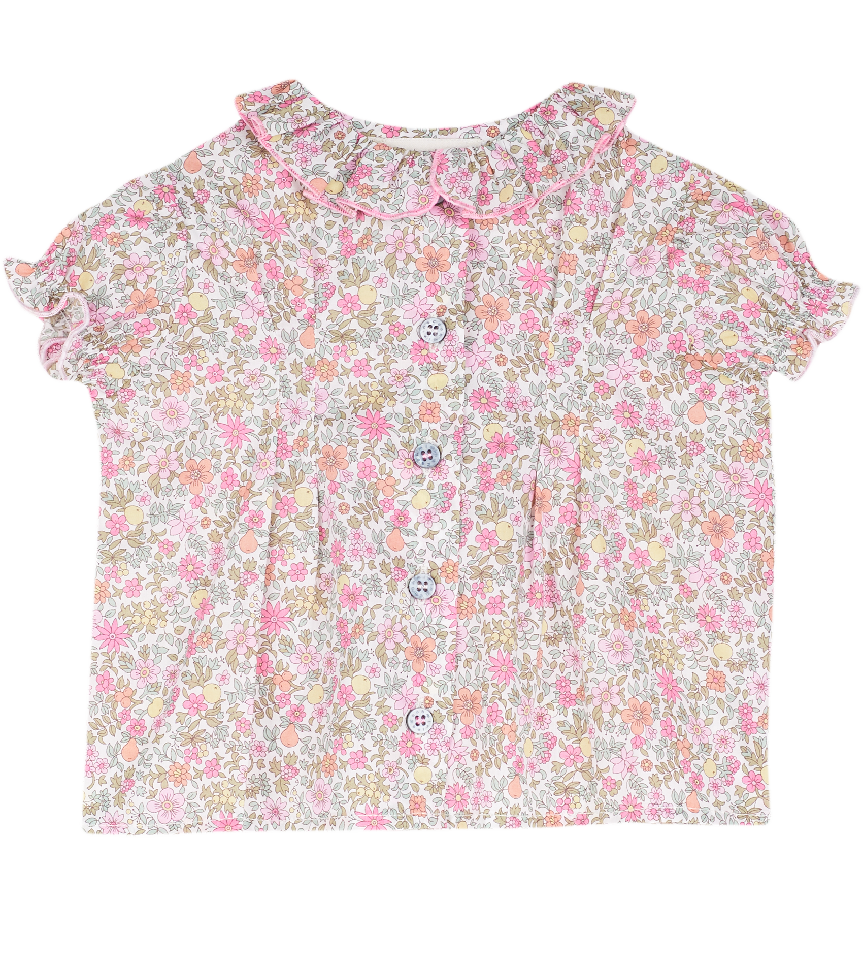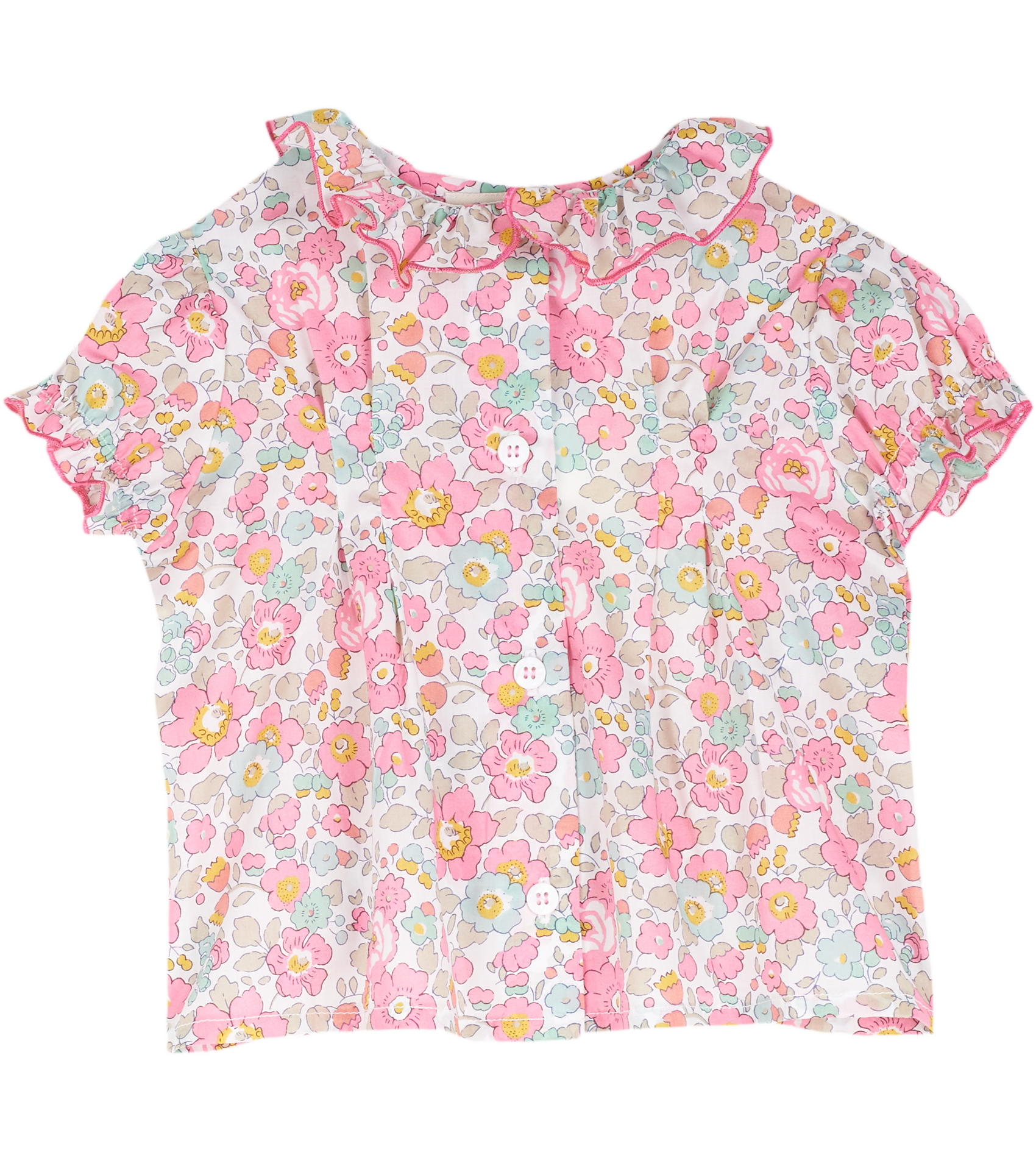 The Trudy Baby Girl blouse, made from 100% cotton will fit in seamlessly with the summer scenery. The breathable cotton composition of this blouse is brought to life with a range of signature, colourful prints. Ruffled collar, Puff sleeves, Dart detailing, Signature Cashmirino buttons.