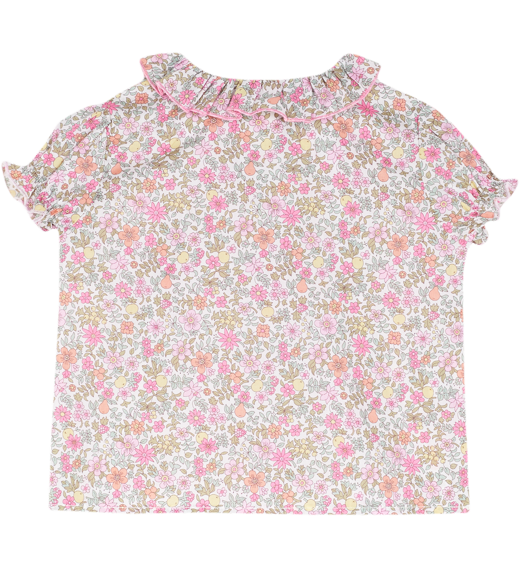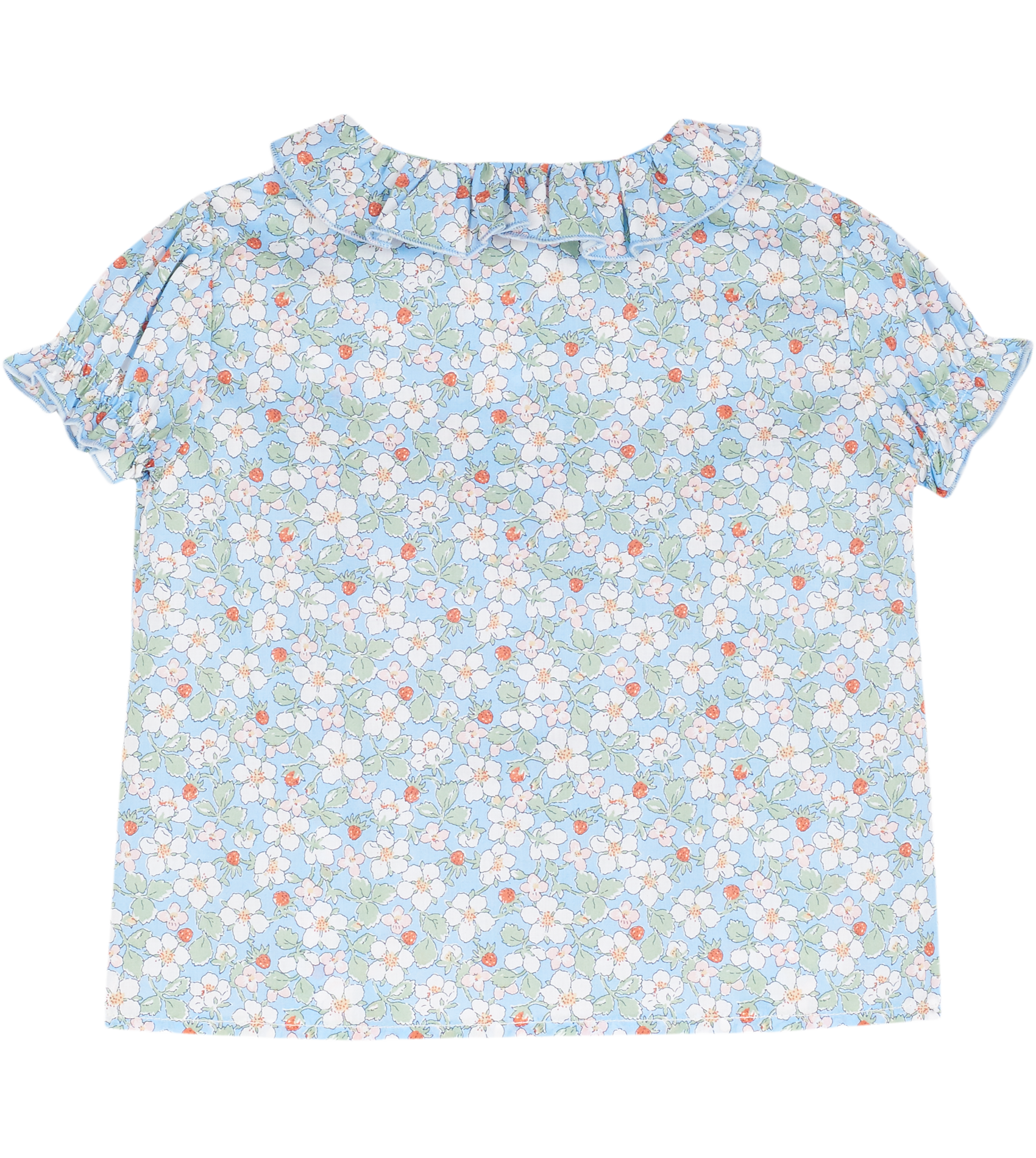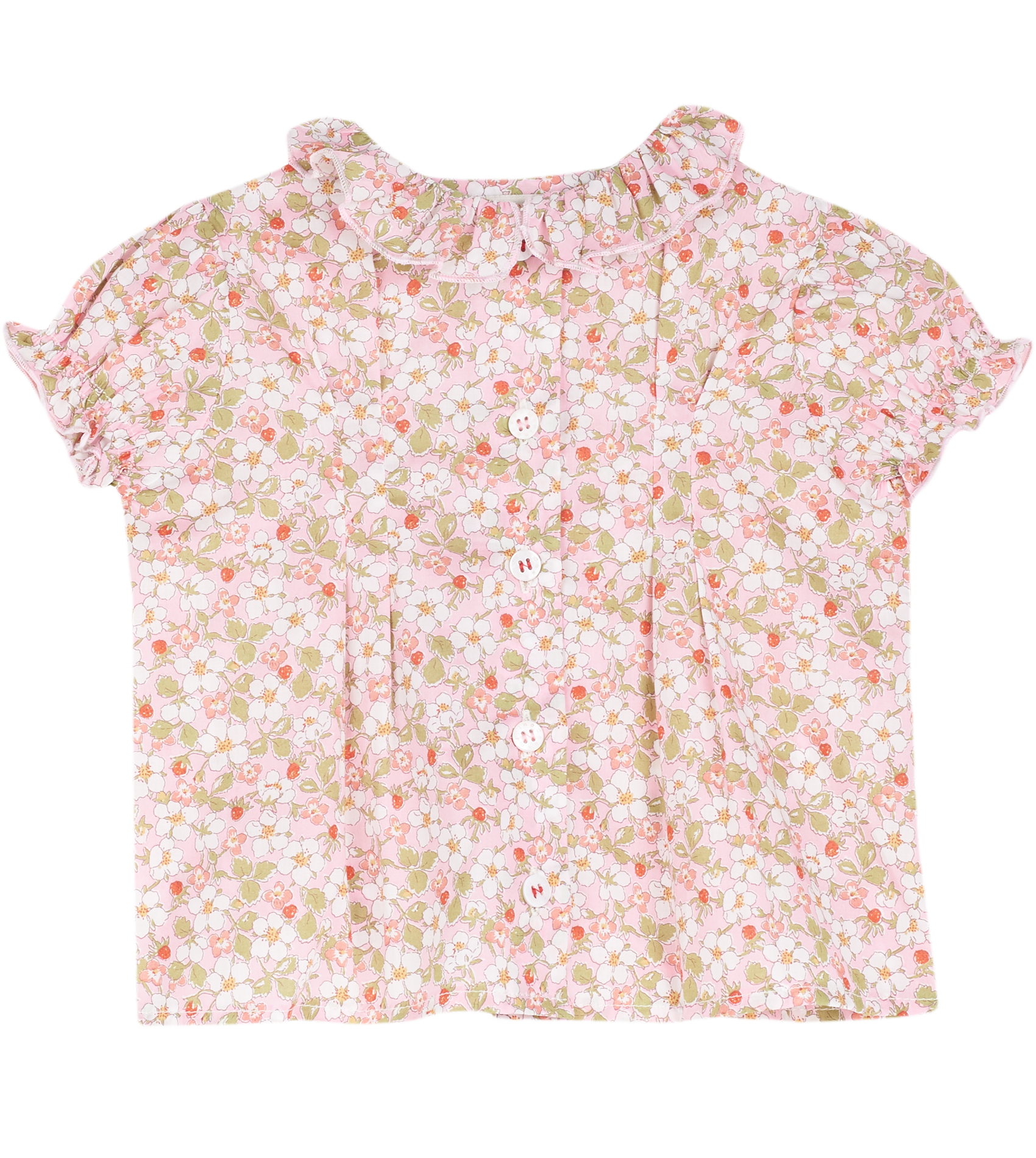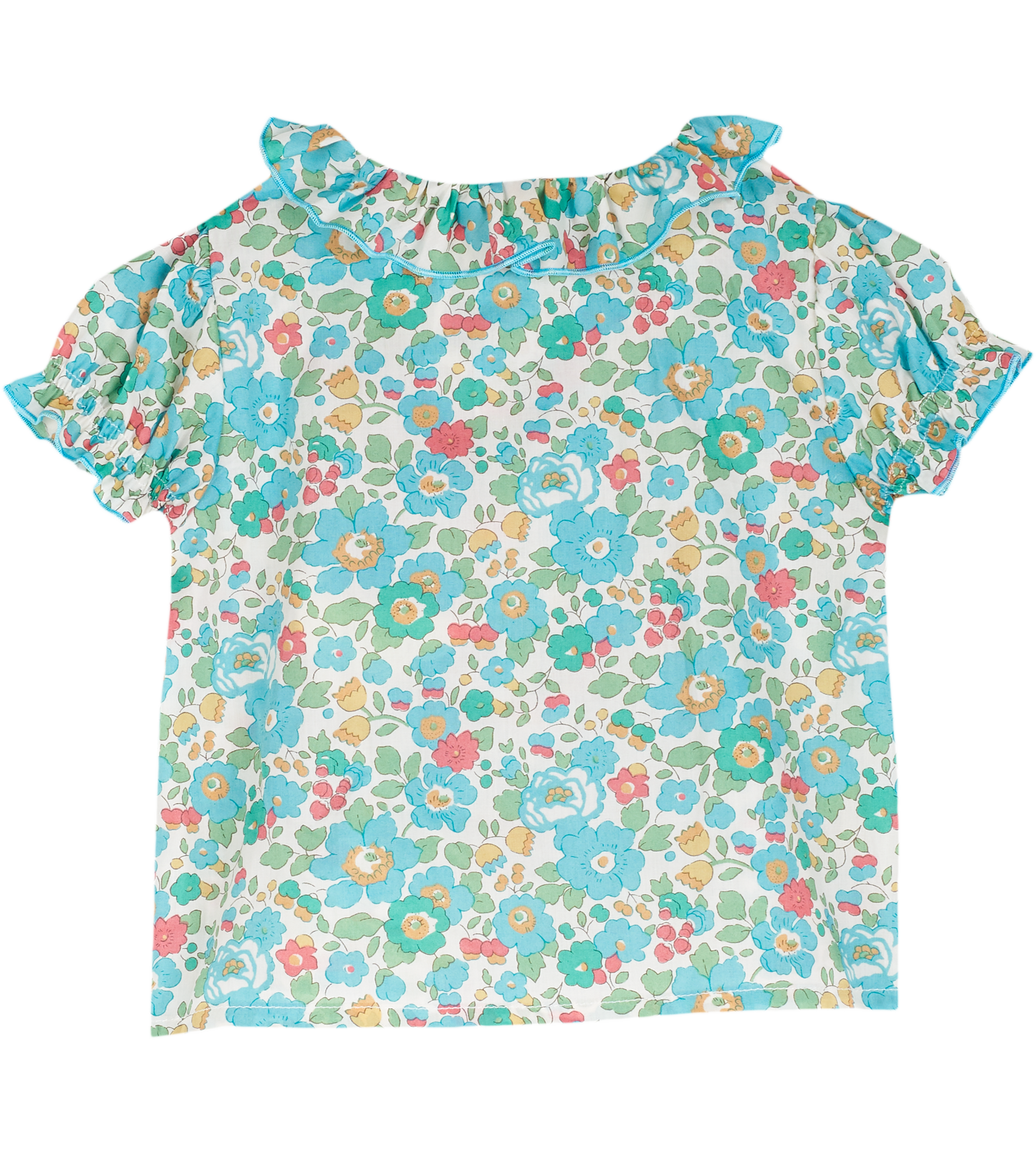 The Trudy Baby Girl blouse, made from 100% cotton will fit in seamlessly with the summer scenery. The breathable cotton composition of this blouse is brought to life with a range of signature, colourful prints. Ruffled collar, Puff sleeves, Dart detailing, Signature Cashmirino buttons.