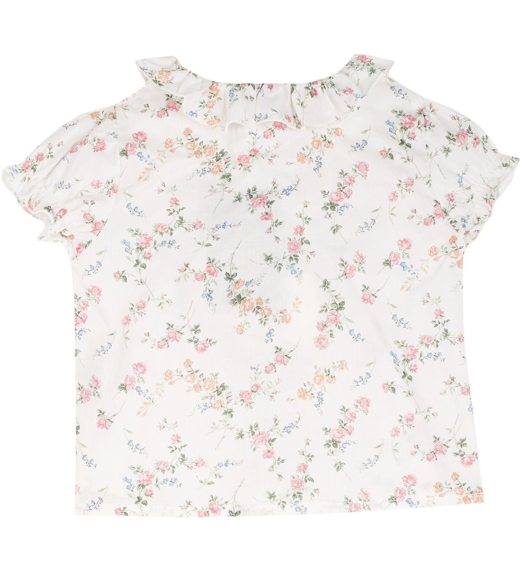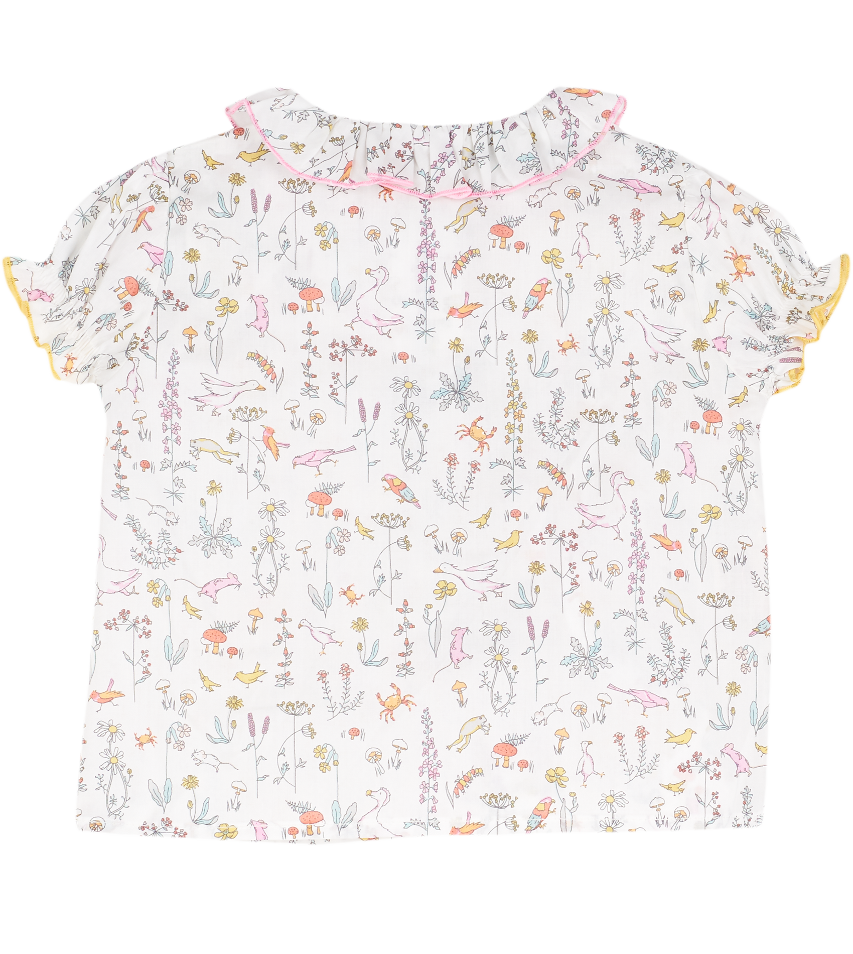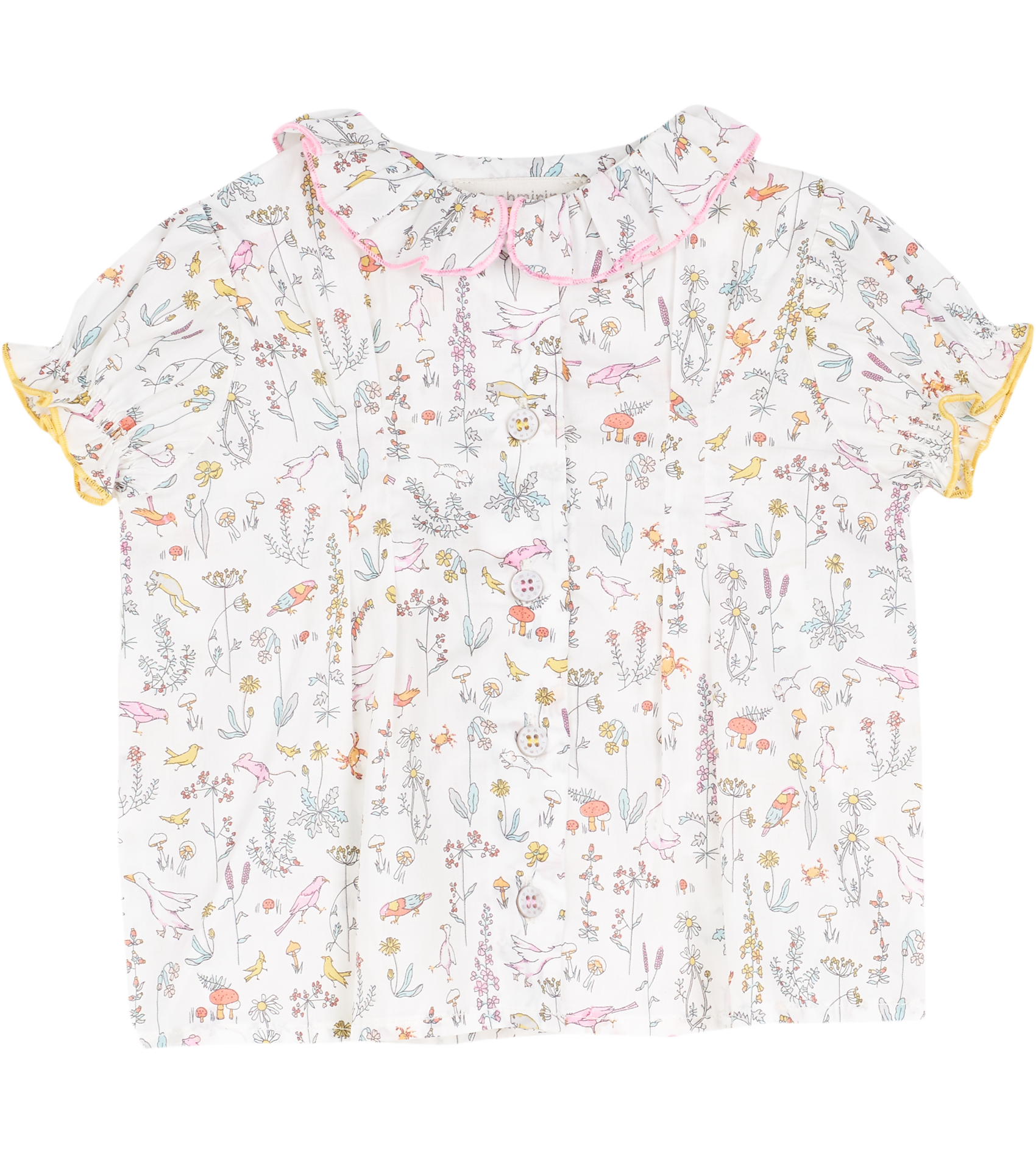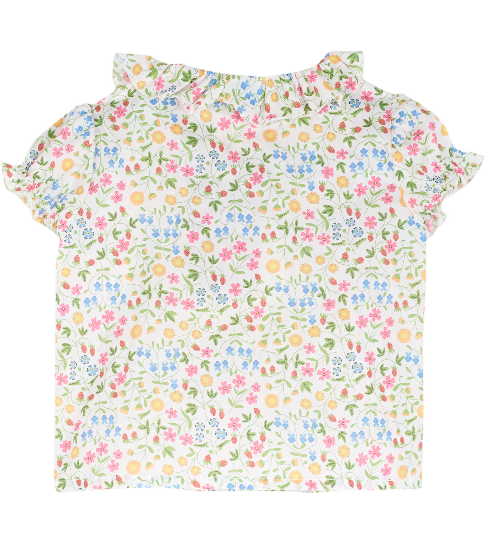 The Trudy Baby Girl blouse, made from 100% cotton will fit in seamlessly with the summer scenery. The breathable cotton composition of this blouse is brought to life with a range of signature, colourful prints. Ruffled collar, Puff sleeves, Dart detailing, Signature Cashmirino buttons.