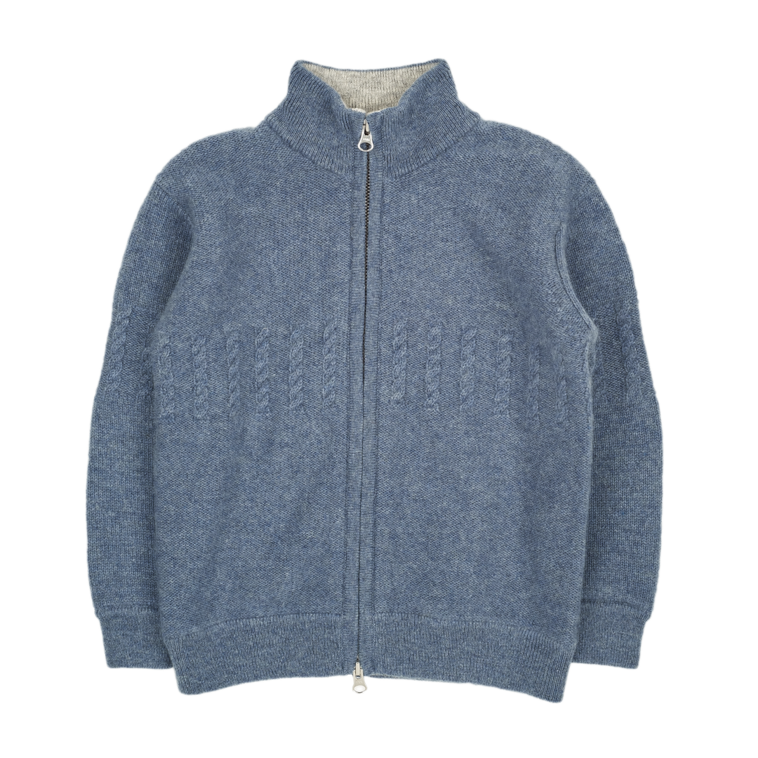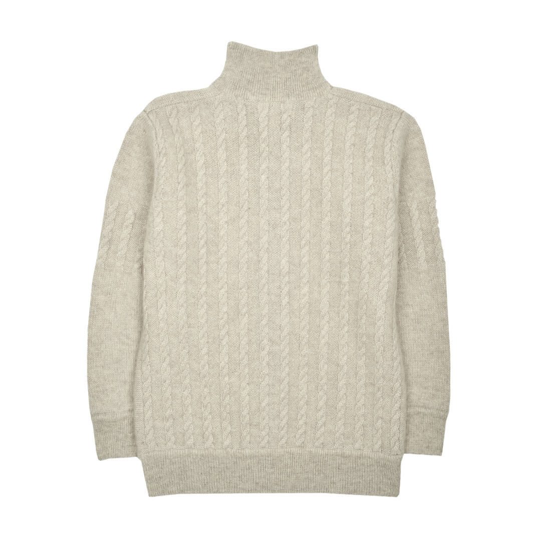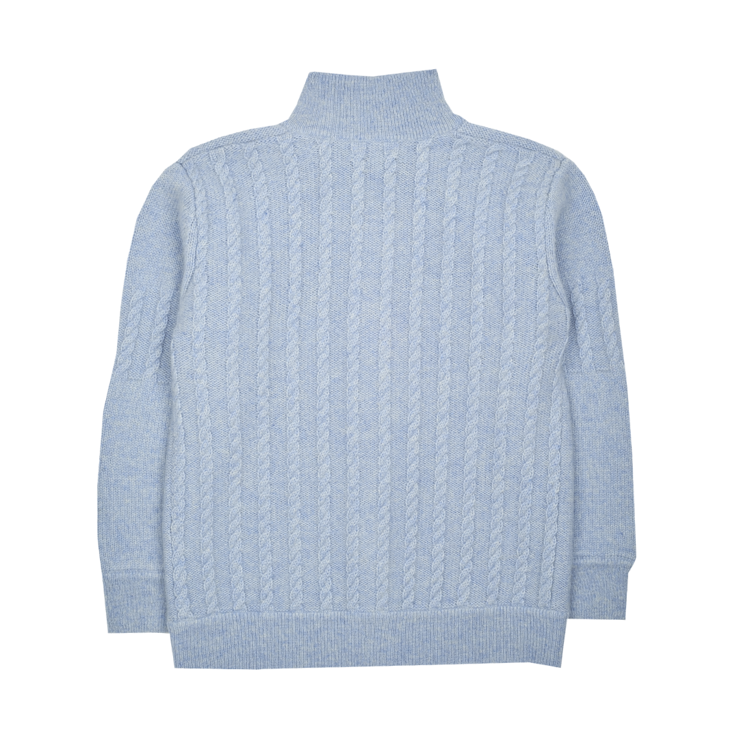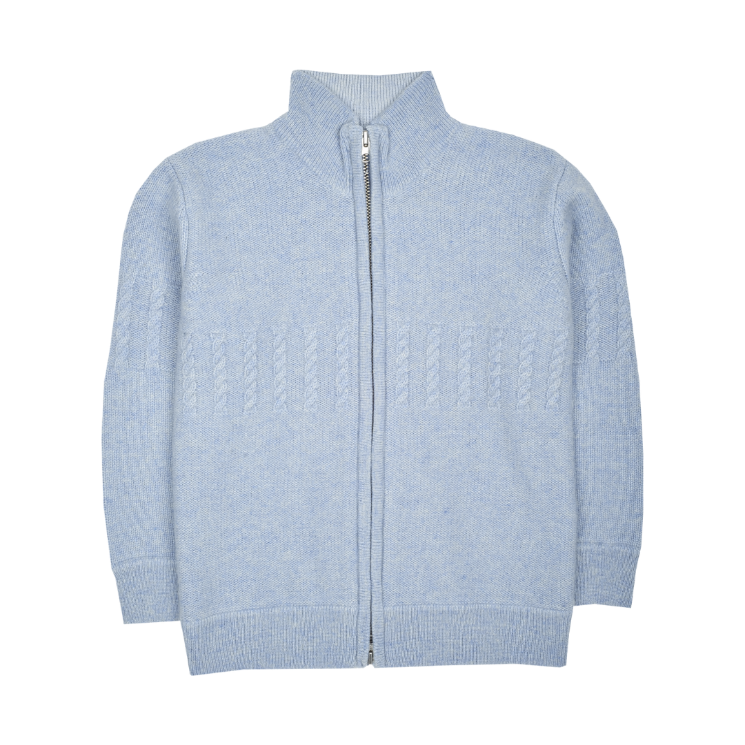 A classic 100% cashmere high neck boy cardigan with cable knit panels, long sleeves, a ribbed hem, and zip fastening. Ideal for all occasions.