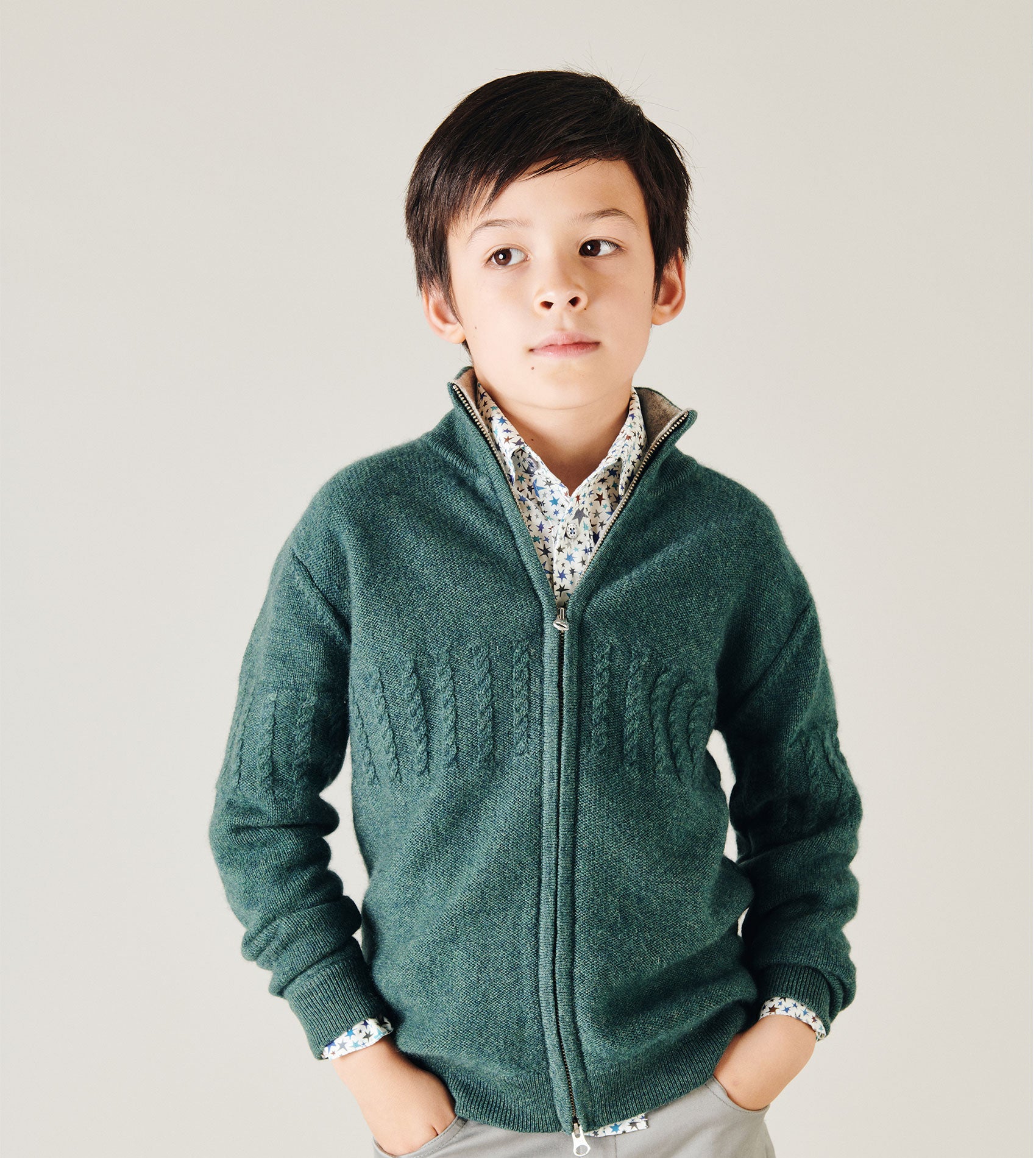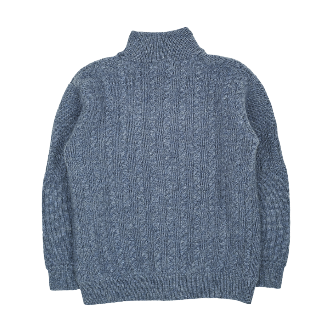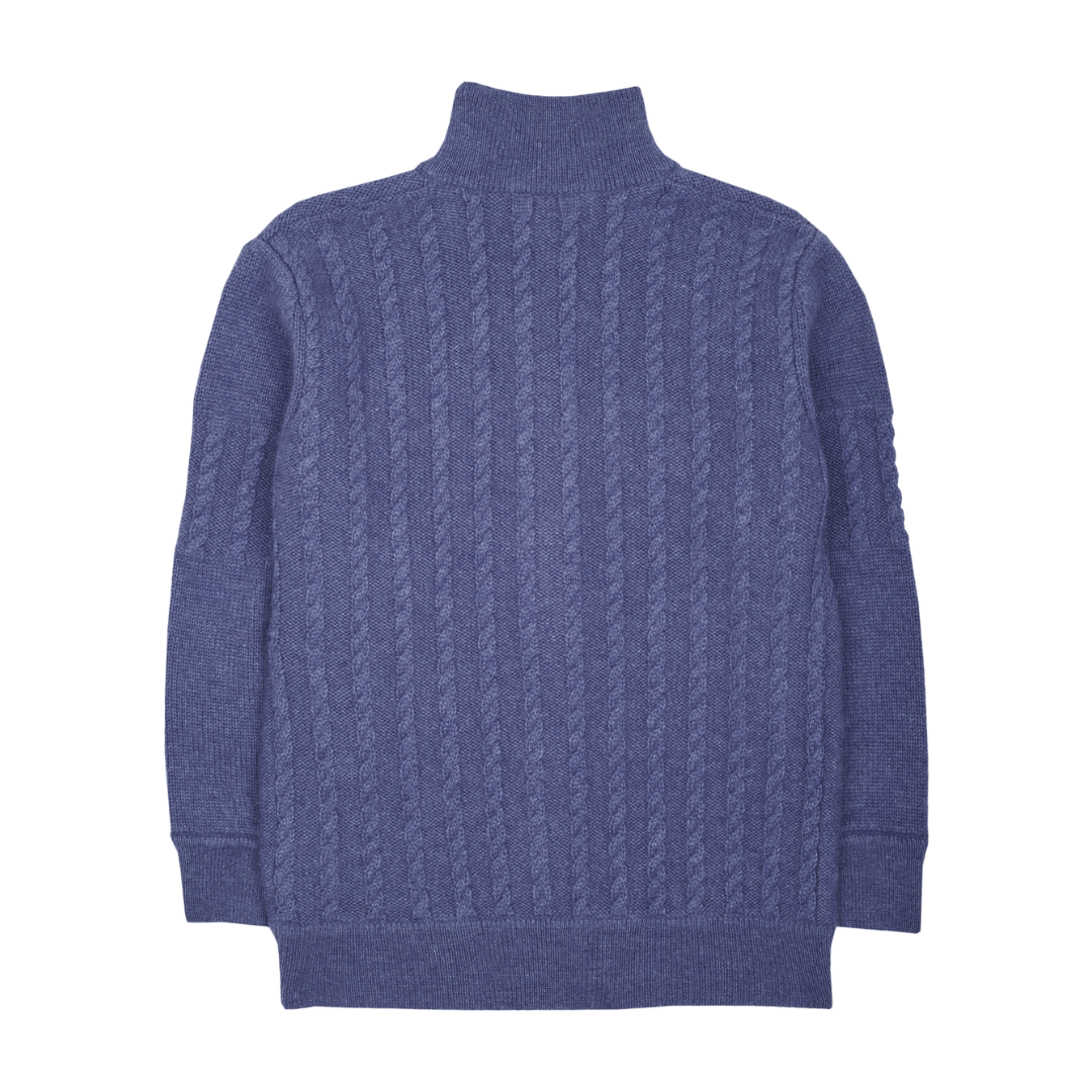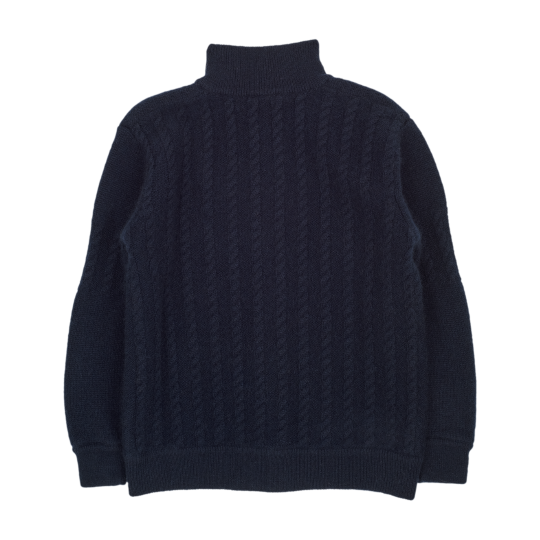 A classic 100% cashmere high neck boy cardigan with cable knit panels, long sleeves, a ribbed hem, and zip fastening. Ideal for all occasions.