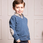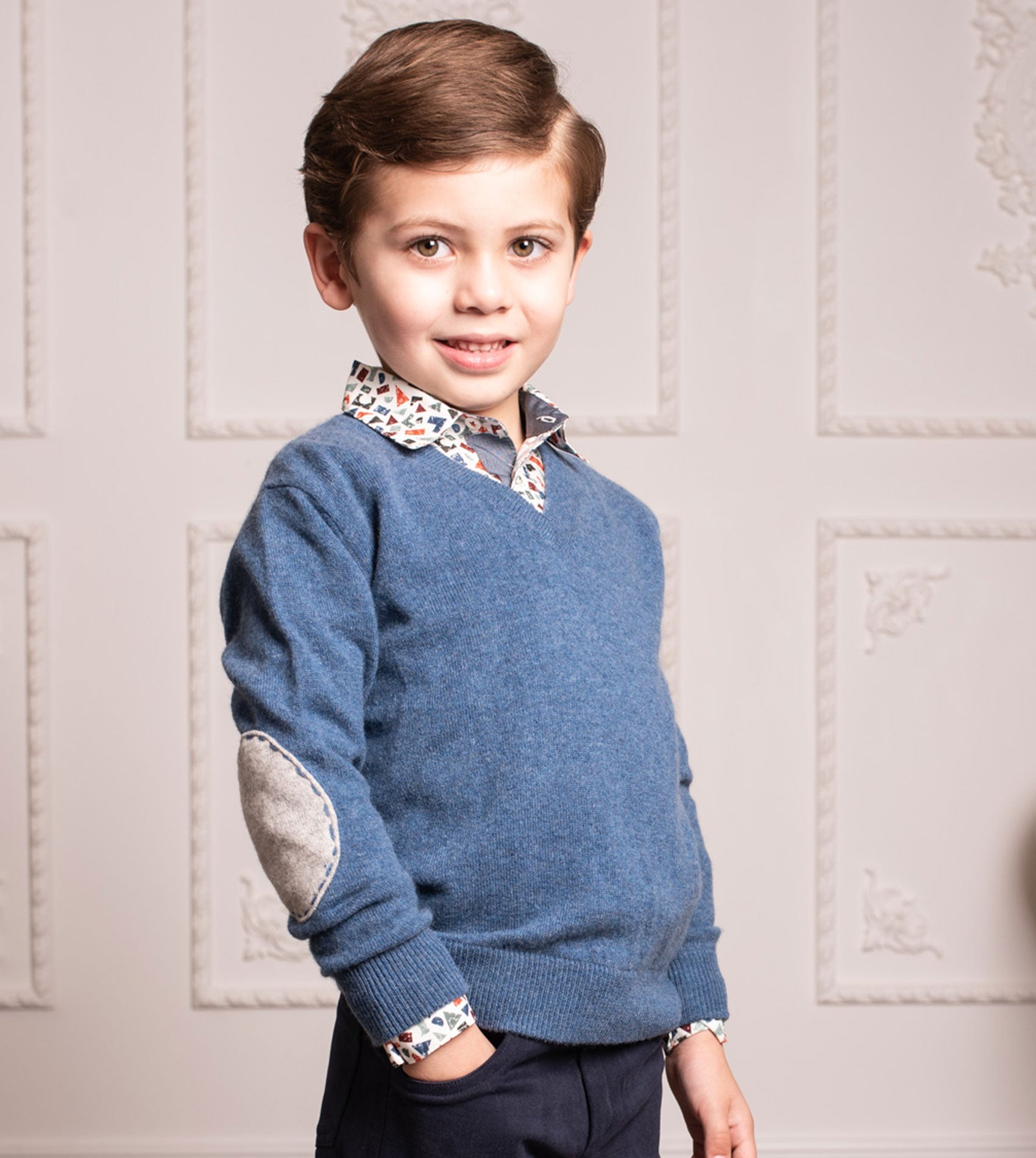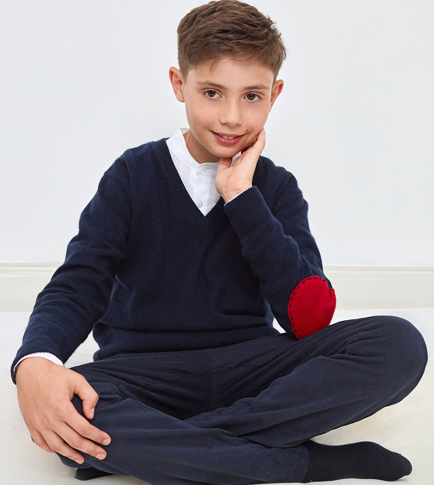 A classic v-neck boy jumper made from 100% cashmere featuring long sleeves, a ribbed hem with contrasting inside detail and stylish elbow patches.