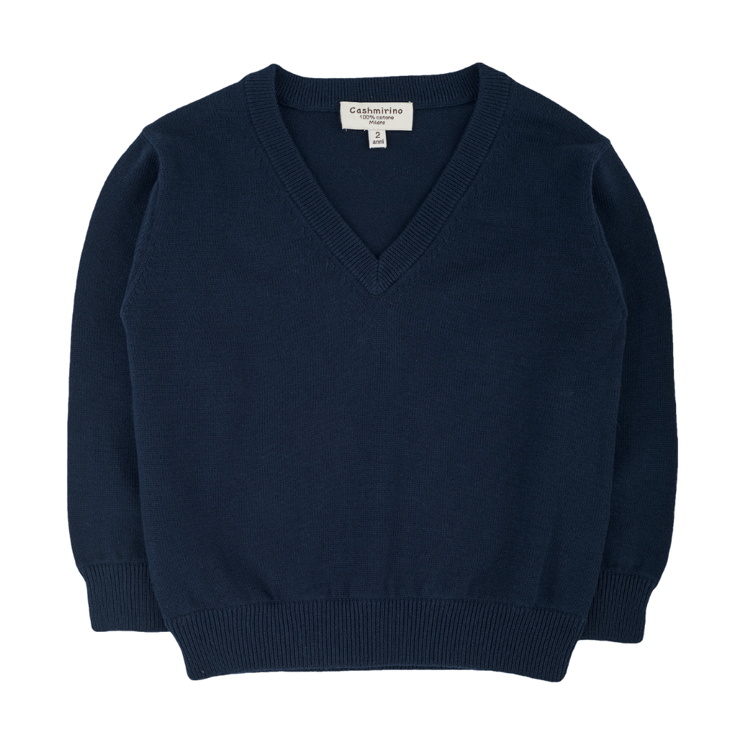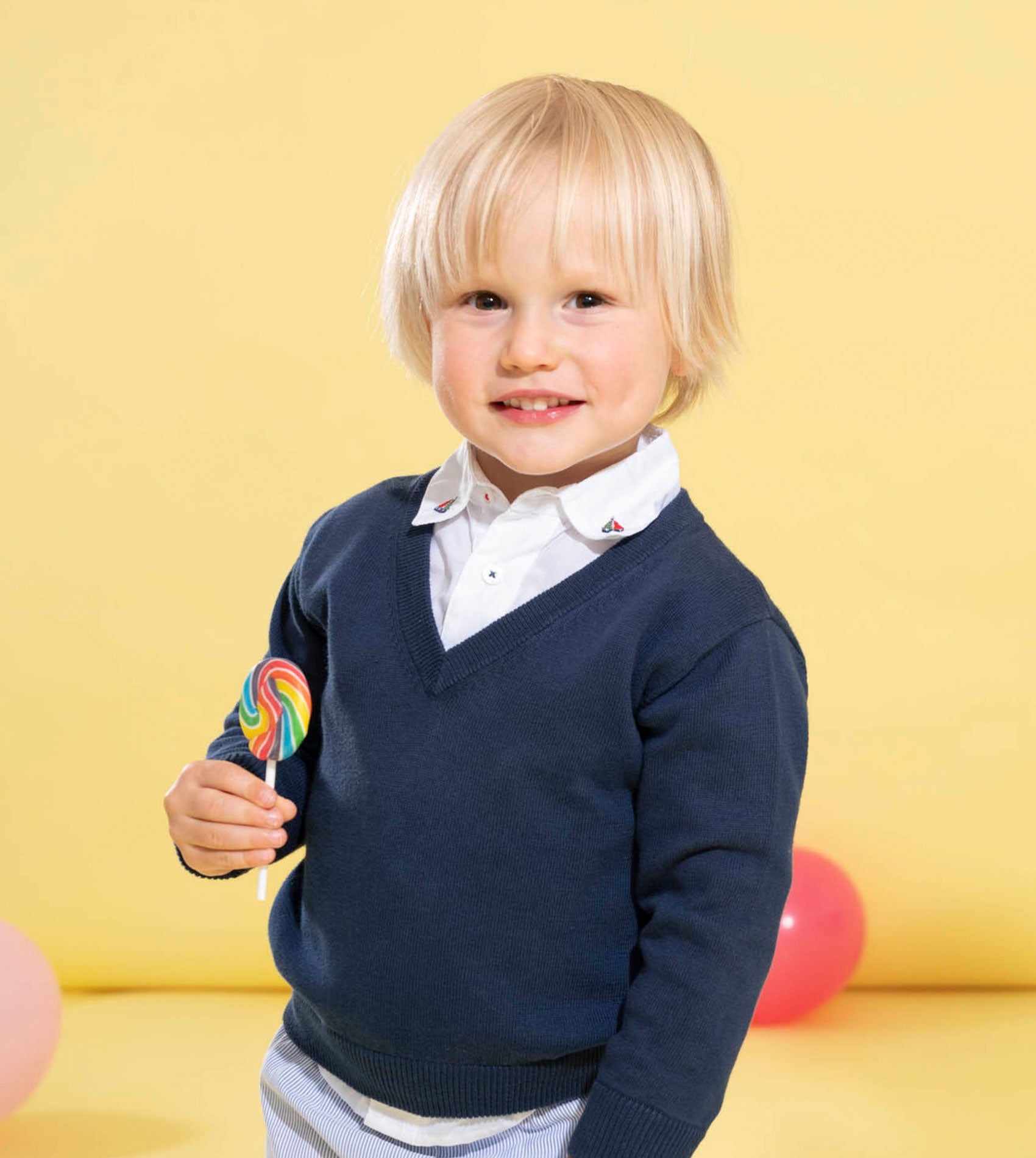 A classic boy cotton v neck jumper with long sleeves and a ribbed hem. This lightweight jumper can be used in Fall or Spring or as a layer in Winter. Available in a range of sizes.