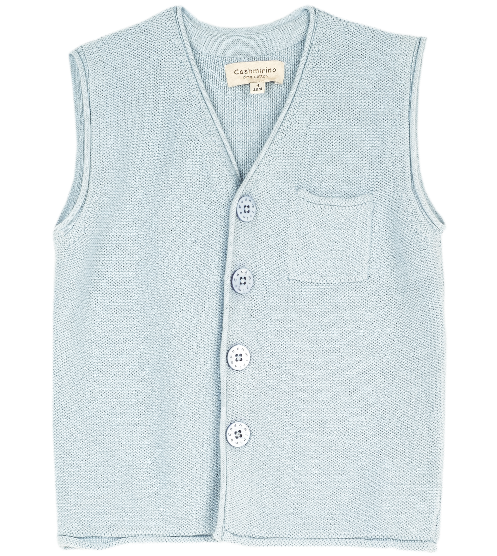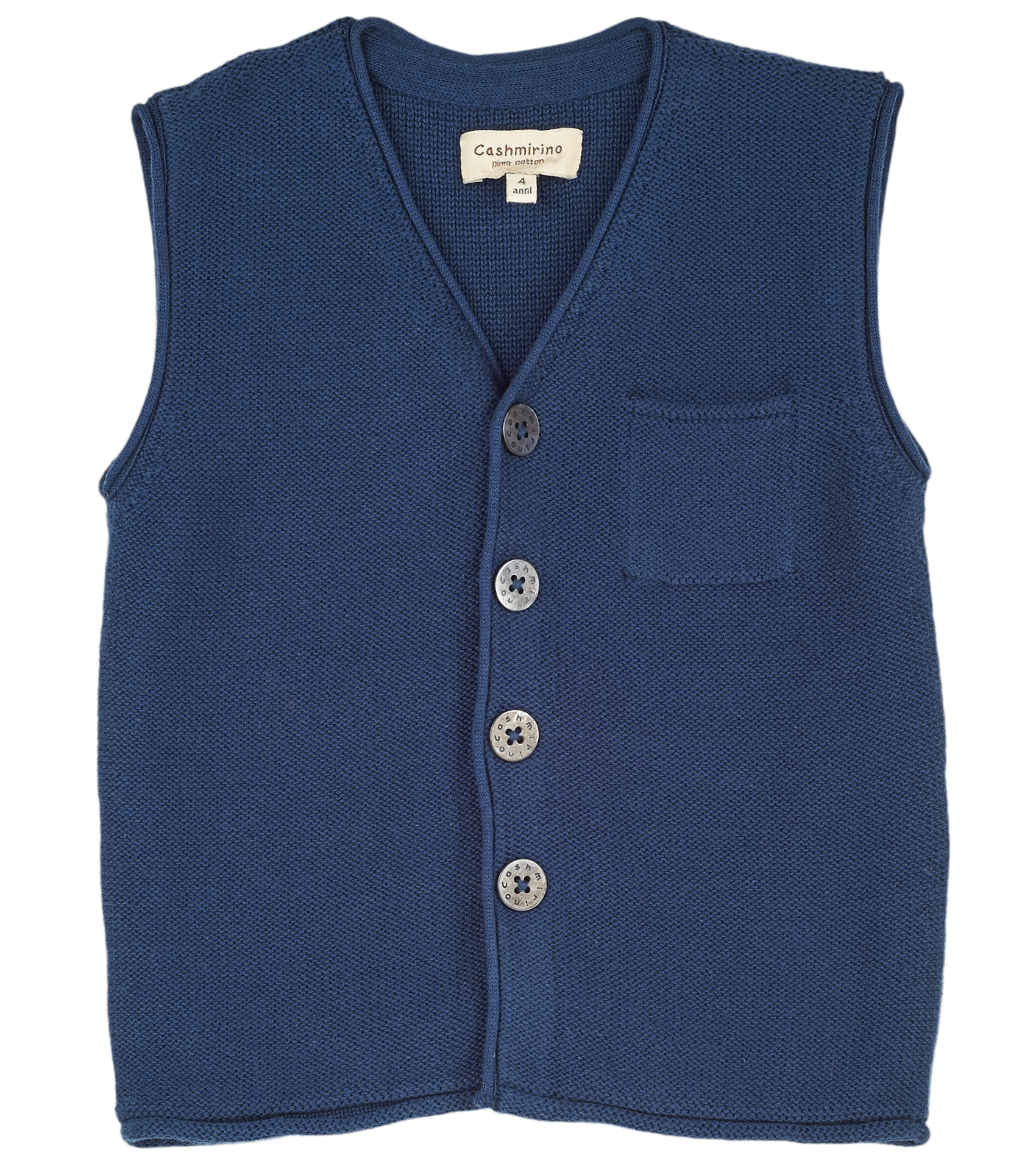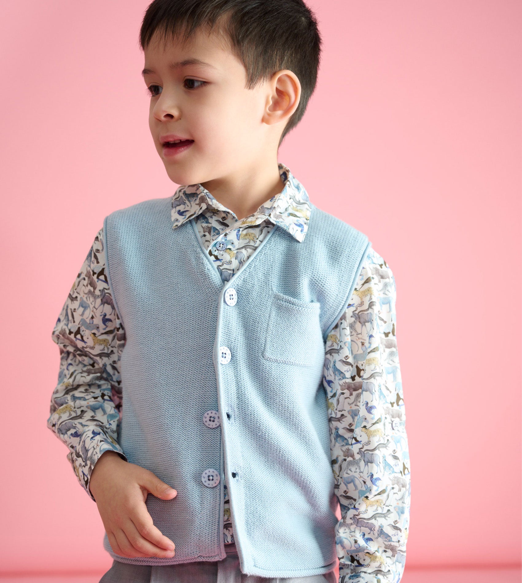 A sleeveless boy cardigan made from 100% pima cotton which features a small front pocket, a V-neck collar and a button fastening. Perfect for layering over a shirt or romper. This versatile lightweight cardigan is a must have for spring/summer time.