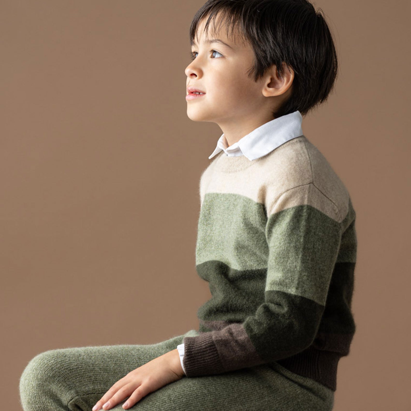 Our Giulio Jumper is just adorable for your little one. Made with 100% Cashmere, it is naturally breathable and comfortable. This jumper features horizontal stripes and an internal colour contrast. Great for everyday activities, whether it's jumping in the autumn leaves or sledging in the snow, they will be cosy and comfortable all day long.