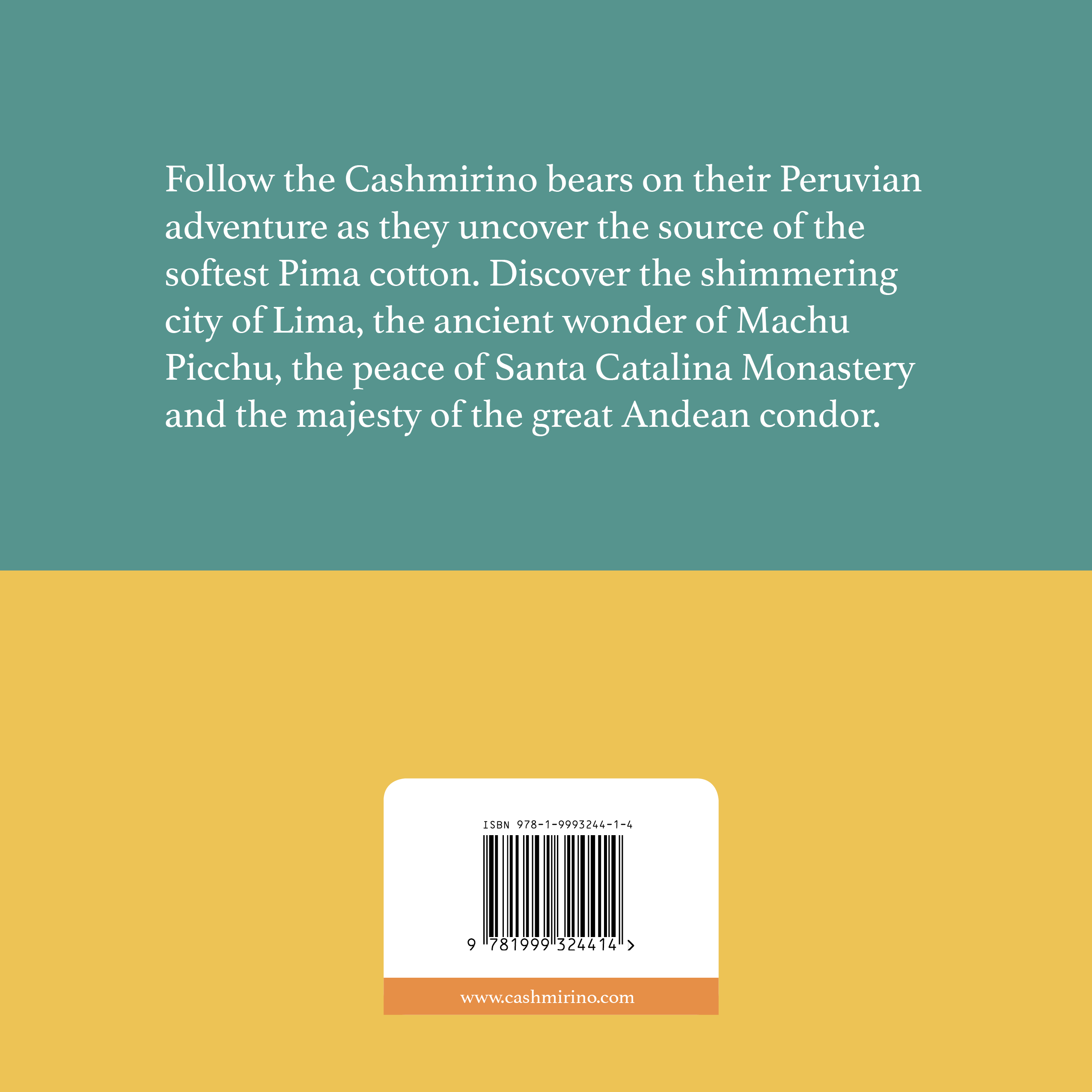 Follow the Cashmirino bears in this baby picture book on their Peruvian adventure as they uncover the source of the softest Pima cotton. Discover the shimmering city of Lima, the ancient wonder of Machu Picchu, the peace of Santa Catalina Monastery and the majesty of the great Andean condor.