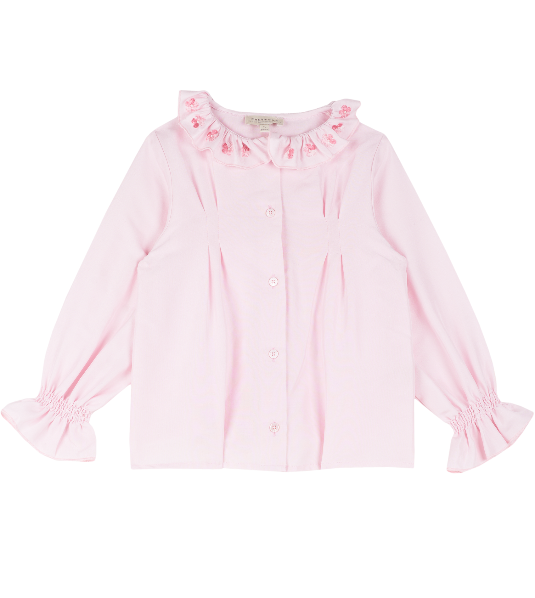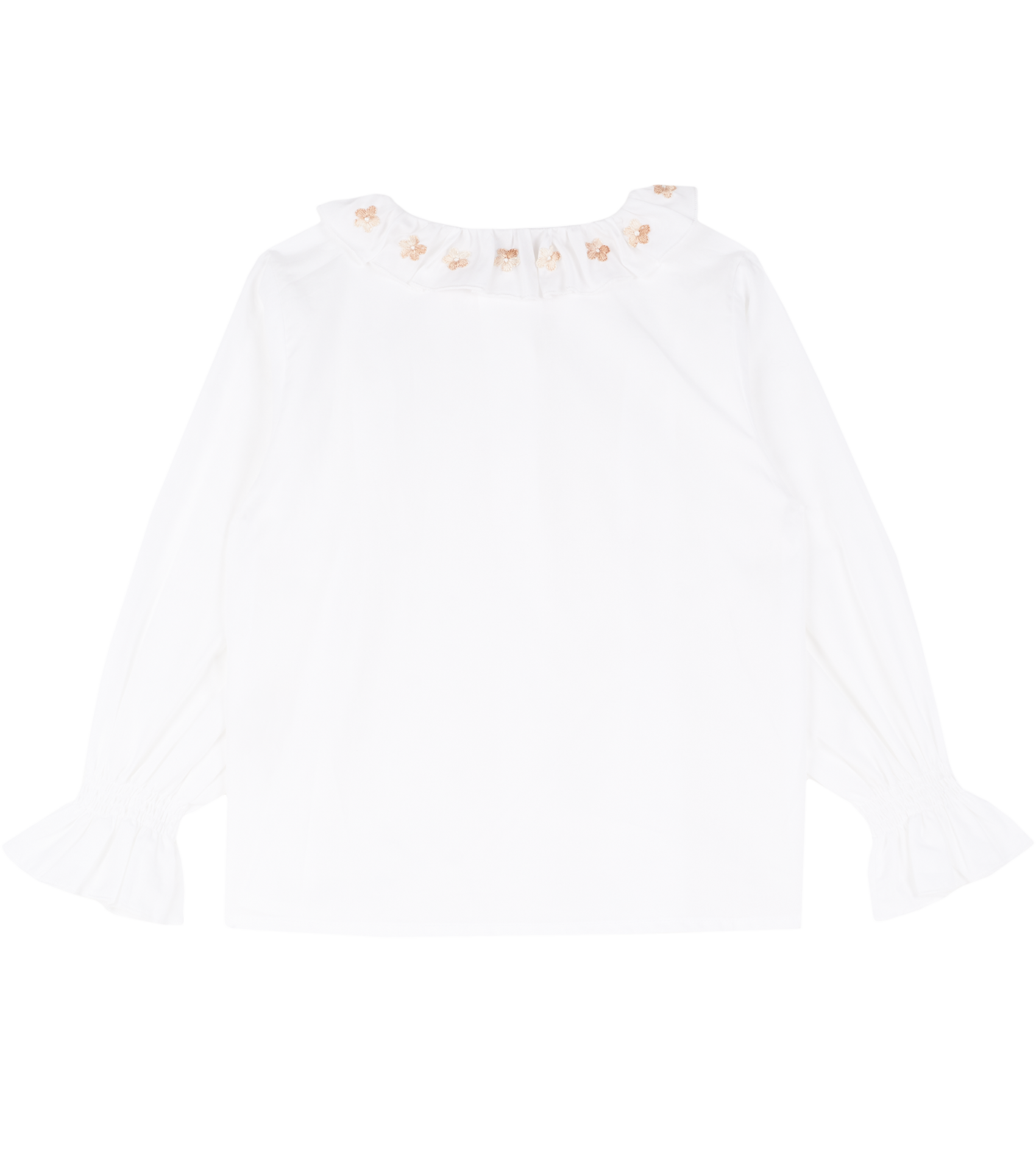 The Clementine Blouse is crafted from 100% soft, breathable cotton, offering comfort and versatility for any occasion. Featuring hand-embroidered floral details on the collar, it brings a touch of artisanal elegance to your wardrobe.