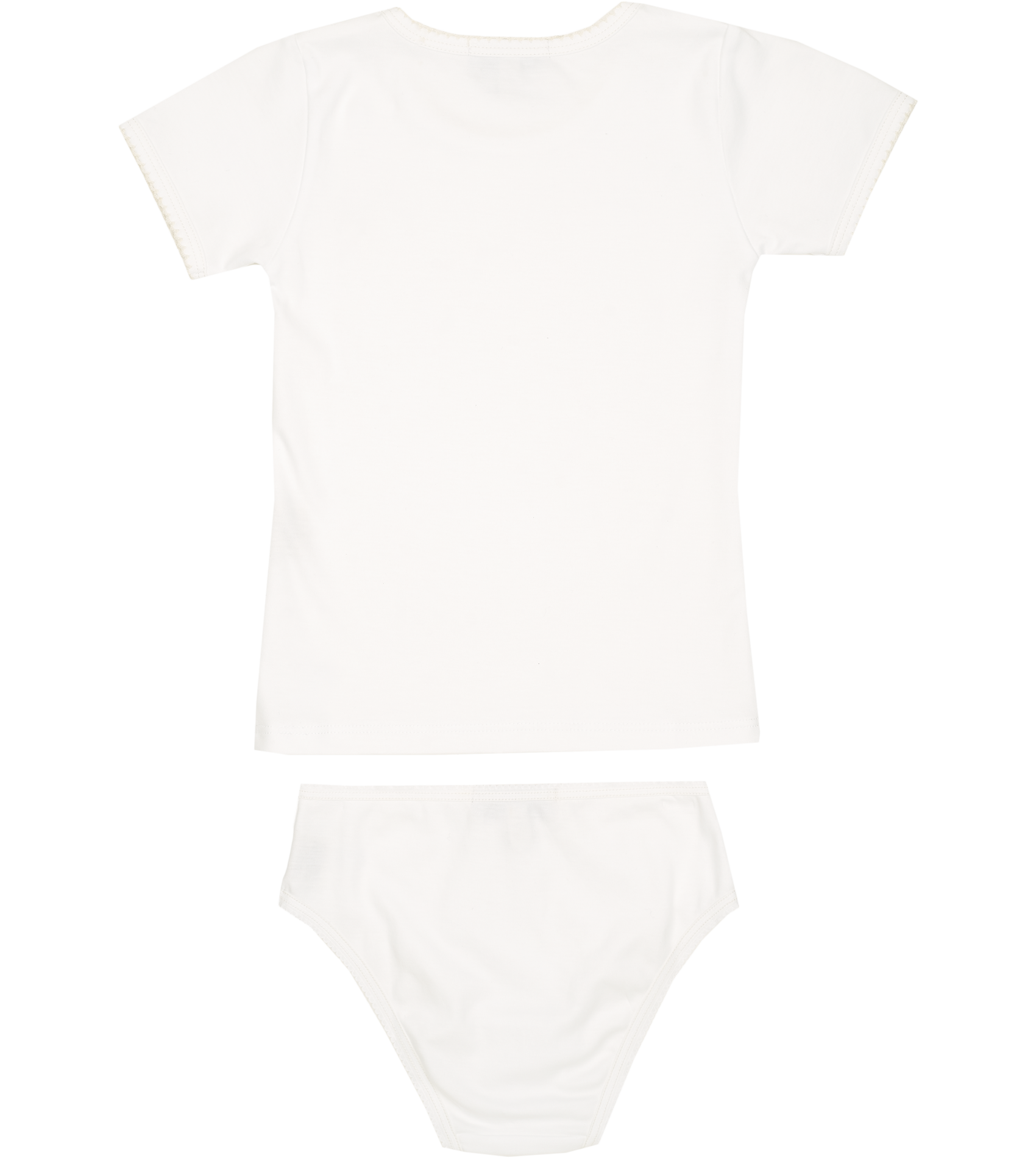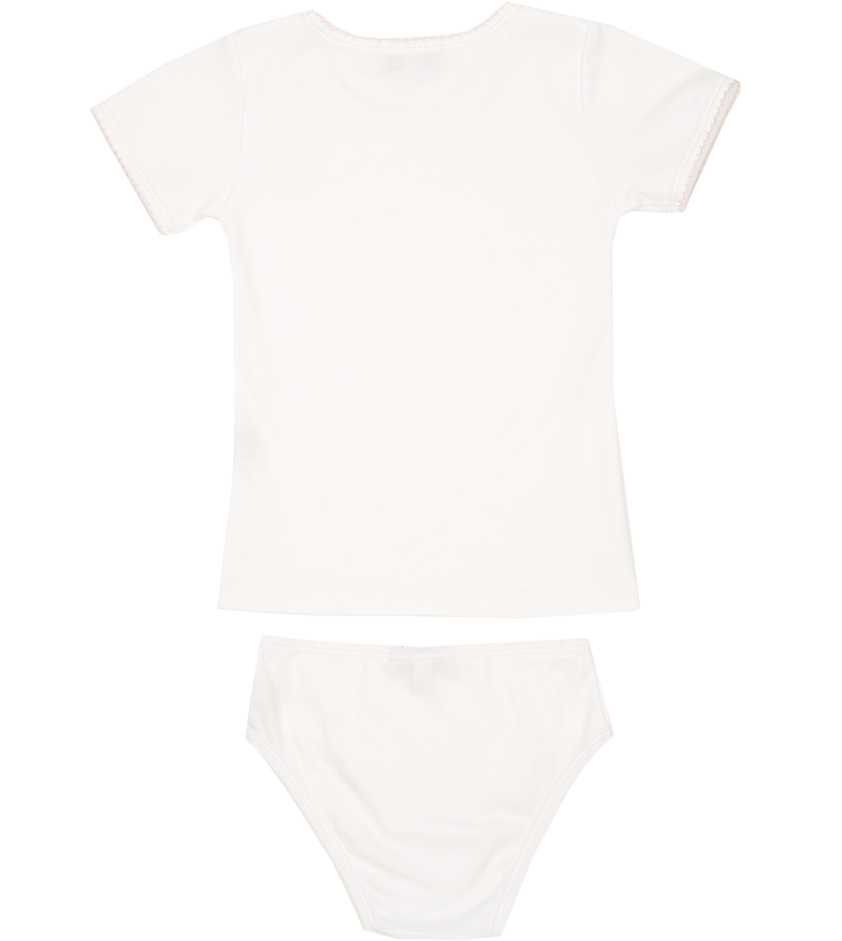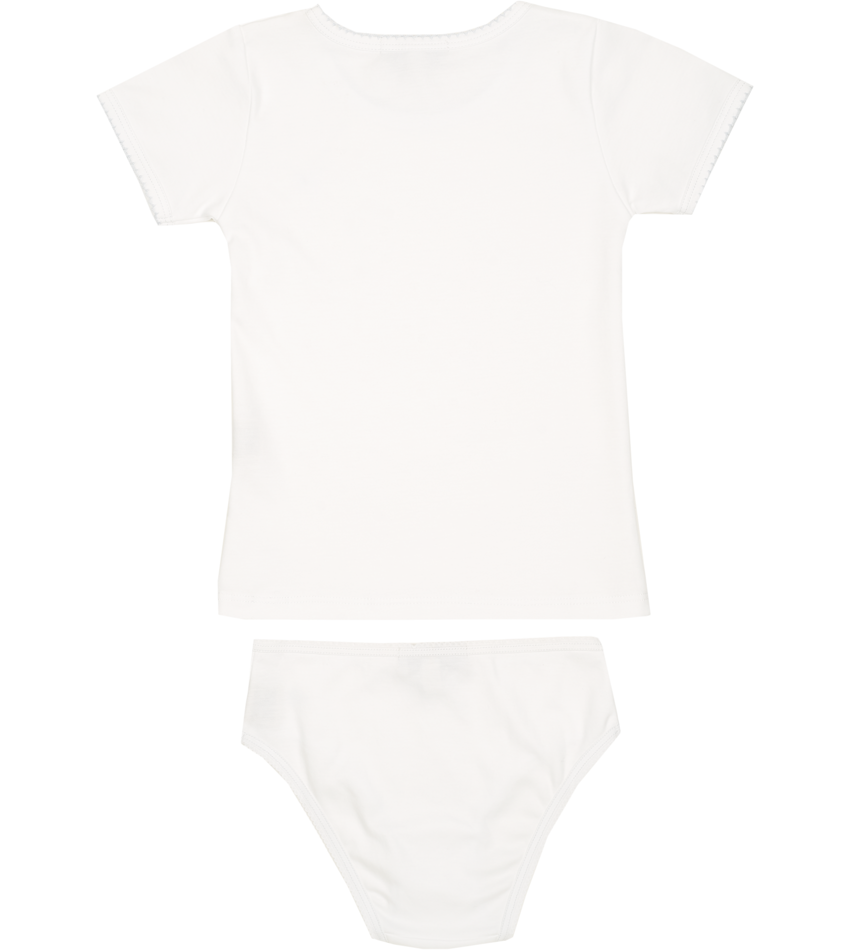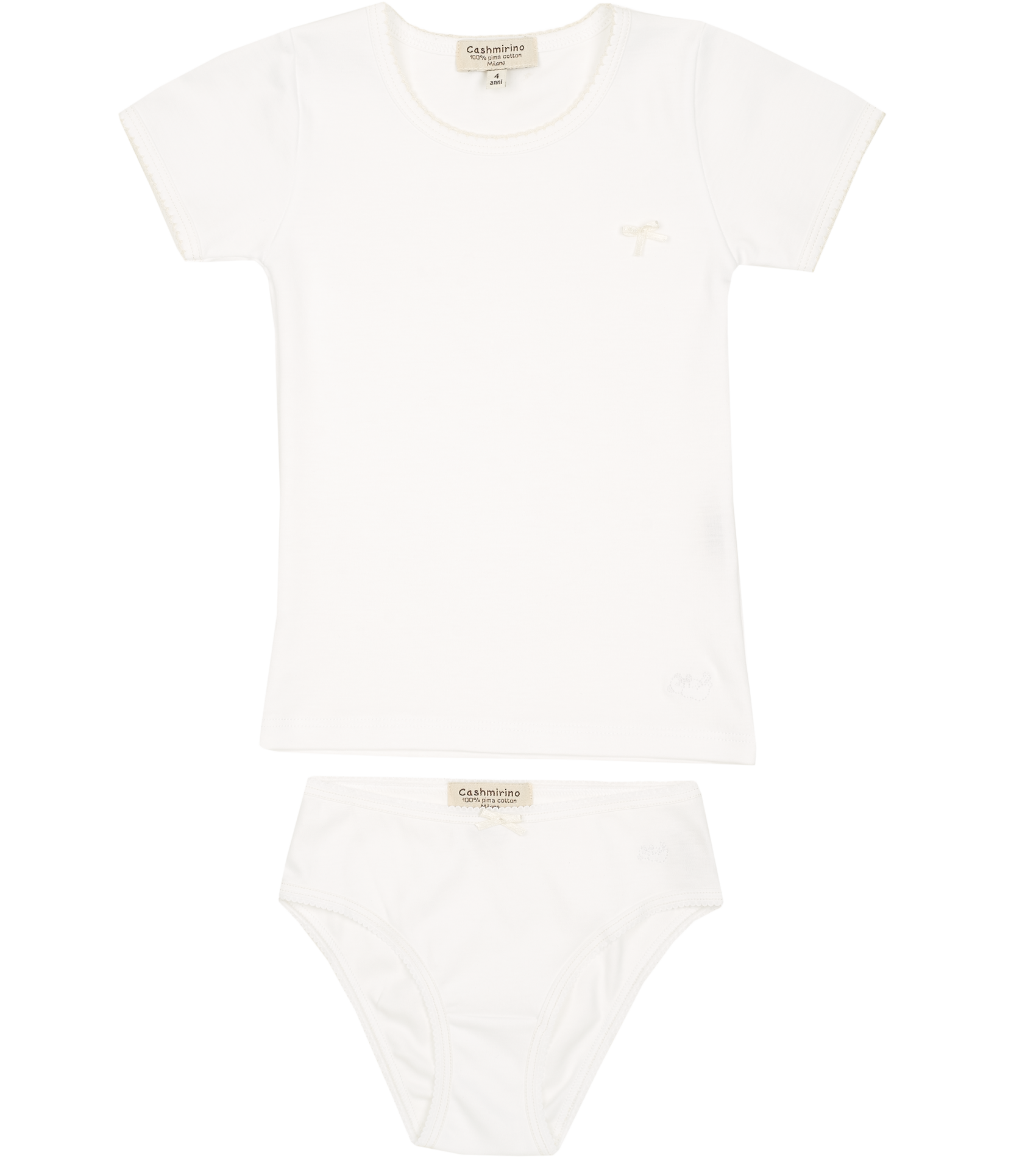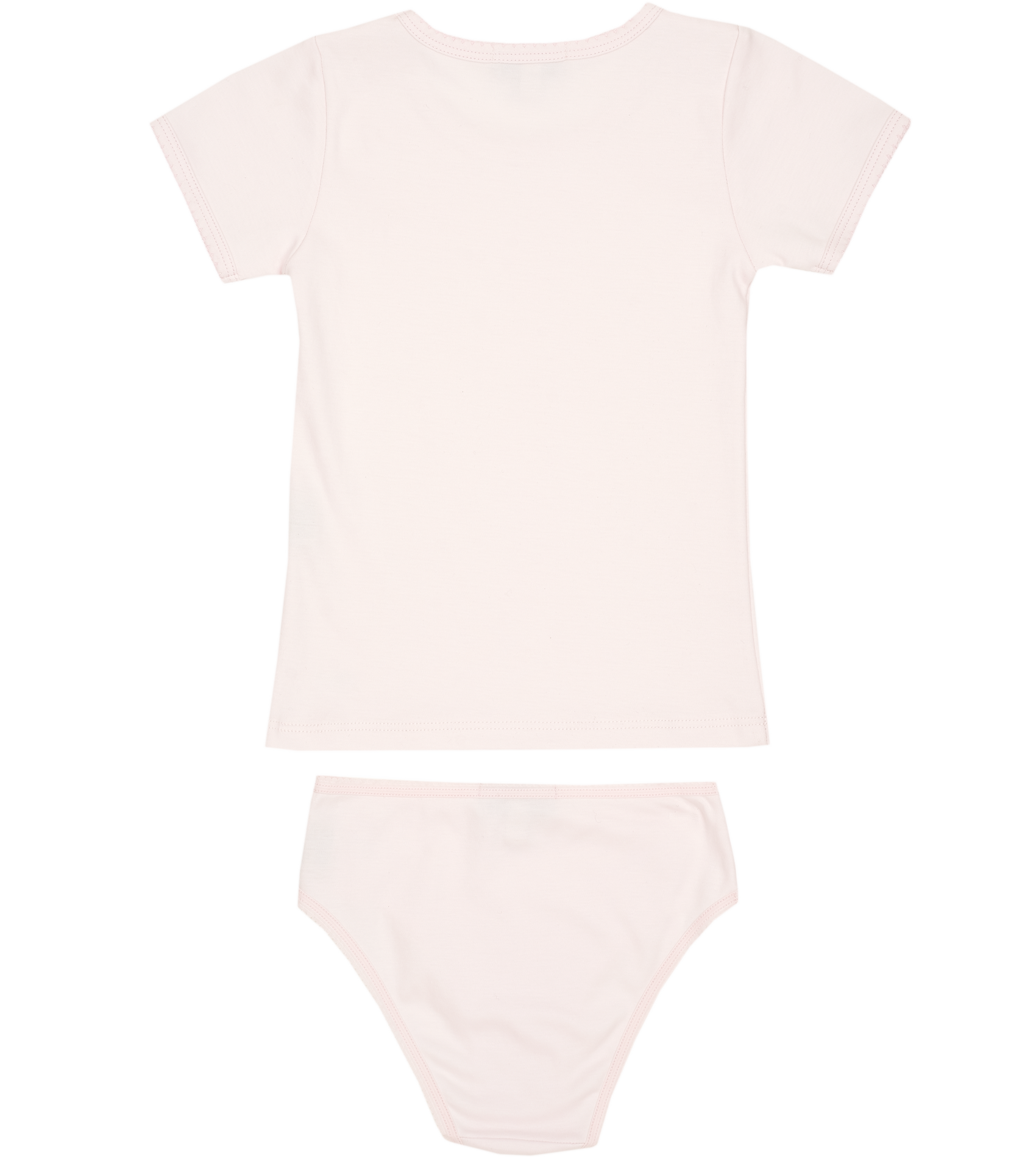 Pretty, comfortable and breathable cotton girl T-Shirt with matching pants set, featuring a delicate bow detail on the T-shirt and on the front of the pants. Perfect must-have pieces.