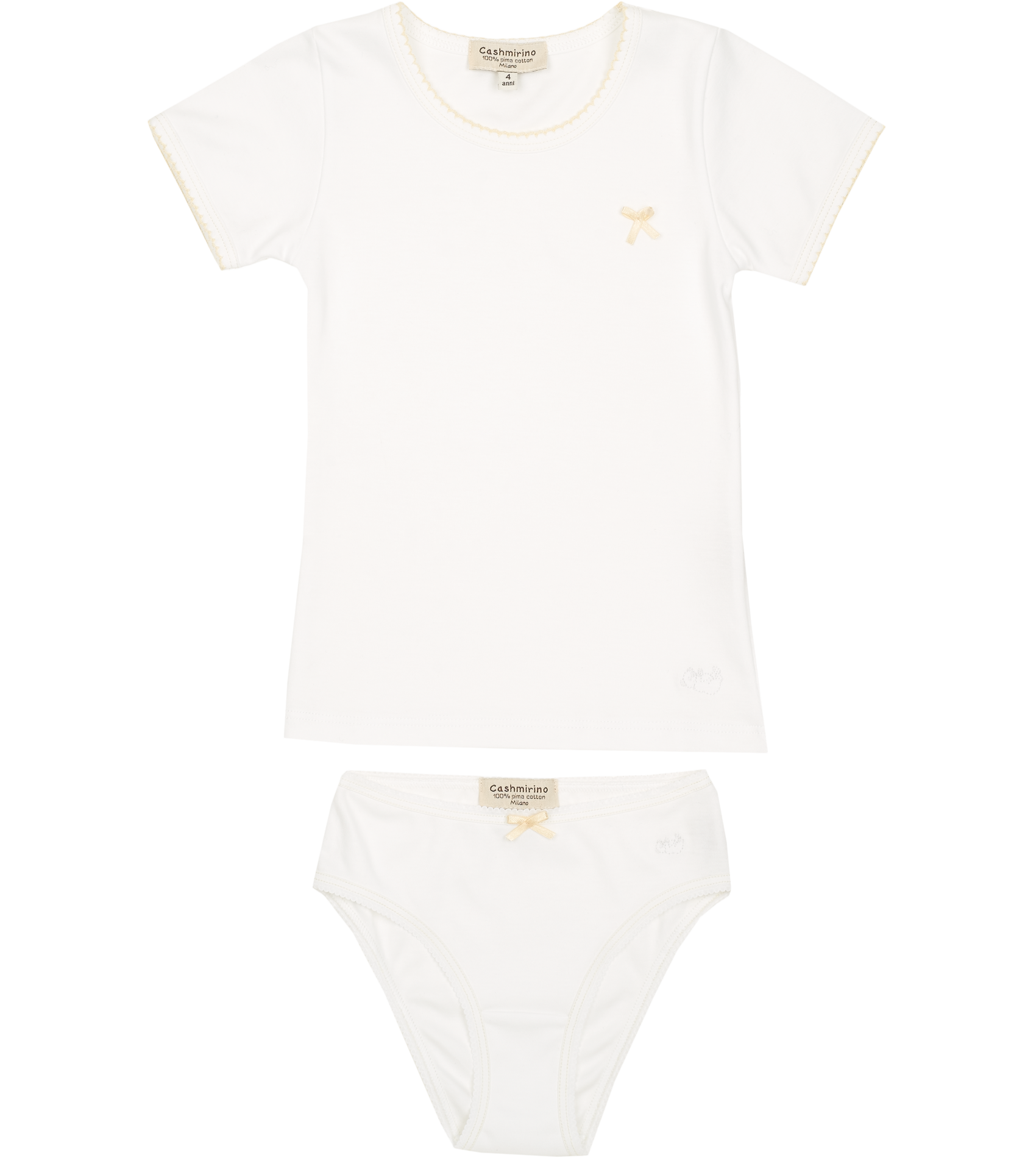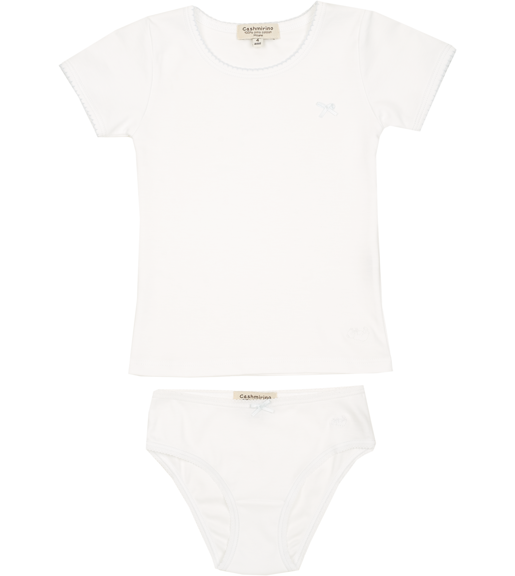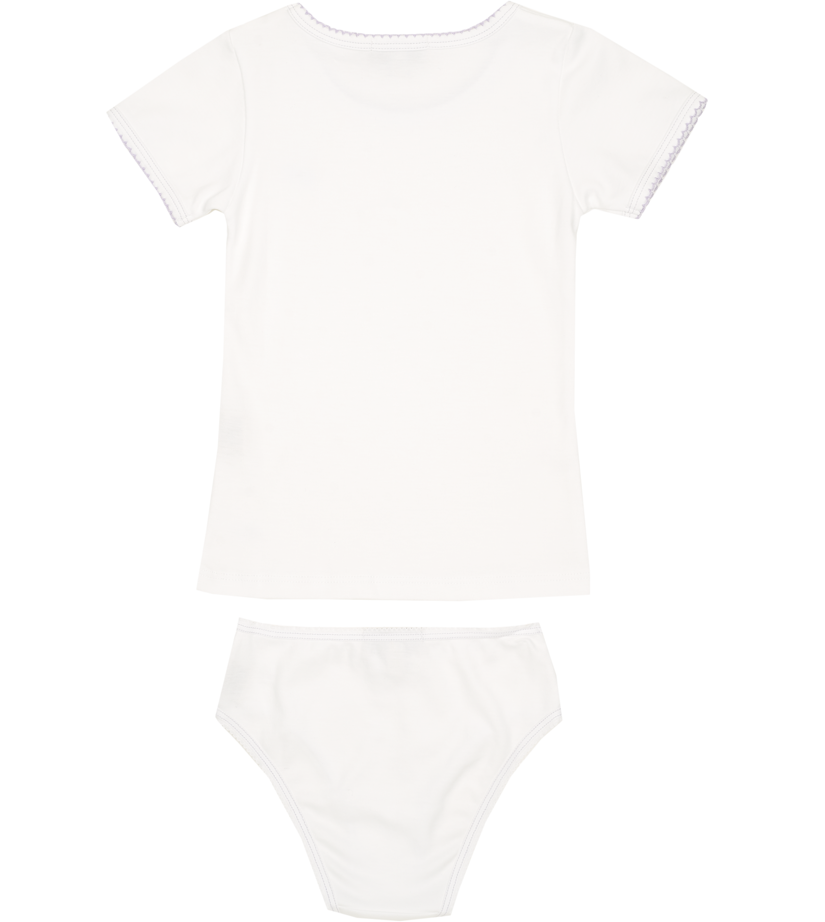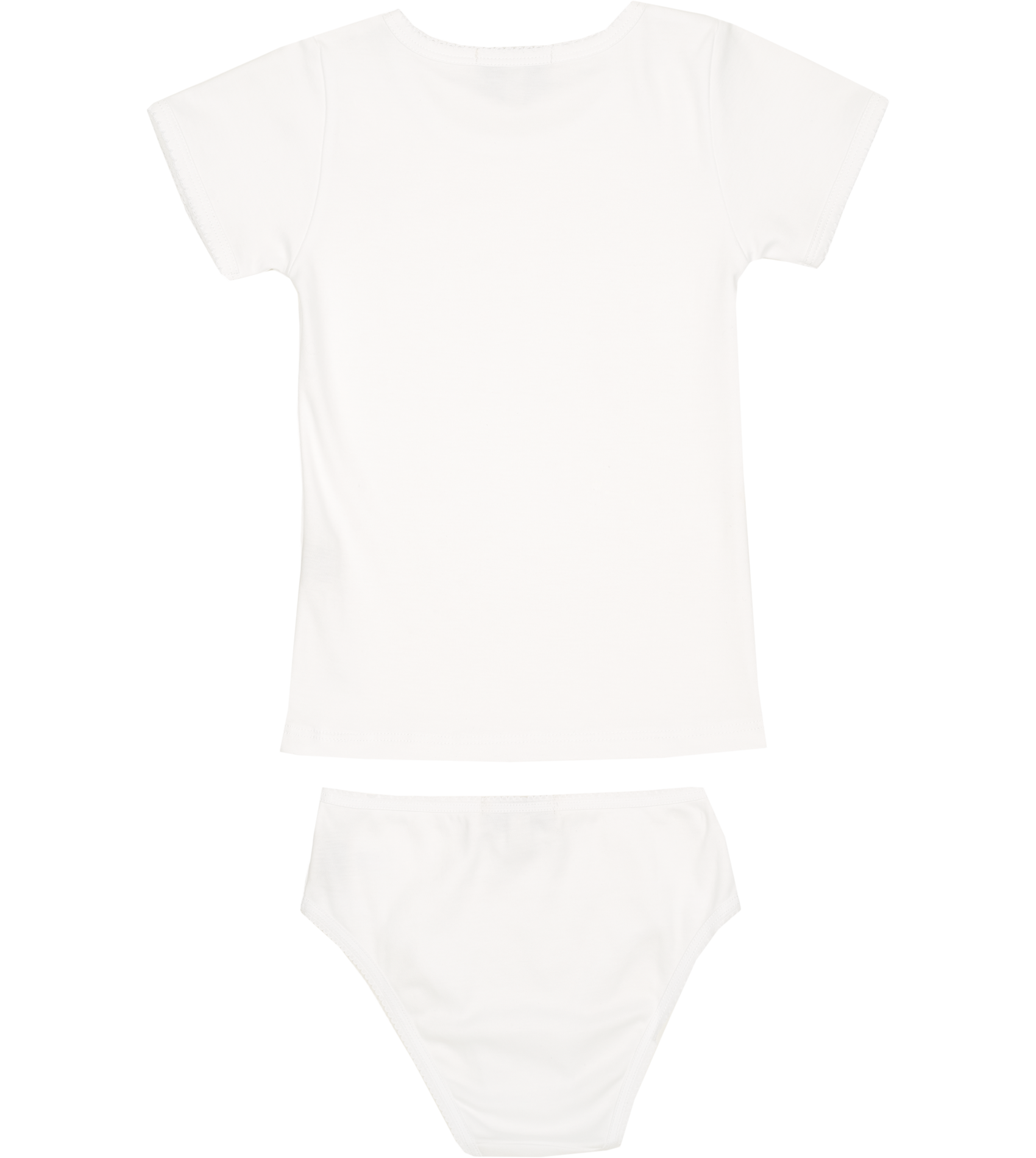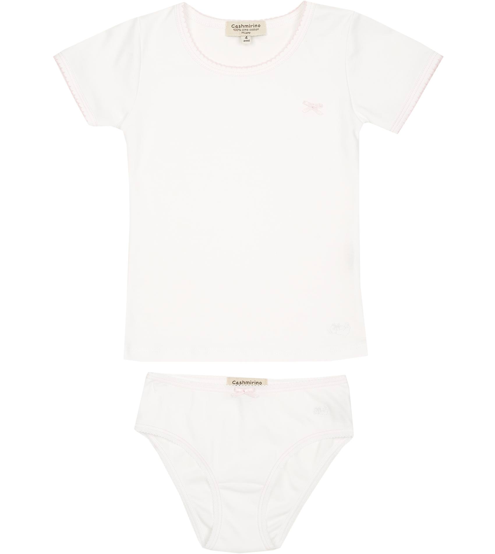 Pretty, comfortable and breathable cotton girl T-Shirt with matching pants set, featuring a delicate bow detail on the T-shirt and on the front of the pants. Perfect must-have pieces.