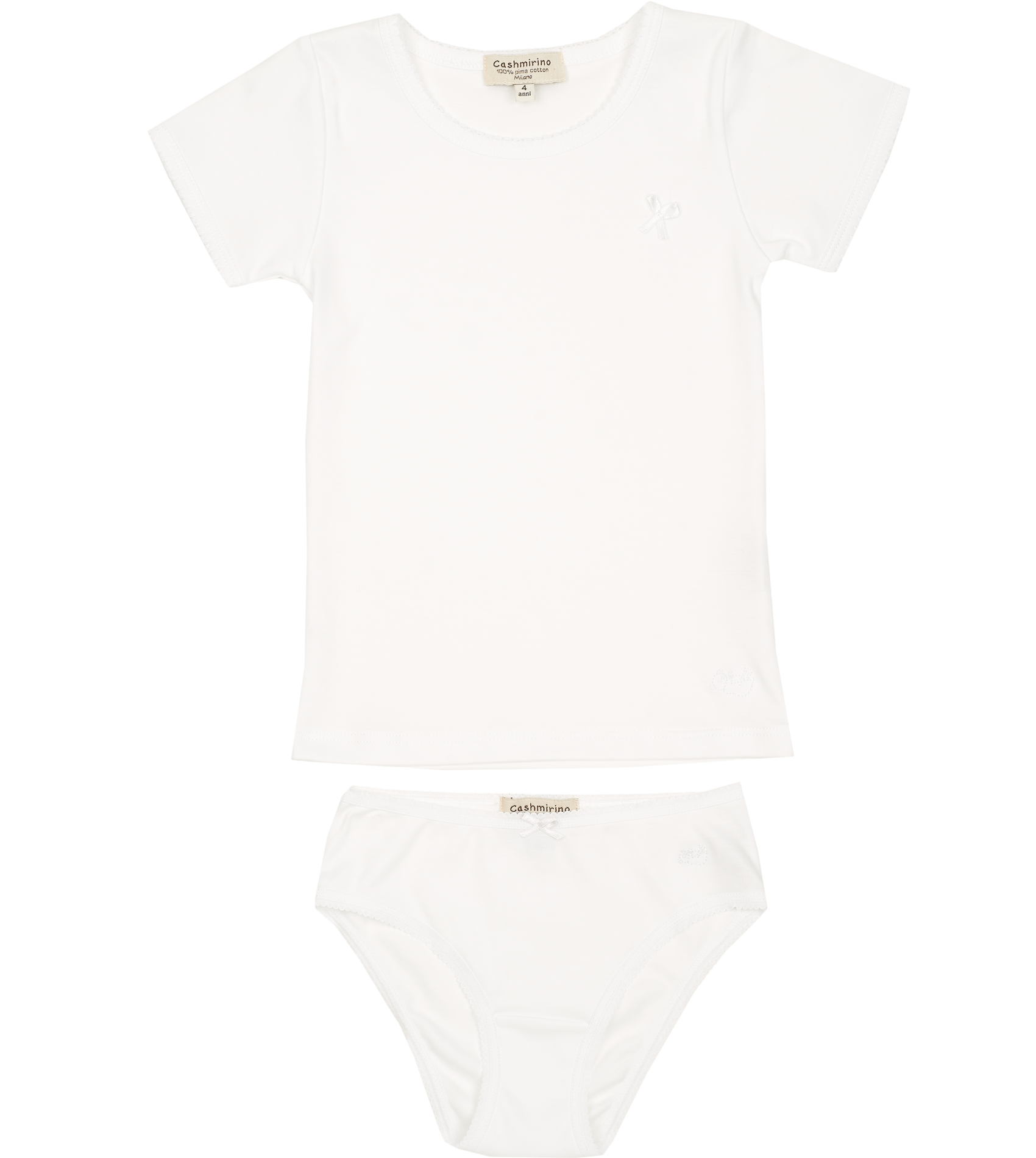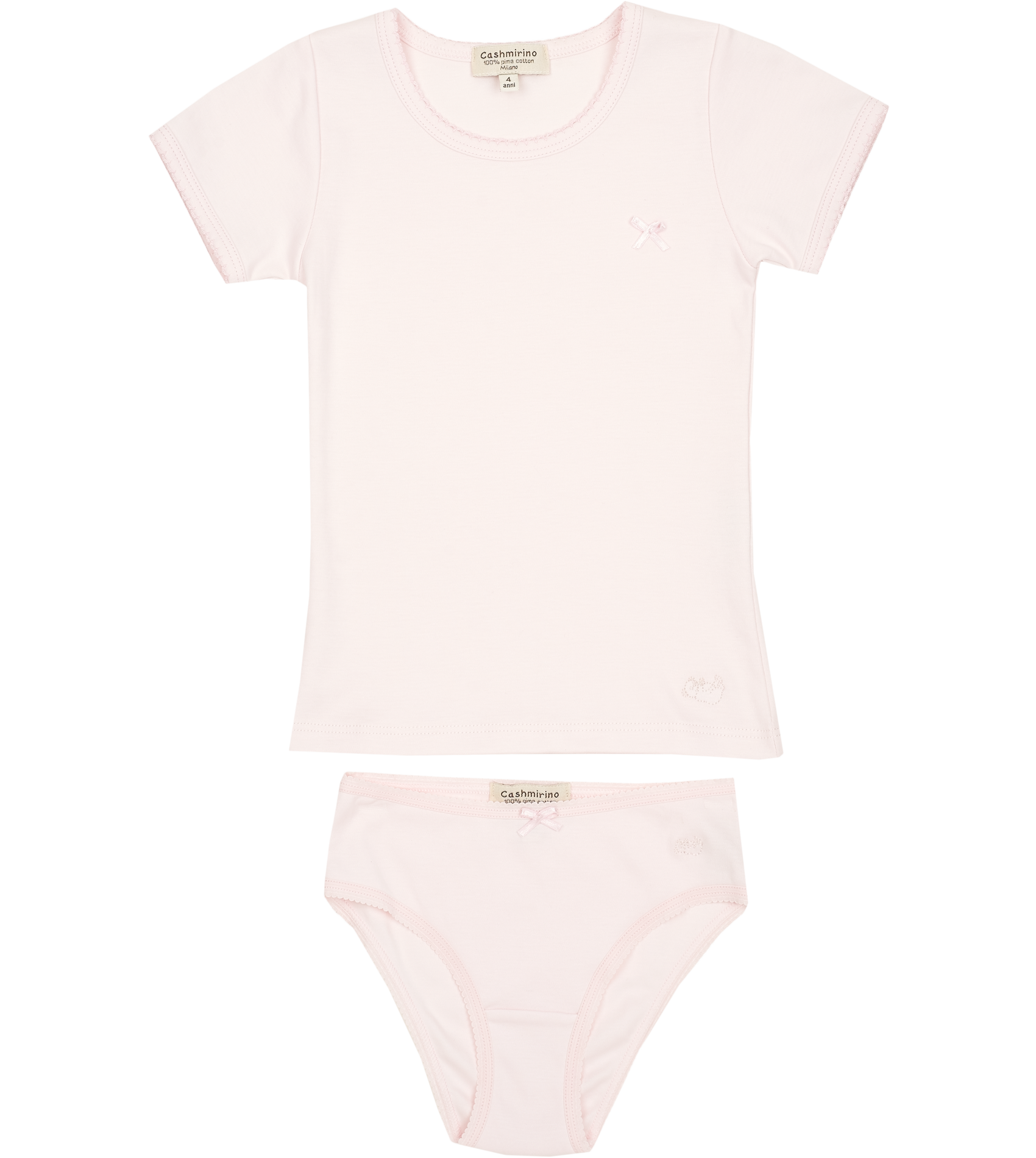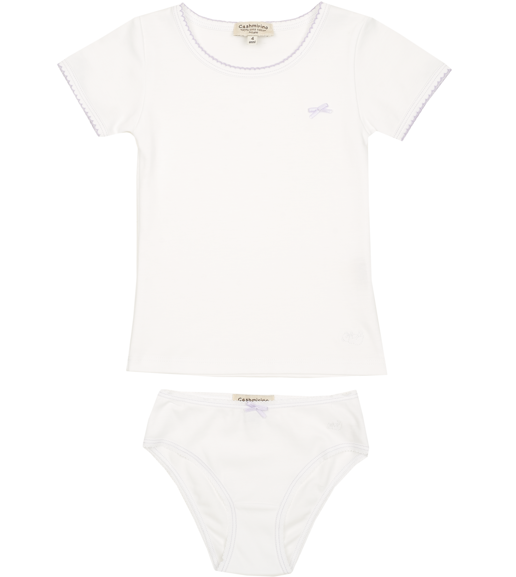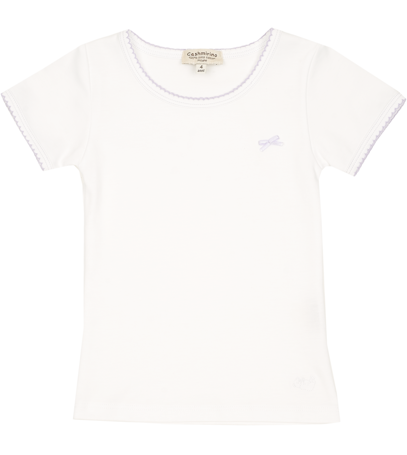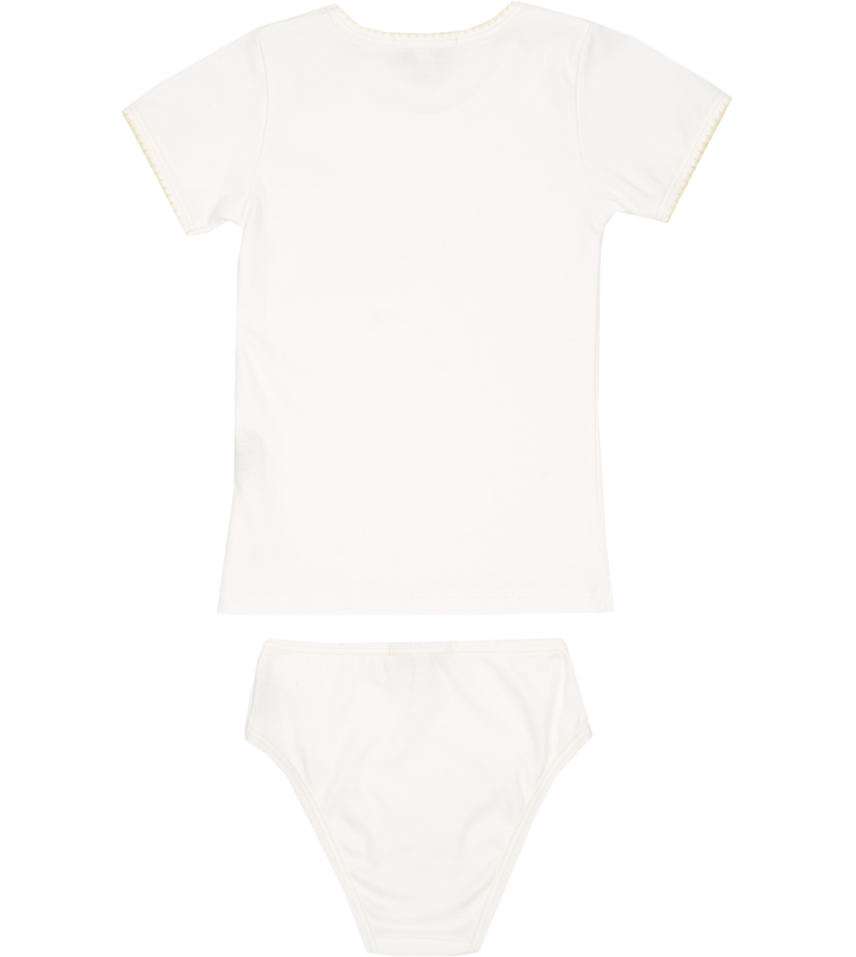 Pretty, comfortable and breathable cotton girl T-Shirt with matching pants set, featuring a delicate bow detail on the T-shirt and on the front of the pants. Perfect must-have pieces.