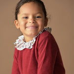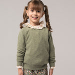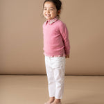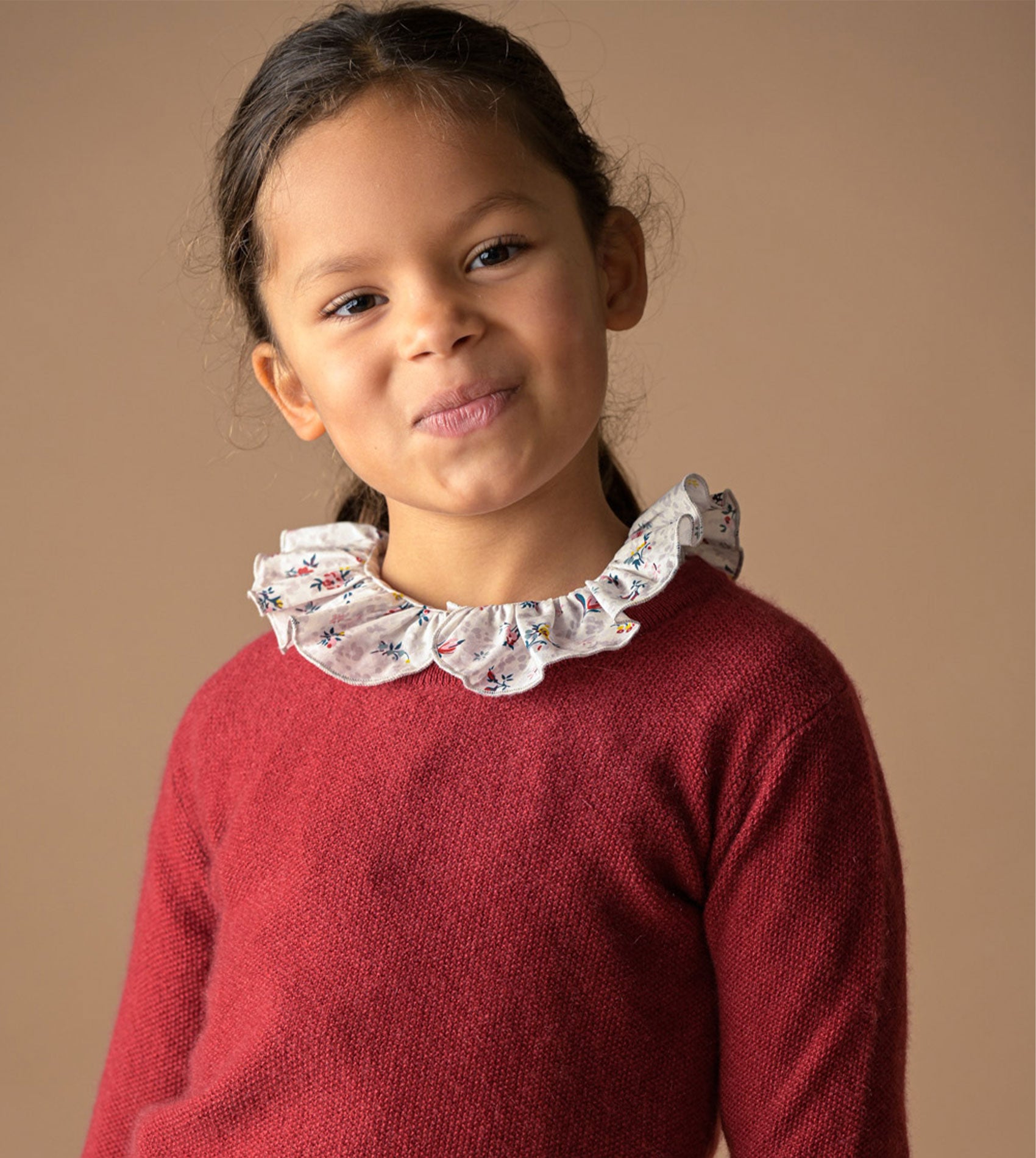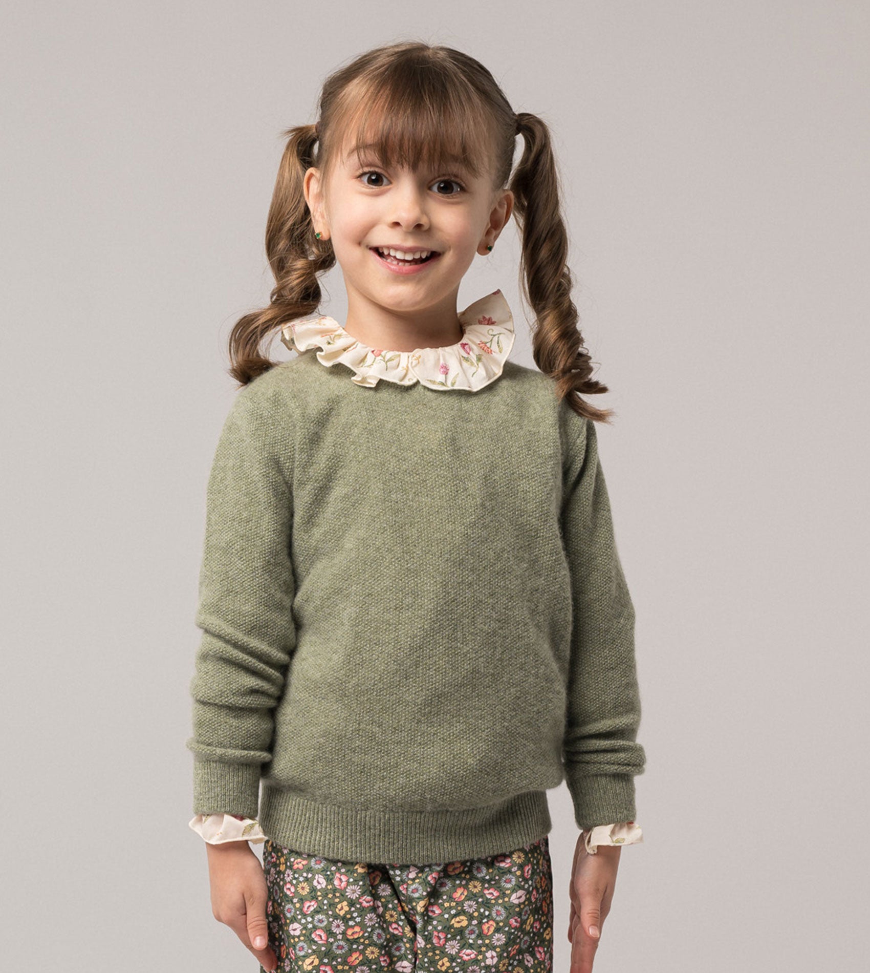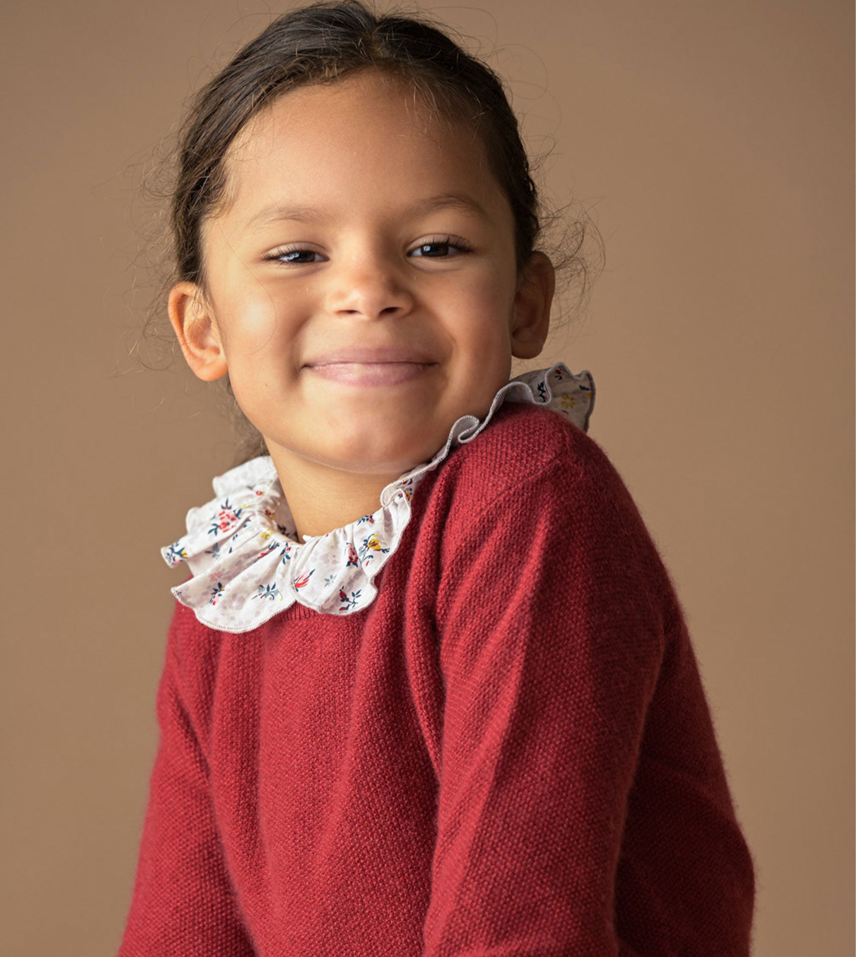 The Monica 100% Cashmere jumper is a bright addition to your little girl's wardrobe. Featuring a round neck with ribbed hem sleeves for a beautiful touch, a linen stitch for added depth and texture and a cute contrasting border on the borders of the jumper Designed for all-day comfort, this jumper is great for colder days. From watching the changing of the leaves to observing the first snowflakes falling to the ground, it’s a charming sight.