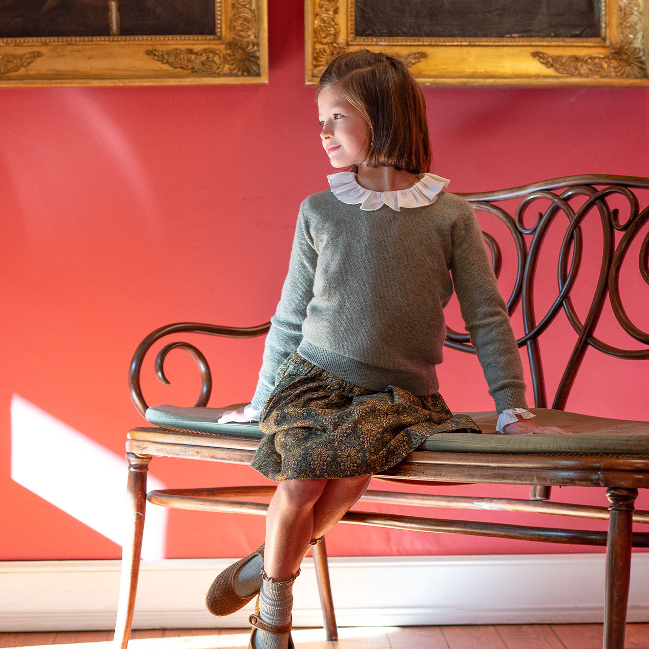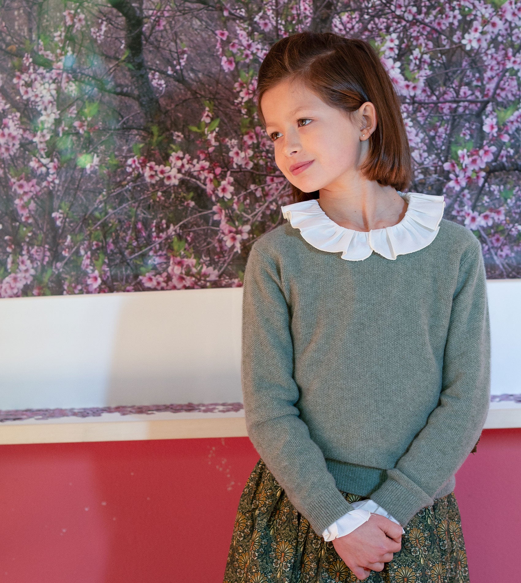 The Monica 100% Cashmere jumper is a bright addition to your little girl's wardrobe. Featuring a round neck with ribbed hem sleeves for a beautiful touch, a linen stitch for added depth and texture and a cute contrasting border on the borders of the jumper. Designed for all-day comfort, this jumper is great for colder days. From watching the changing of the leaves to observing the first snowflakes falling to the ground, it’s a charming sight.