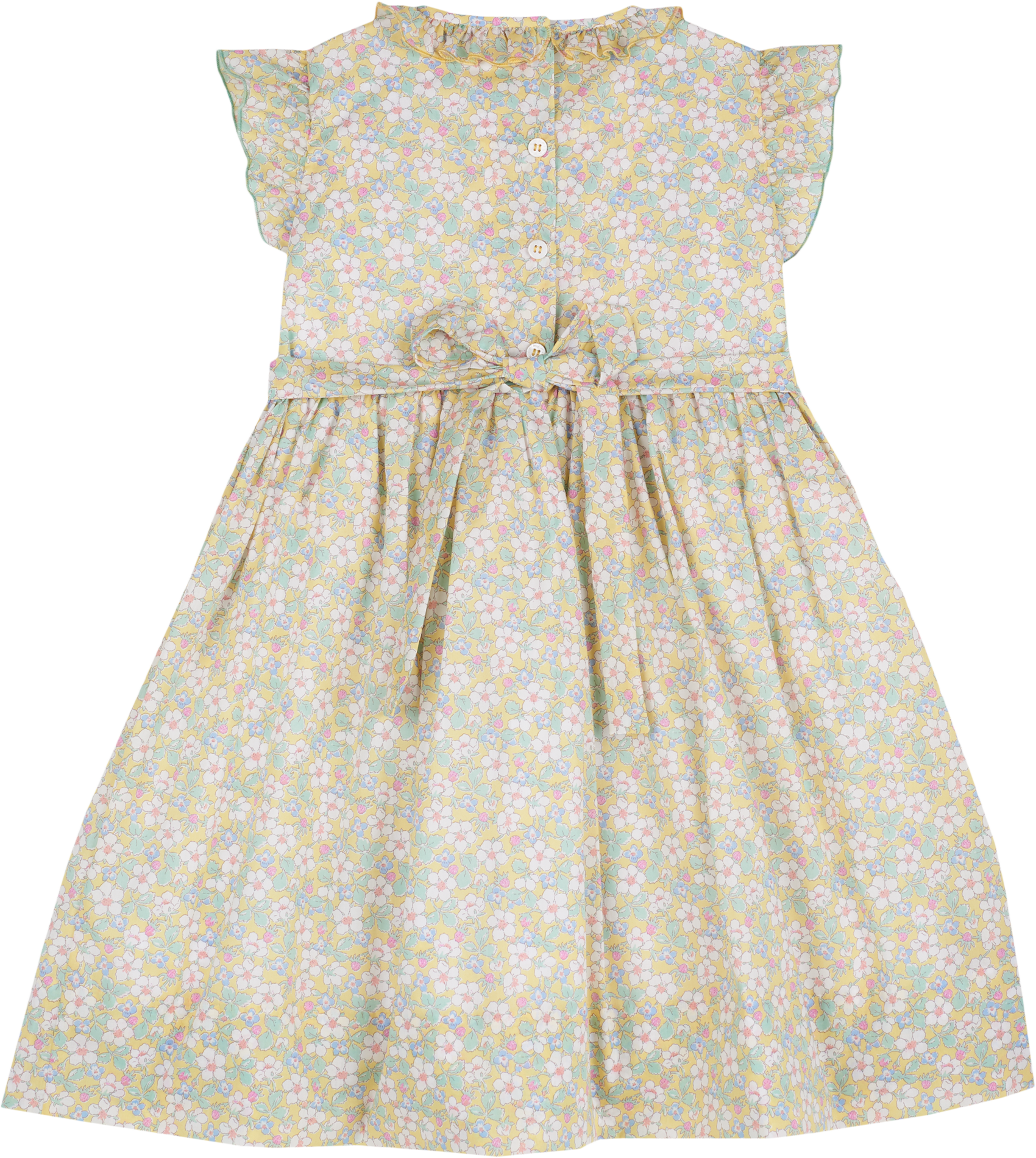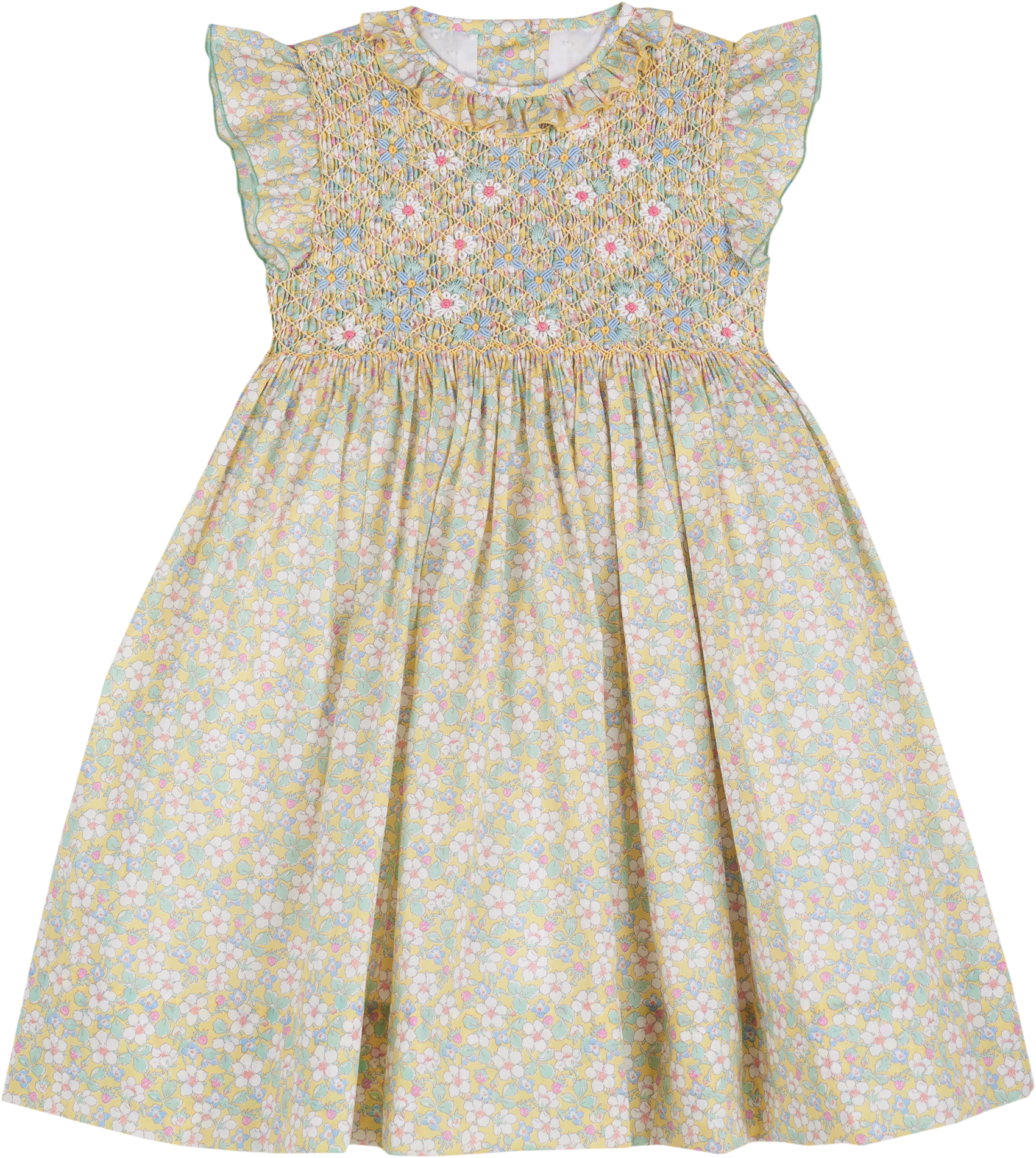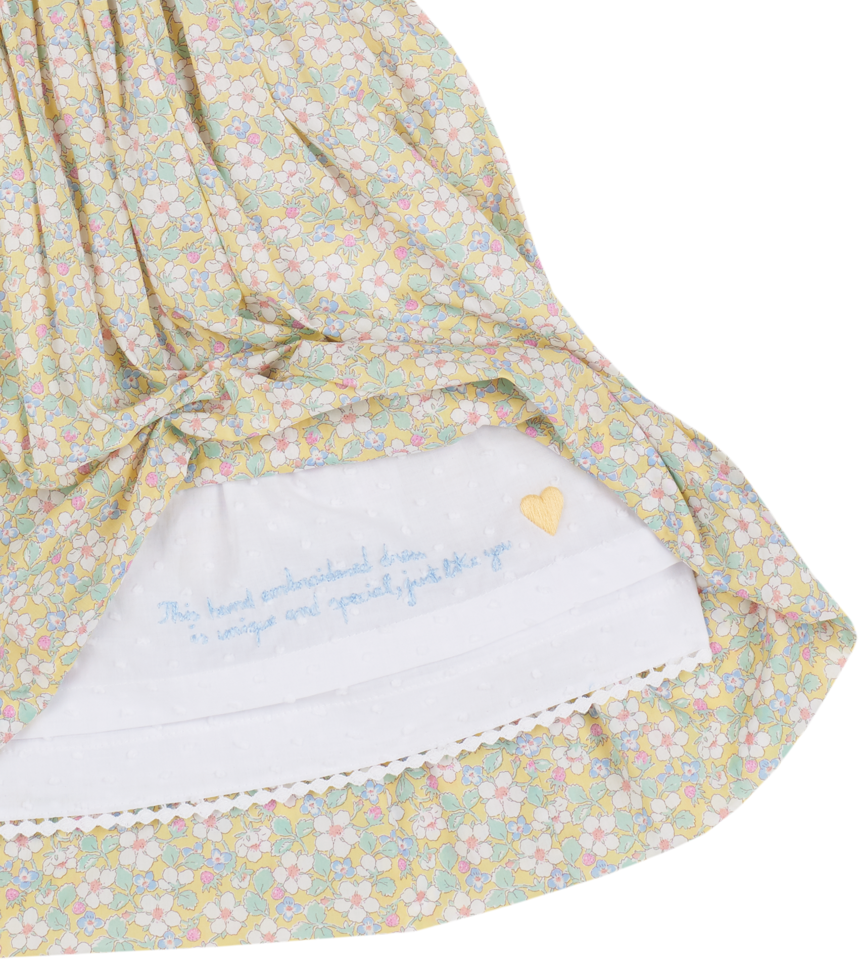 Adorned with delicate hand-smocking and floral embroidery, the Yvette is made with care, precision, and a touch of magic – a true celebration of traditional artistry. Its flutter sleeves, gently ruffled neckline, and full gathered skirt evoke the grace of a summer garden in bloom.