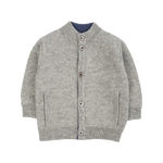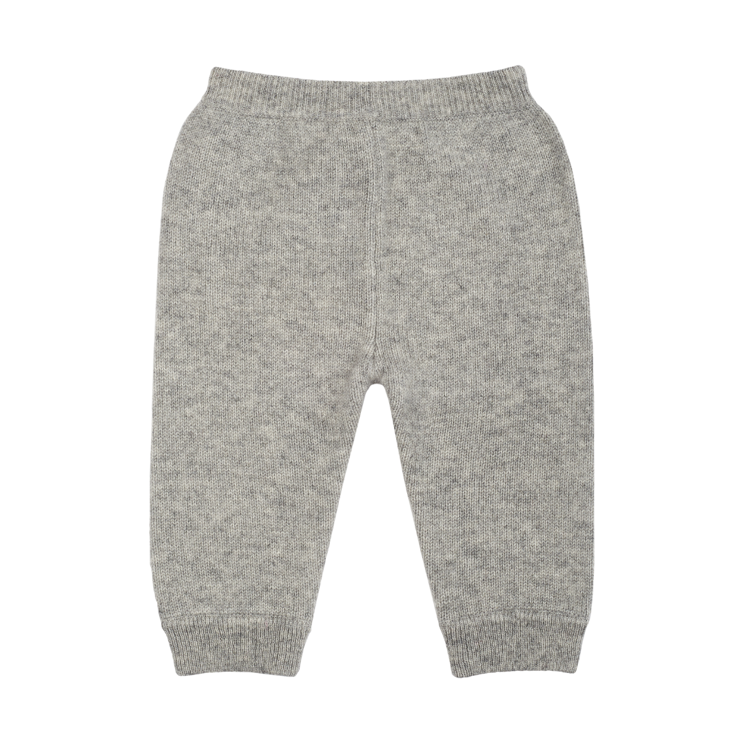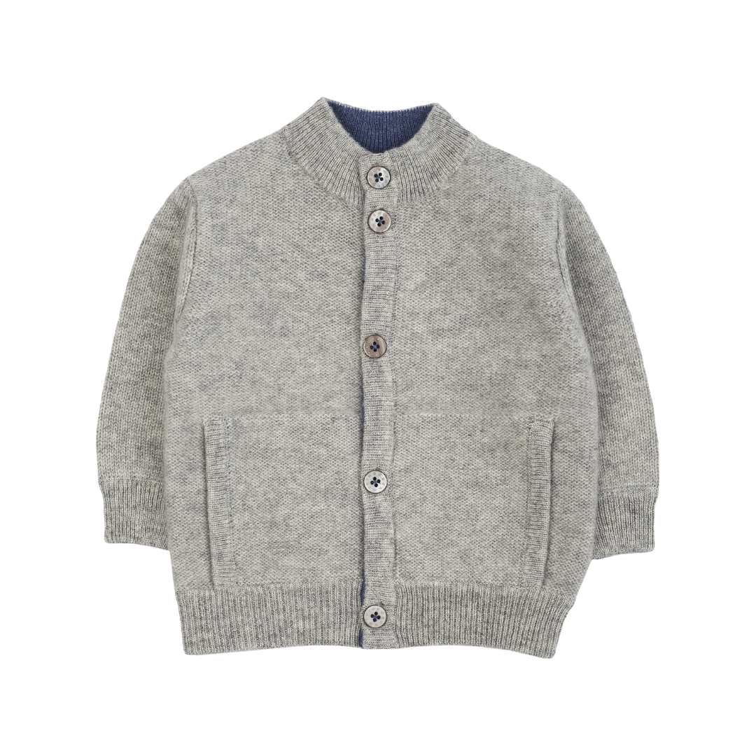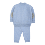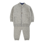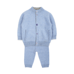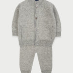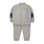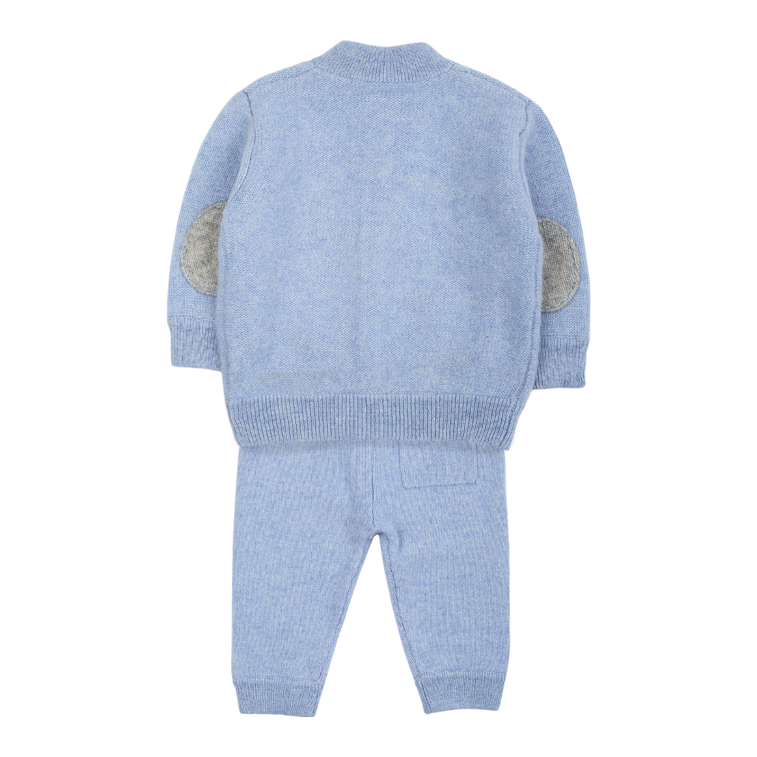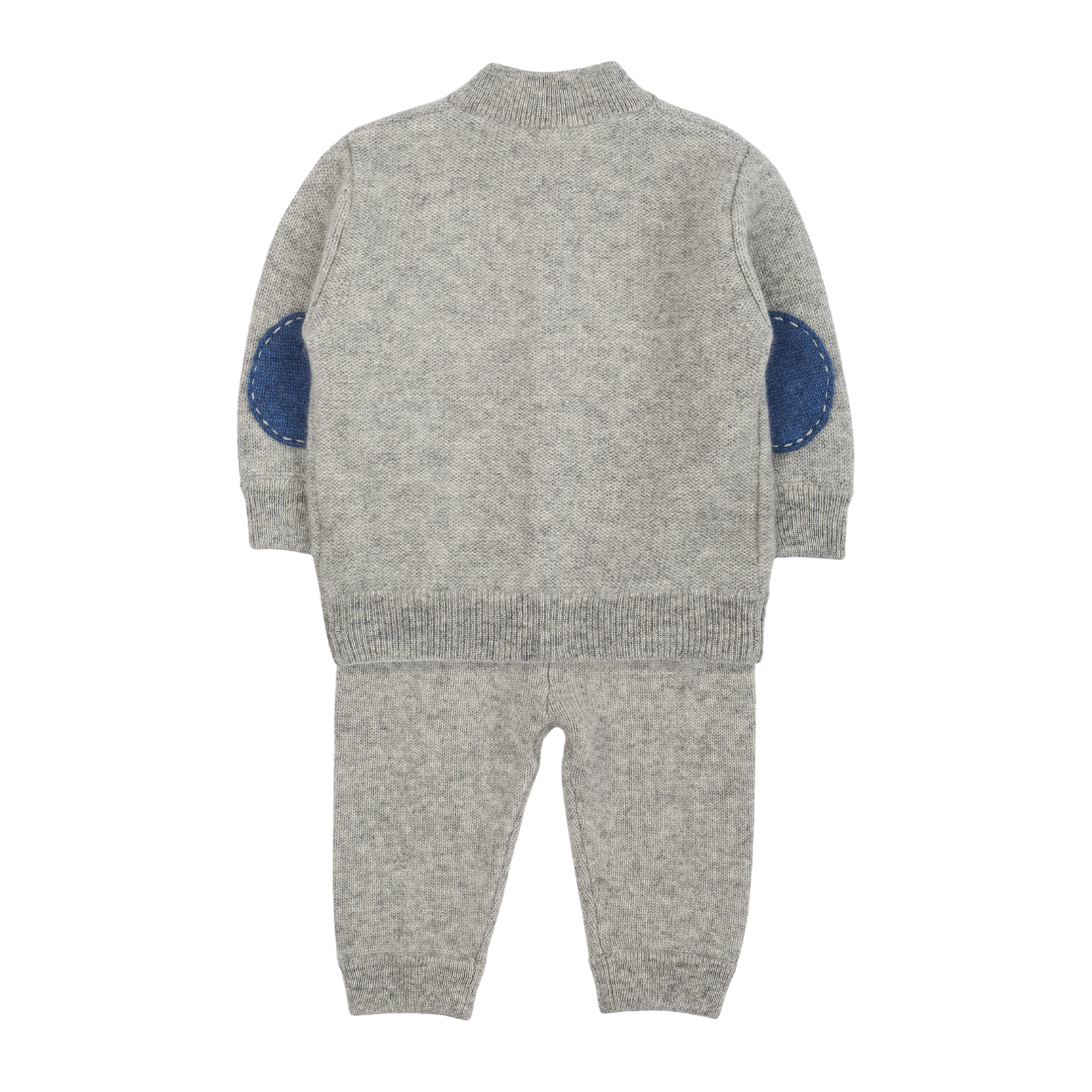 A complete Baby boy set which includes a stylish high neck cardigan and matching joggers. The high neck cardigan features contrasting elbow patches and internal borders. Made from 100% cashmere.