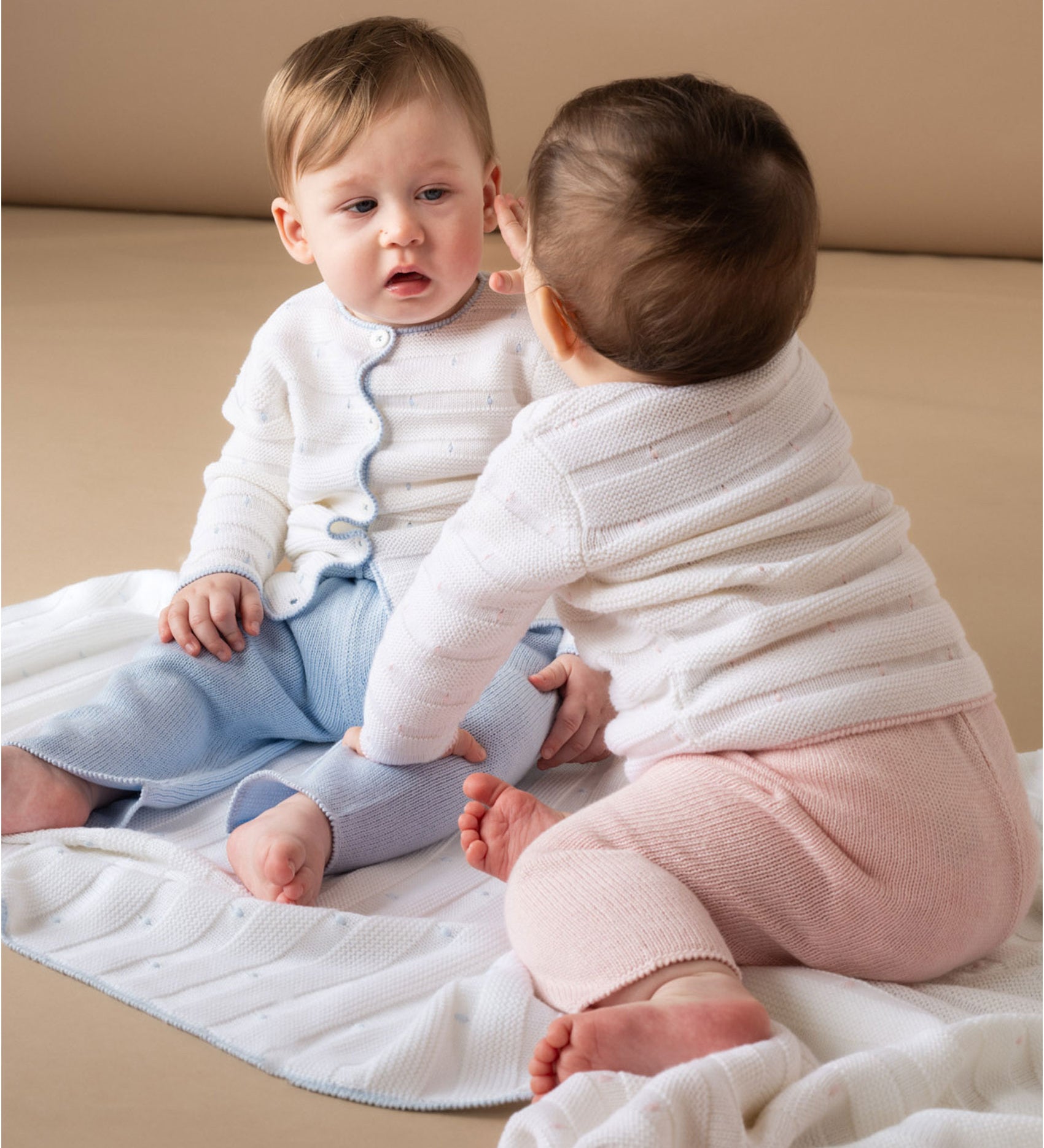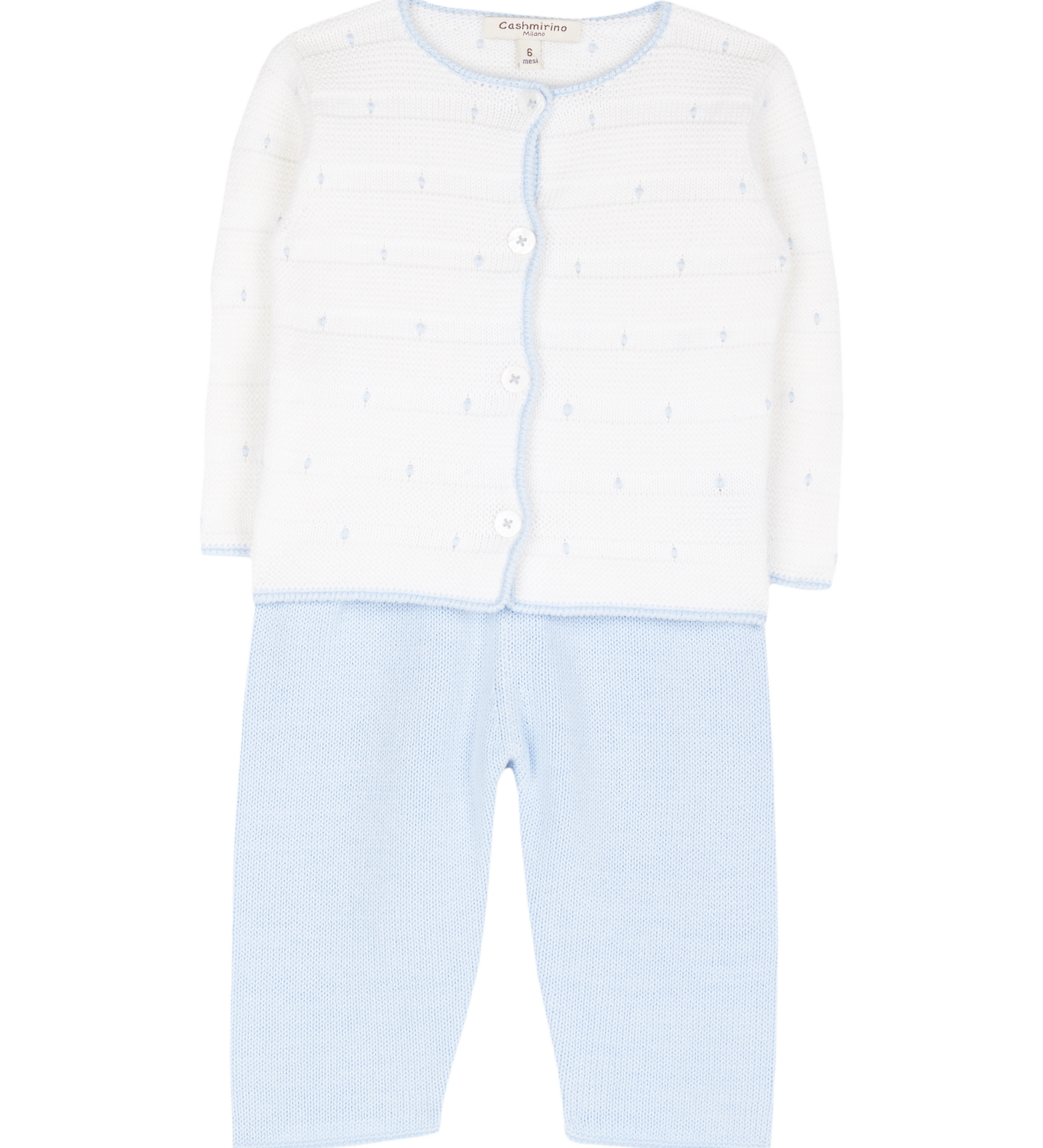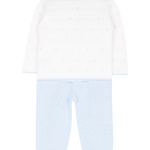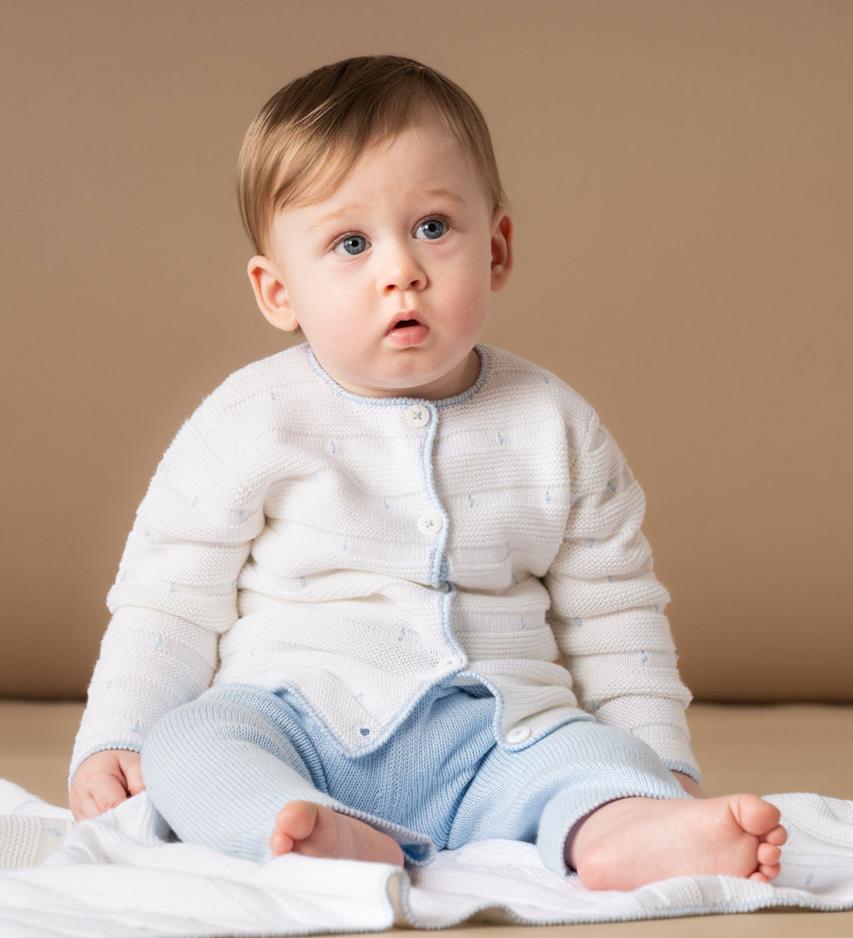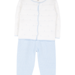 The Sol set is a beautifully crafted baby boy outfit, combining timeless style with everyday comfort. Knitted from the finest 100% cotton, the soft cardigan features delicate hand-embroidered baby blue polka dots on a classic white base, creating a playful yet elegant design. Matching cotton bottoms complete the look, designed for a snug and comfortable fit that allows freedom of movement.