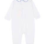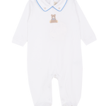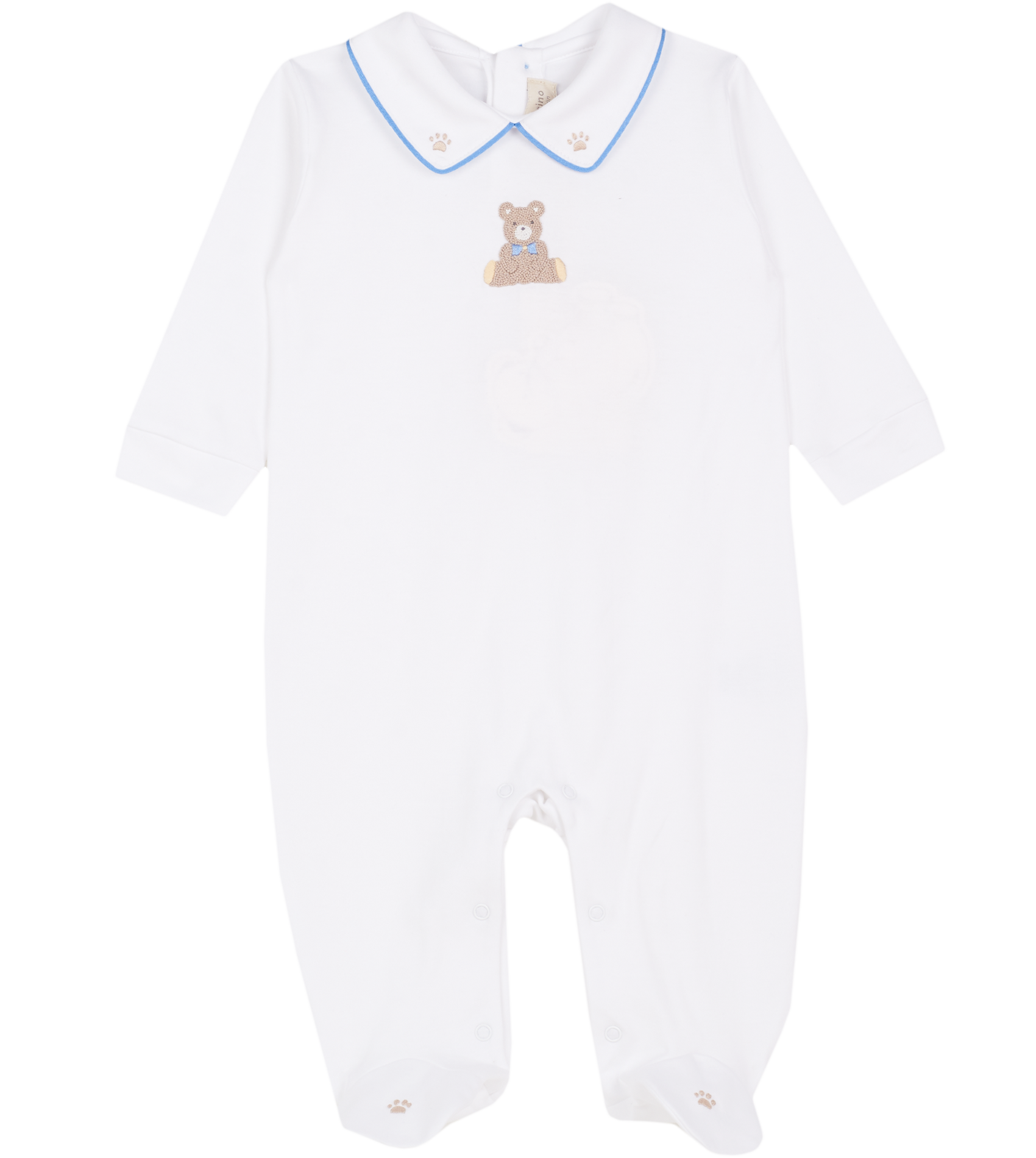 This adorable babygro features a sweet bear, lovingly embroidered by hand, showing our dedication to craftsmanship and care. With little teddy bear paws on their feet and collar, it's perfect for their crawling adventures and peaceful dreams at bedtime.