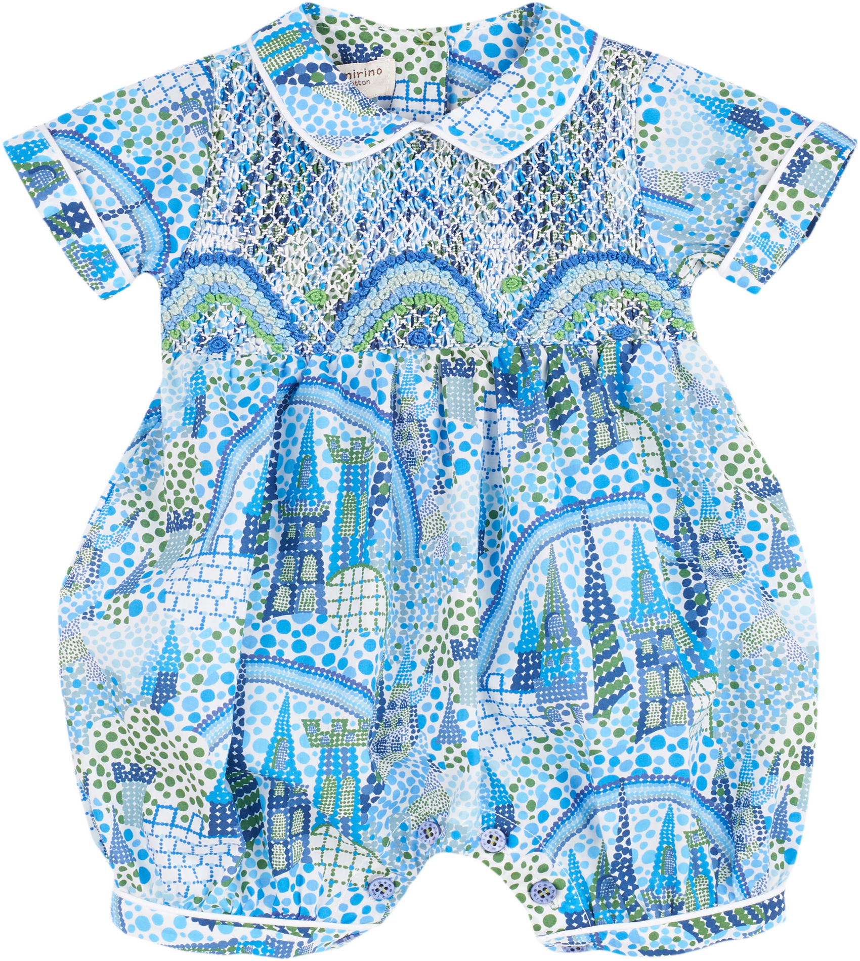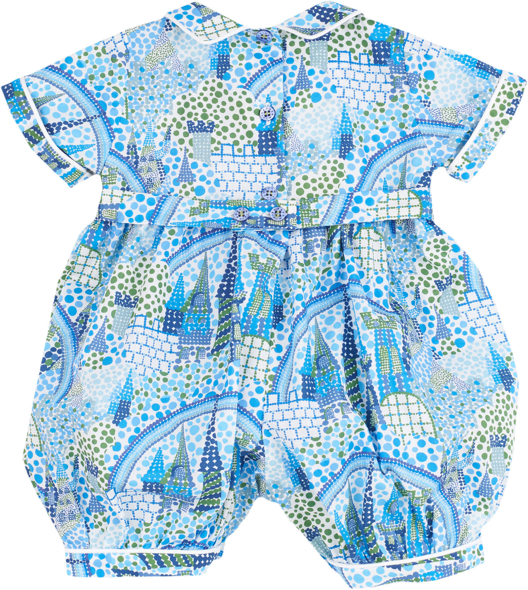 Inspired by the magical world of castles, this playtime printed cotton romper is perfect for your little boy. Featuring a Peter pan collar, short sleeves, balloon shorts and a button opening making it super easy to put on. The Aris romper also includes a back belt so that this adorable romper can grow with your baby. We adore the intricate hand embroidered rainbows on our classic smocked front panel, crafted by our talented artisans. Lightweight and breathable, it is a must-have staple. This piece is perfect for all occasions and is available in a variety of sizes.