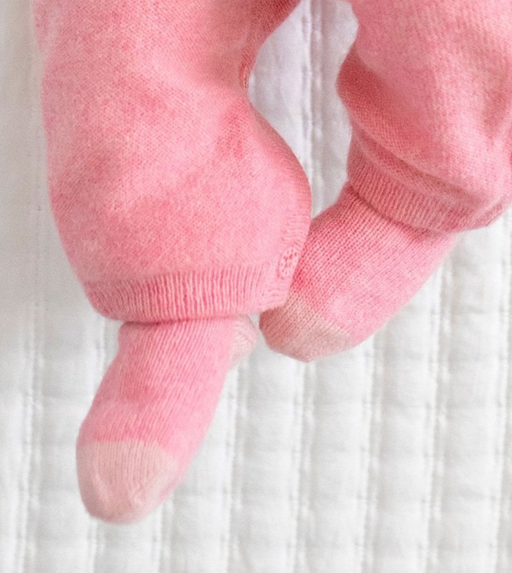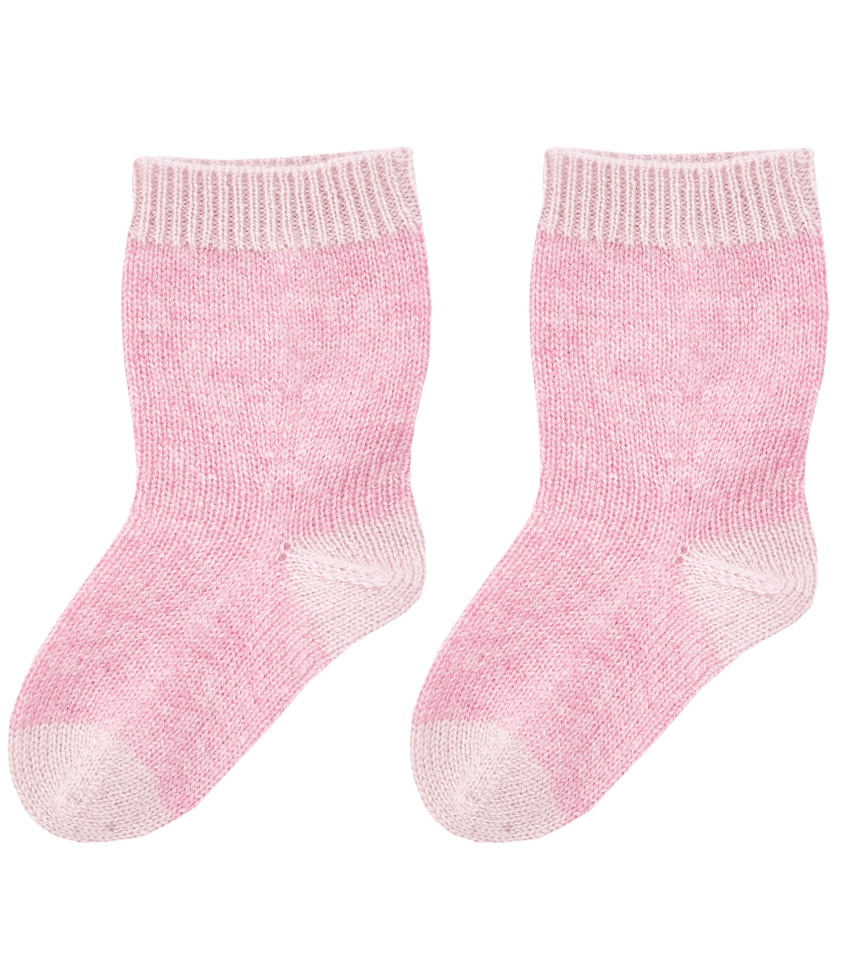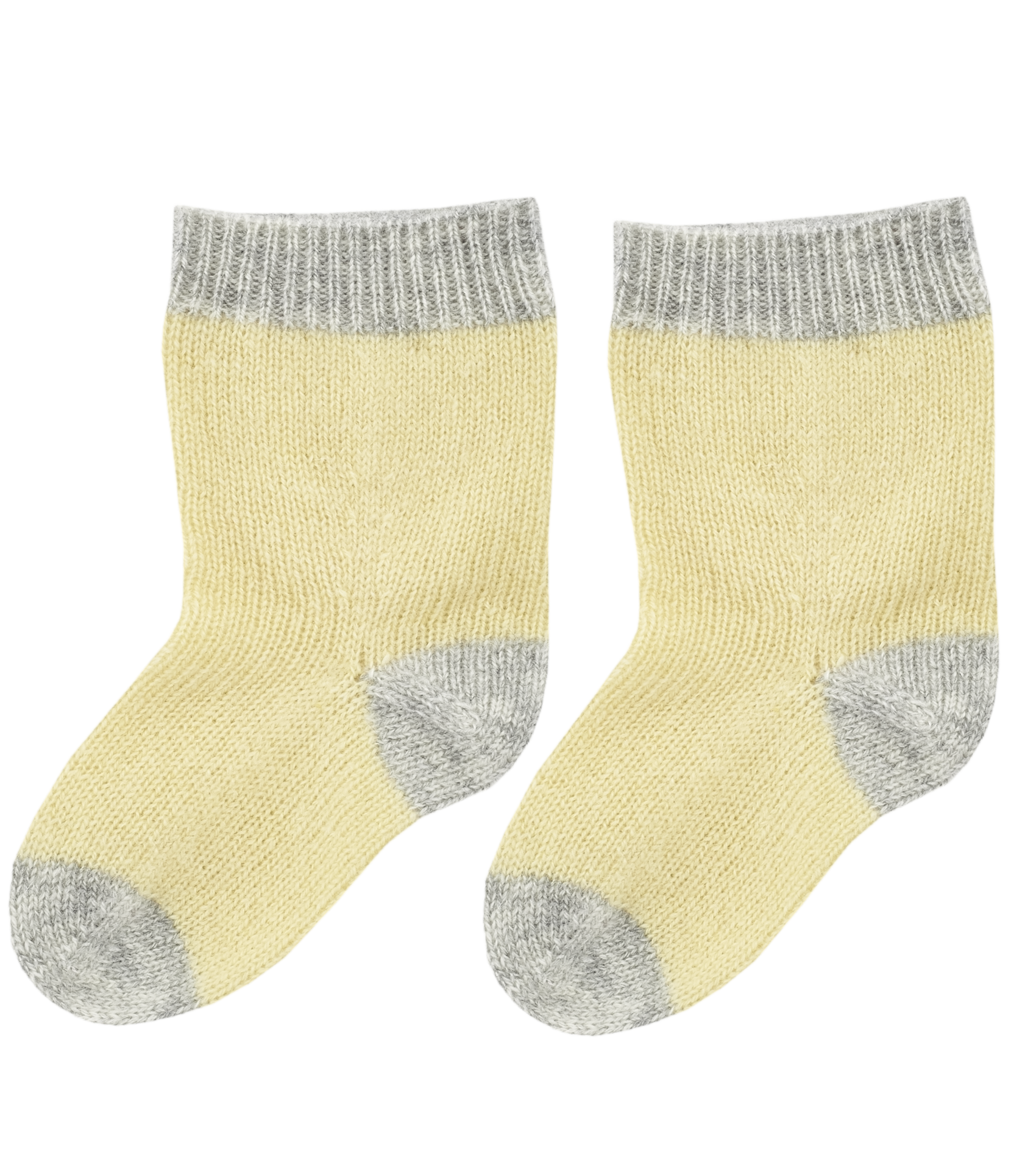 A pair of 100% cashmere Baby Girl socks featuring a contrasting heel, toe and hem. Ideal for keeping little feet warm and completing our comfortable outfits for children.