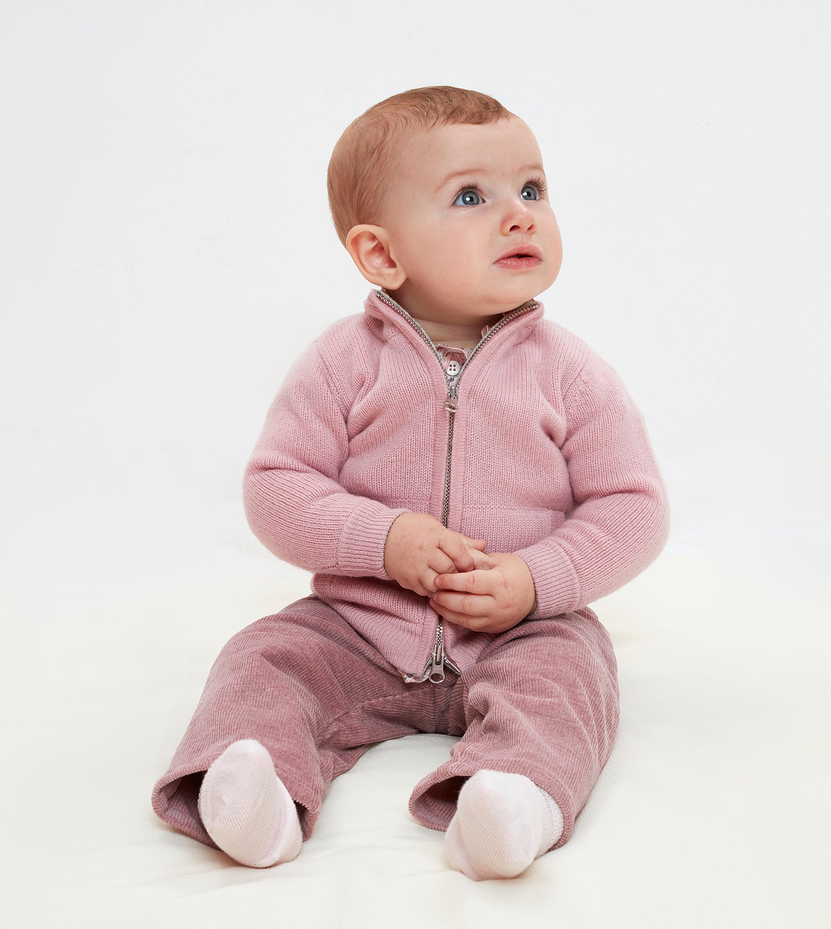 A stylish baby girl high neck cardigan with front pockets perfect for little explorers looking to collect shells and other natural treasures as well as stylish internal contrast and warm long sleeves. Made from 100% cashmere.