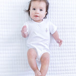 A white bodysuit for a baby girl with a small pink bear embroidery detail on the chest and subtle pink trim around the neckline.