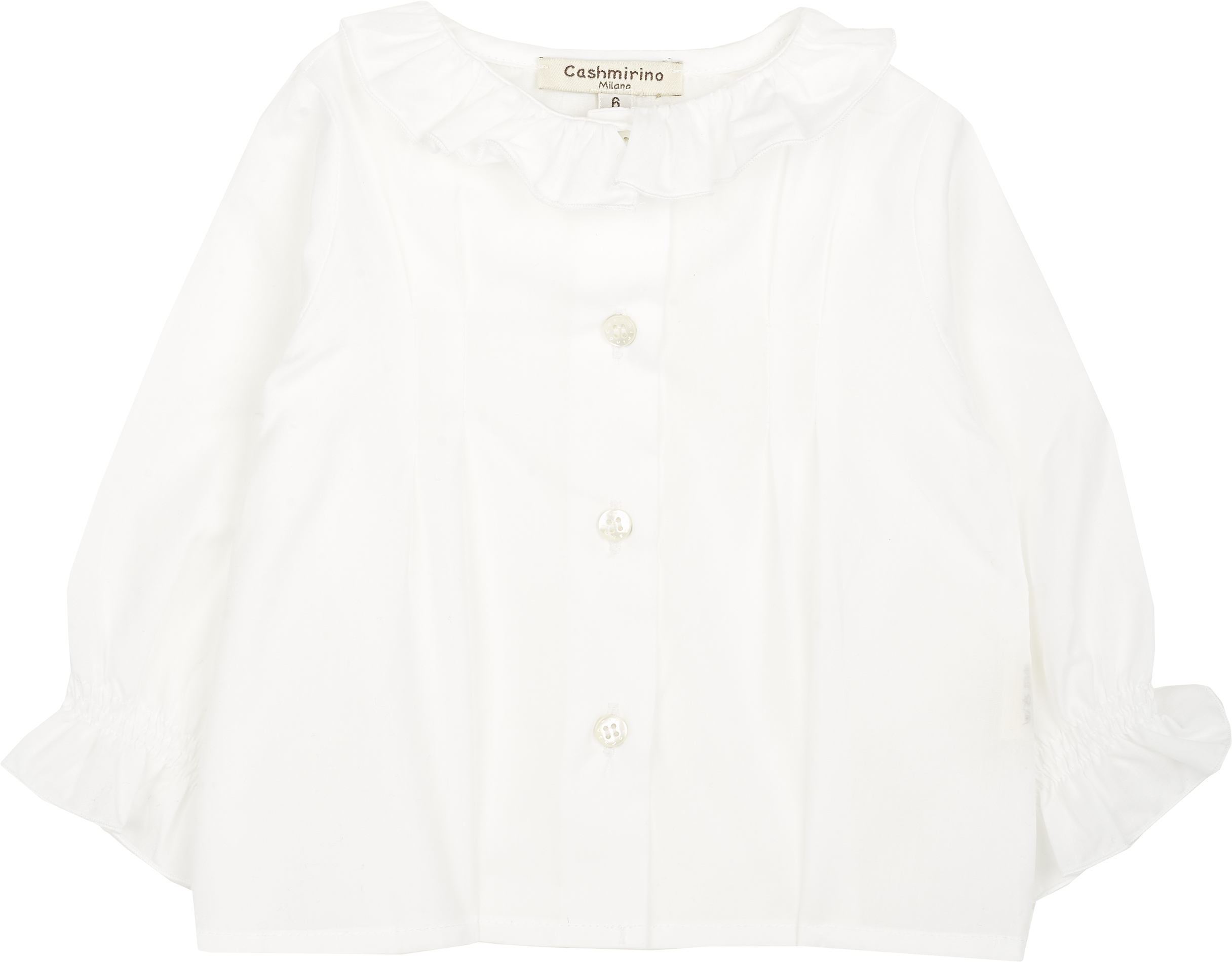 This stylish baby girl blouse made with Liberty fabrics, with a ruffle collar, ruffle long sleeves and pleats on the top chest. Signature Cashmirino buttons on the front.