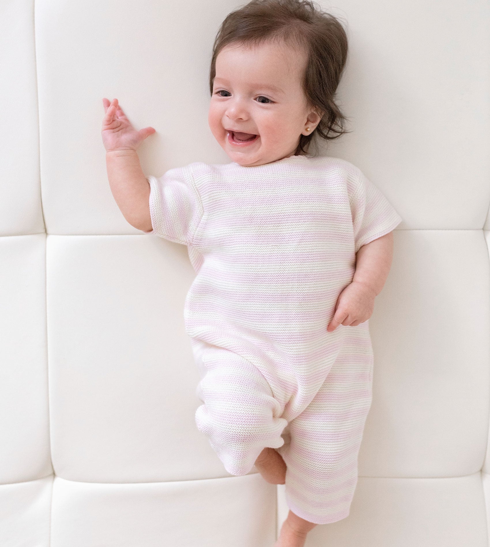 Keep your baby girl cosy and comfortable in this delightfully soft striped romper, thoughtfully designed for everyday ease and gentle warmth. One of our comfiest cotton outfits, it’s perfect for playtime, nap time, or outings.
